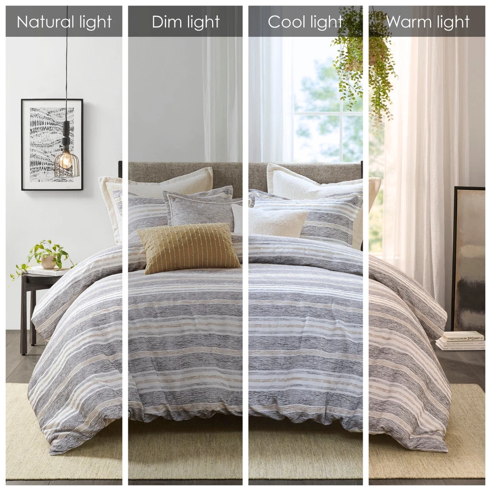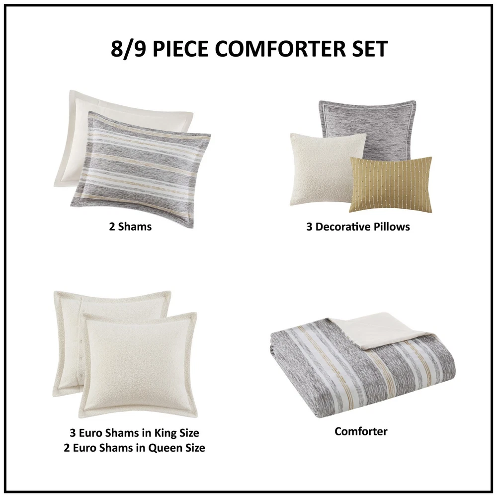 Madison Park Signature Oasis Oversized Chenille Jacquard Striped Comforter Set DESCRIPTION The Madison Park Signature Oasis oversized duvet-style comforter features a chenille jacquard stripe design in charcoal, dark golden yellow, and ivory for a casual, textured look. The bedding set includes 2 matching shams and 2 boucle Euro shams (3 in King size) that coordinate beautifully with the comforter. Plus, 3 decorative pillows with unique piping and embroidered details add the finishing touches, and have removable covers with hidden zippers for easy cleaning. This comforter uses a removable overfilled insert that is secured by inner ties and a hidden button closure, which provides no visible bartacking lines on top of the bed to create a smooth, clean look. The hypoallergenic polyester filling in the removable insert contains no allergens and is treated to be dustproof so you can sleep comfortably. Dry clean comforter cover only and machine wash comforter filler. FEATURES • Set includes comforter, 2 shams, 2 euro shams (3 in King size), 2 square and 1 oblong throw pillows (removable cover, hidden zipper closure) • Casual textured chenille jacquard stripe design gives the bed texture and dimension • Features stripes in charcoal, dark golden yellow, and ivory colors • Includes boucle euro shams that adds interest and texture to the bedding set • Decorative throw pillows with unique piping and embroidered details that tie together with the bed • Oversized and overfilled comforter with removable insert (included), inner ties, and hidden button closure for easy cleaning and keep warm • Duvet style comforter insert, no visible bartacking lines seen on top of the bed • Dry clean comforter cover and machine washable comforter filler (see wash label) • Commercial washer and dryer recommended to provide ample room for movement MATERIAL Comforter/Sham: 60% Cotton, 40% Polyester, jacquard Reverse: 100% Cotton solid Filling: 100% Polyester Available Sizes: Full/Queen Comforter Set includes: 1 Comforter: 92"W x 96"L 2 Standard Shams: 20"W x 26"L + 1.5"D 2 Euro Shams: 26"W x 26"L + 1.5"D 1 Throw Pillow: 20"W x 20"L 1 Throw Pillow: 18"W x 18"L 1 Throw Pillow: 14"W x 20"L King/California King Comforter Set includes: 1 Comforter: 110"W x 96"L 2 King Shams: 20"W x 36"L + 1.5"D 3 Euro Shams: 26"W x 26"L + 1.5"D 1 Throw Pillow: 20"W x 20"L 1 Throw Pillow: 18"W x 18"L 1 Throw Pillow: 14"W x 20"L