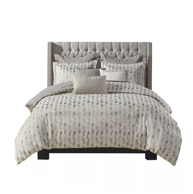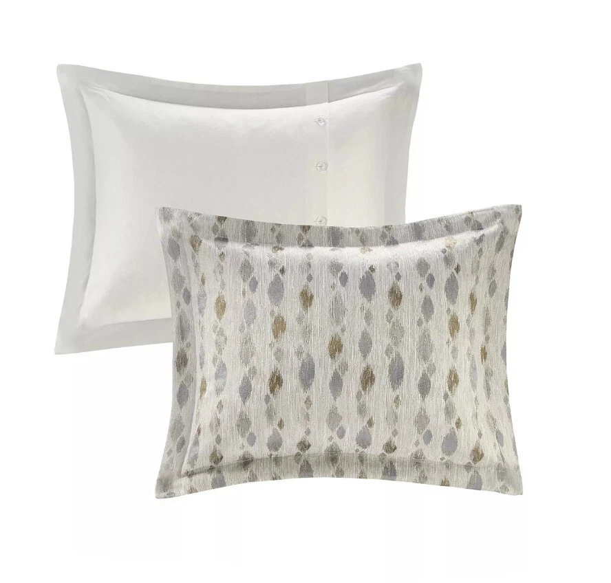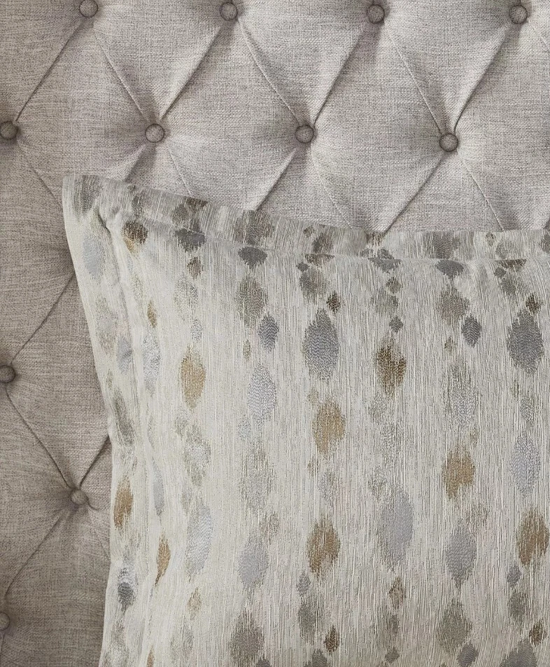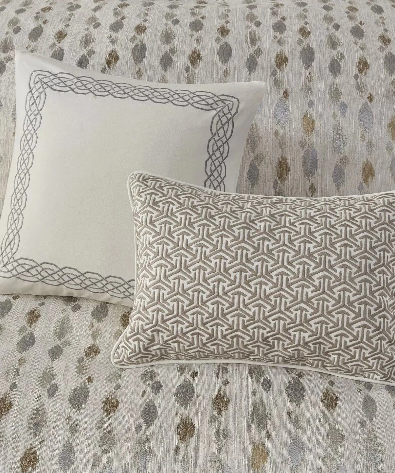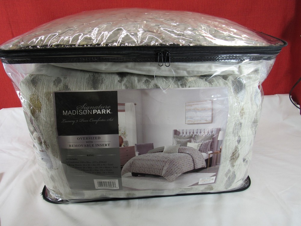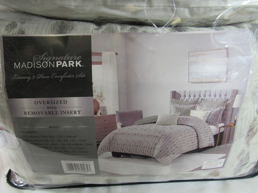 Madison Park Signature Sanctuary 9-Pc.Comforter Set King T4103714 Retail $710 It offers a luxurious update to your bedroom decor. It features all-over symmetric diamond shapes, in neutral hues, with slubbed yarns that create a rich texture and modern look. King comforter dimensions- 110" L x 96" W King shams dimensions- 20" L x 36" W Euro shams dimensions- 26" L x 26" W 2 Decorative pillows dimensions- 20" L x 20" W Decorative pillows dimensions- 14" L x 20" W Set includes 1 comforter, 2 shams, 3 Euro shams, 3 decorative pillows Oversized and overfilled comforter with removable insert and button closure Embroidery details on the decorative pillows, hidden zipper pillow cover for easy care Prevent from allergies polyester filling in the comforter and decorative pillows Comforter- Polyester Jacquard with Polyester Filling, Sham and Pillows- Cotton Faux Linen, Pillows with Polyester Filling Machine Washable Imported