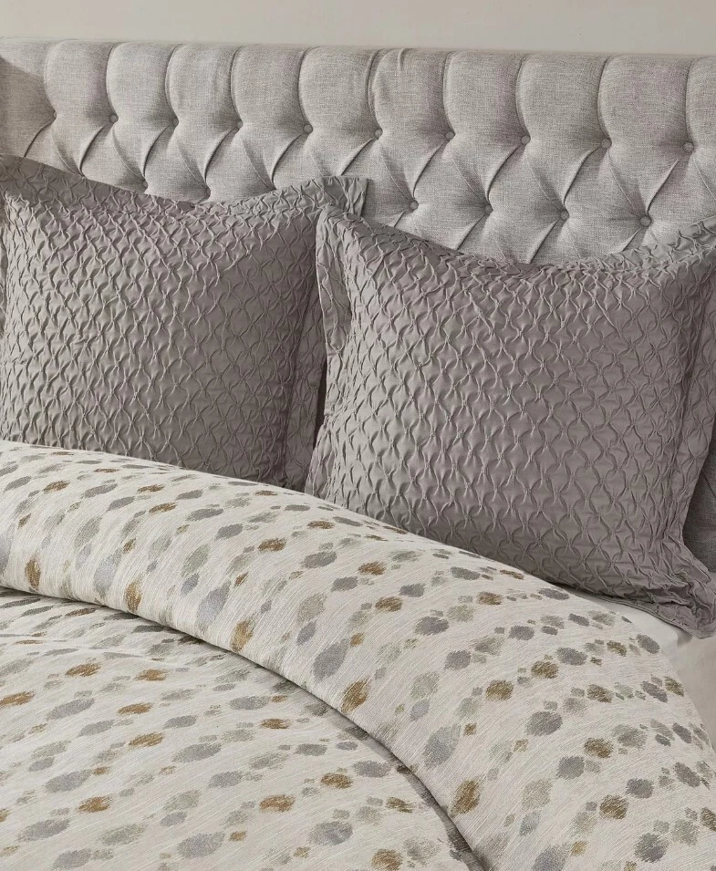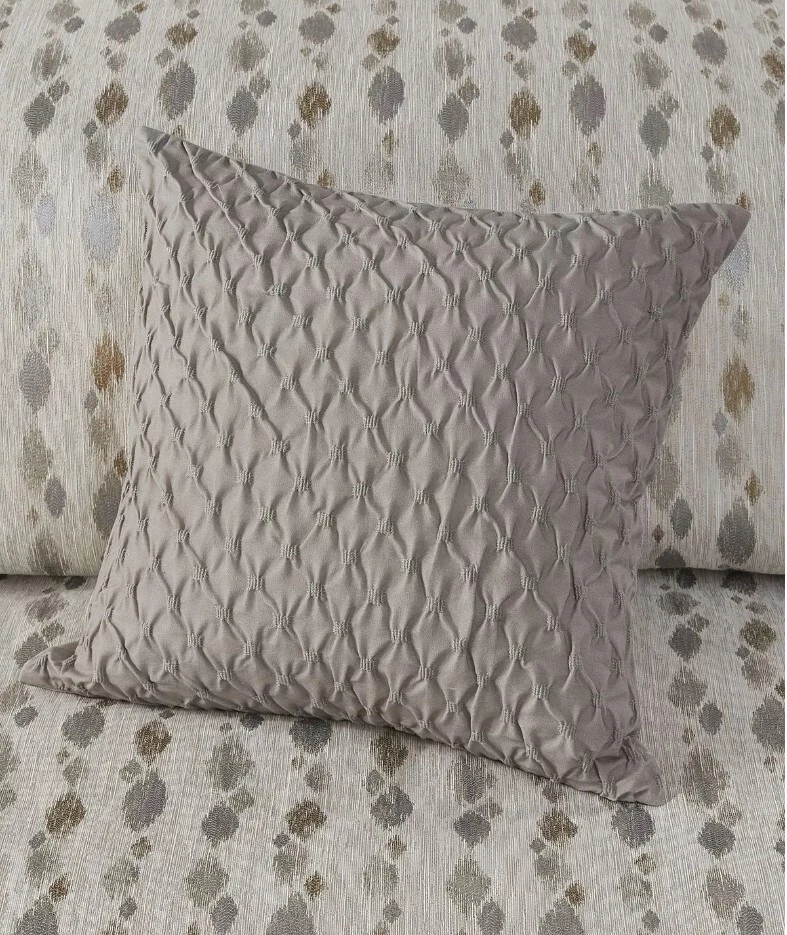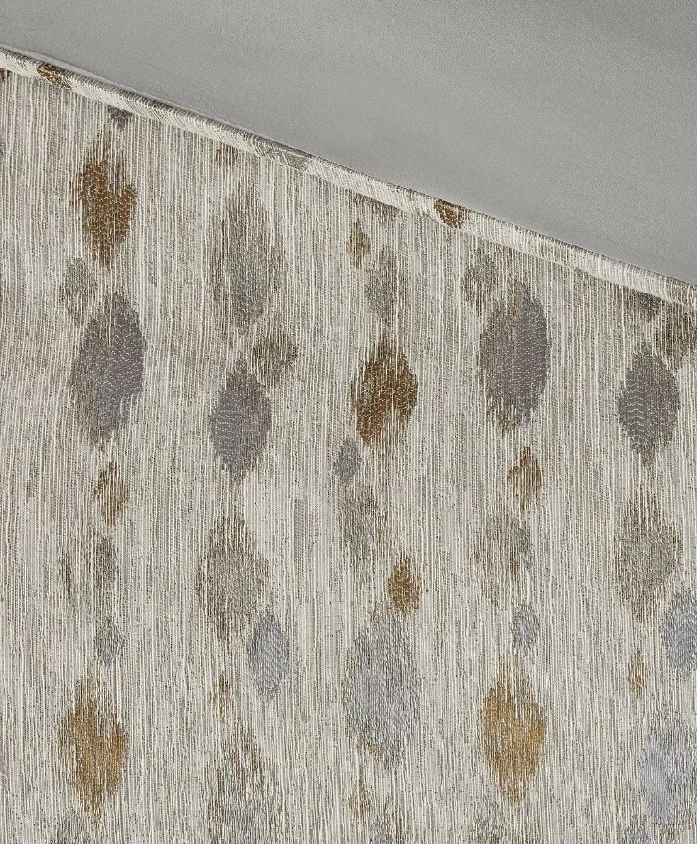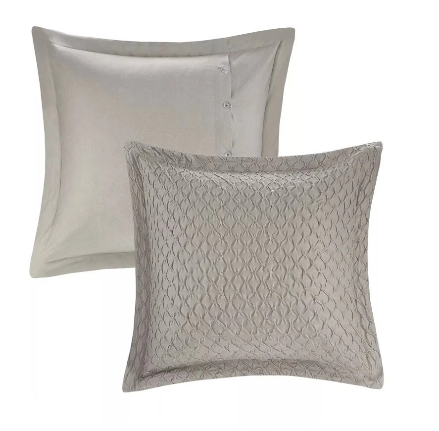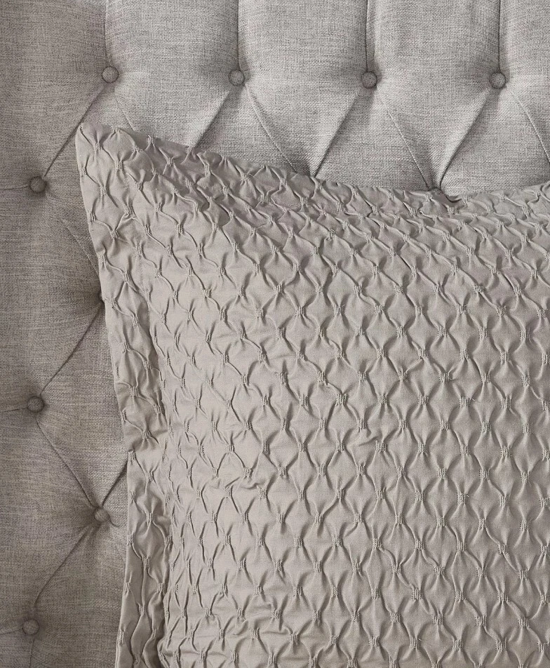 Madison Park Signature Sanctuary 9-Pc.Comforter Set King T4103714 Retail $710 It offers a luxurious update to your bedroom decor. It features all-over symmetric diamond shapes, in neutral hues, with slubbed yarns that create a rich texture and modern look. King comforter dimensions- 110" L x 96" W King shams dimensions- 20" L x 36" W Euro shams dimensions- 26" L x 26" W 2 Decorative pillows dimensions- 20" L x 20" W Decorative pillows dimensions- 14" L x 20" W Set includes 1 comforter, 2 shams, 3 Euro shams, 3 decorative pillows Oversized and overfilled comforter with removable insert and button closure Embroidery details on the decorative pillows, hidden zipper pillow cover for easy care Prevent from allergies polyester filling in the comforter and decorative pillows Comforter- Polyester Jacquard with Polyester Filling, Sham and Pillows- Cotton Faux Linen, Pillows with Polyester Filling Machine Washable Imported
