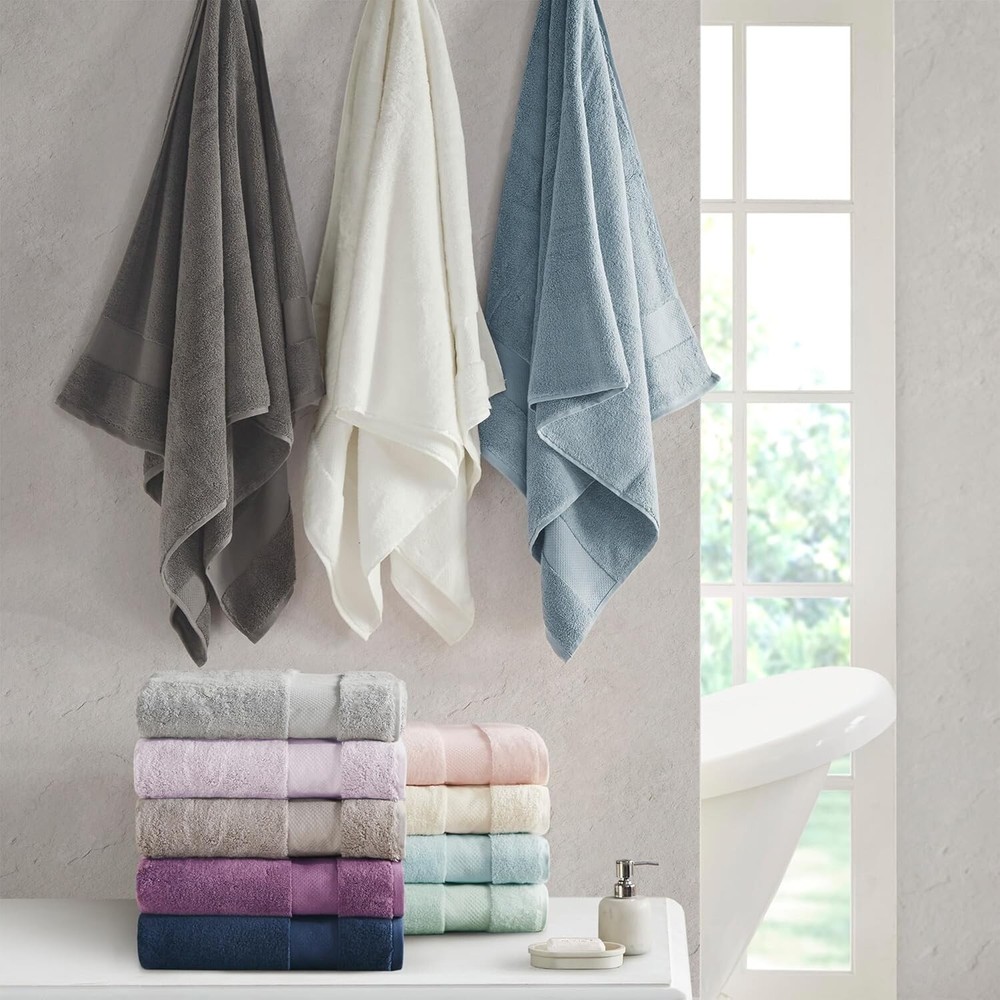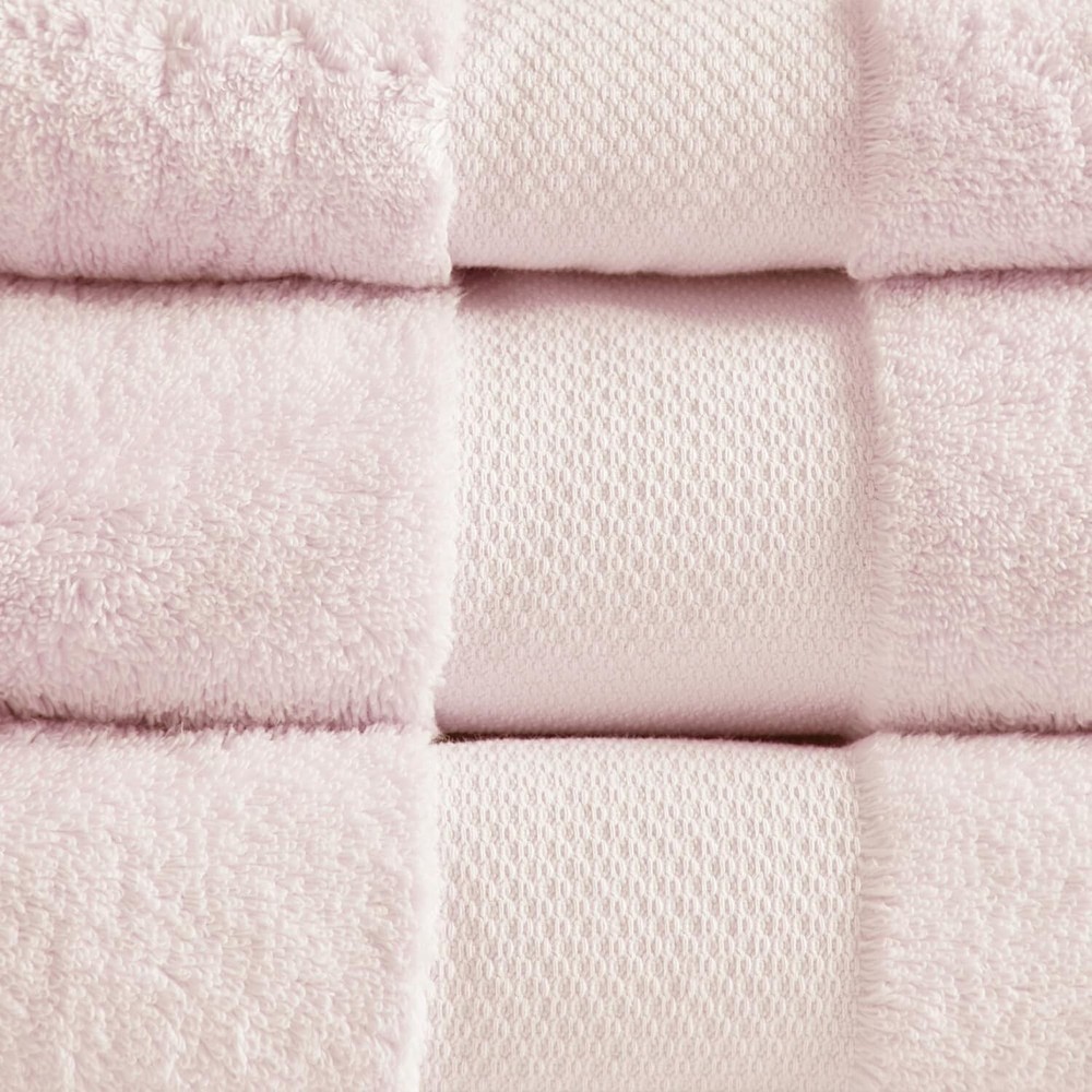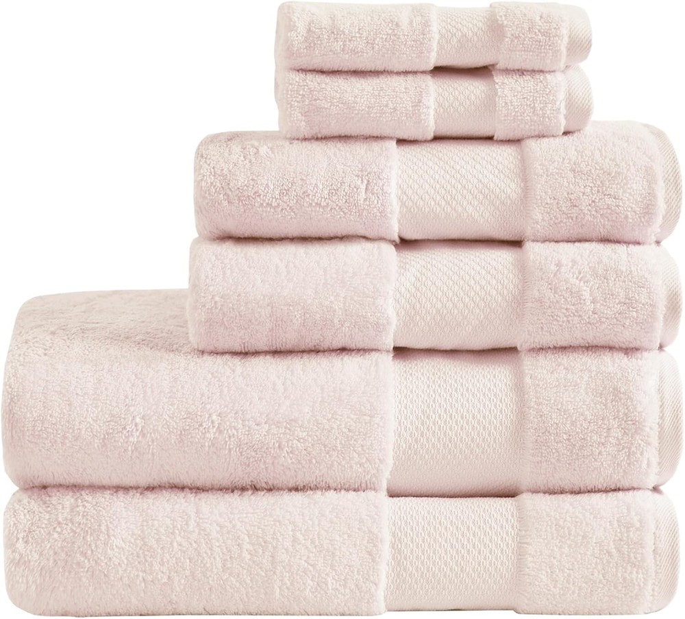 The Madison Park Signature Turkish Cotton 6-Piece Bath Towel Set in Blush is a luxury addition to any bathroom. Made from 100% cotton in Türkiye, this set includes various sizes of towels. The solid color design adds a touch of elegance to the room.