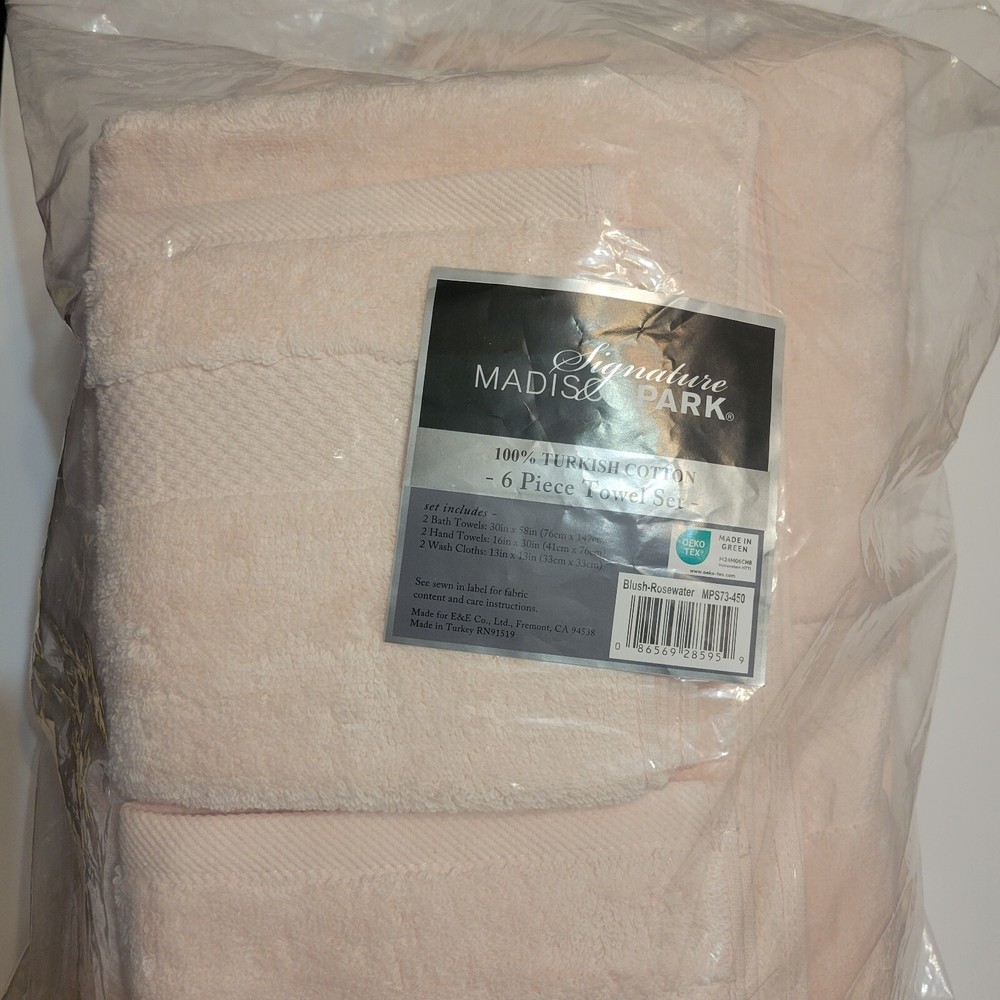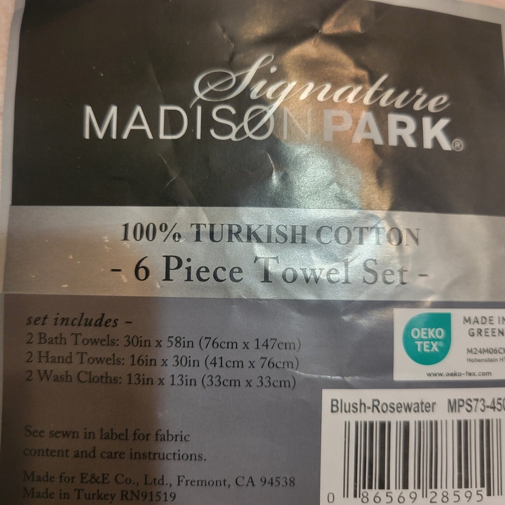 Set includes: 2-bath towels: 30 in. W x 58 in. L (2), 2-hand towels: 16 in. W x 30 in. L (2), 2 wash towels: 13 in. W x 13 in. L (2) Premium 100% Turkish cotton 6-piece bath towel set Low twist yarn is made in finest and longer Turkish cotton fibers, making these towels the ultimate in luxury while highly absorbent and inherently stronger for enveloping comfort Made with a classic 1½" Dobby border and ¾"end hem makes for a classic and refined finished touch Dobby trim offers a classic, refined touch Due to the absorbency of the low twist construction that uses less cotton, these towels will wash easily using less water and dry quicker resulting in reduced energy usage Do not use bleach, fabric softeners, or iron the towels as it may damage overall softness and quality New towels tend to lint at first but after several washes, lint will diminish. Towels should be washed separately to minimize lint. Oeko-Tex Certified, includes no harmful substances or chemicals New in opened package