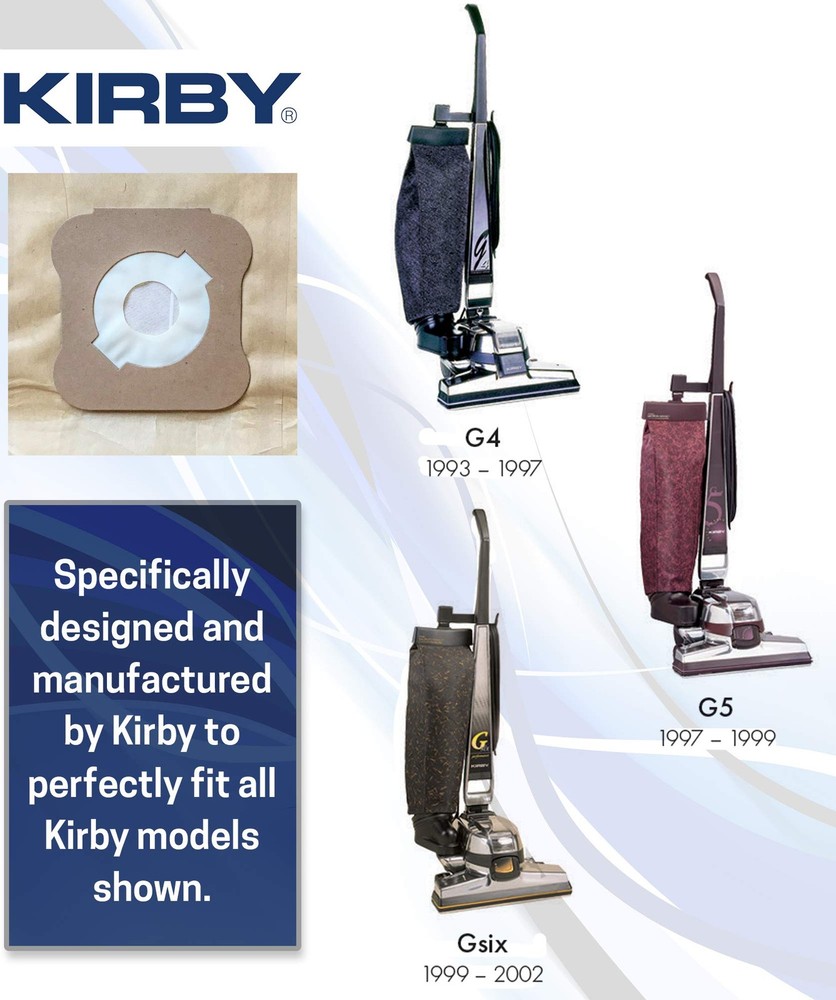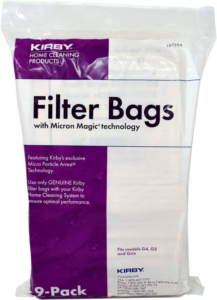 Product Page Kirby Vacuum Bags G4, G5, G6 – Genuine Micron Magic Filtration, 9-Pack Kitchen Description: Kirby Vacuum Cleaner Bags - The Finest in HEPA Filtration Need to replace your Kirby vacuum bags No problem! The Kirby Allergen Reduction Filter Bag is the most popular of all our Kirby bags. Every single one of our Kirby bags reduces common household dust, pollen and other particles. The electrostatically charged material traps particle matter after it is picked up from your floor. This keeps dirt and dust inside your Kirby vacuum bag and not in the air around your home. The Allergen Reduction filter system reduces dust, pet dander, pollen and other household debris, and is ideal for pet owners. Features: Genuine Kirby Replacement Bags – Designed by Kirby for superior performance and a perfect fit for your vacuum. Compatible with Kirby Models – Fits Kirby Generation Series, including G4, G5, and G6 models, ensuring hassle-free installation. High-Efficiency Filtration – Helps maintain optimal vacuum suction and supports cleaner indoor air quality. Durable & Reliable – Made from quality materials to maximize airflow and extend vacuum life. Convenient 9-Pack – Includes nine replacement bags, providing long-lasting value and reducing the need for frequent reorders. OEM Part #197394 – Official Kirby replacement bags designed for a precise fit and reliable vacuum performance. Easy Installation – Simply remove the old bag and replace it with a new Kirby Micron Magic Filtration bag in seconds. Designed for Maximum Capacity – Each bag holds a large amount of debris, reducing the frequency of bag changes and maintaining strong suction.