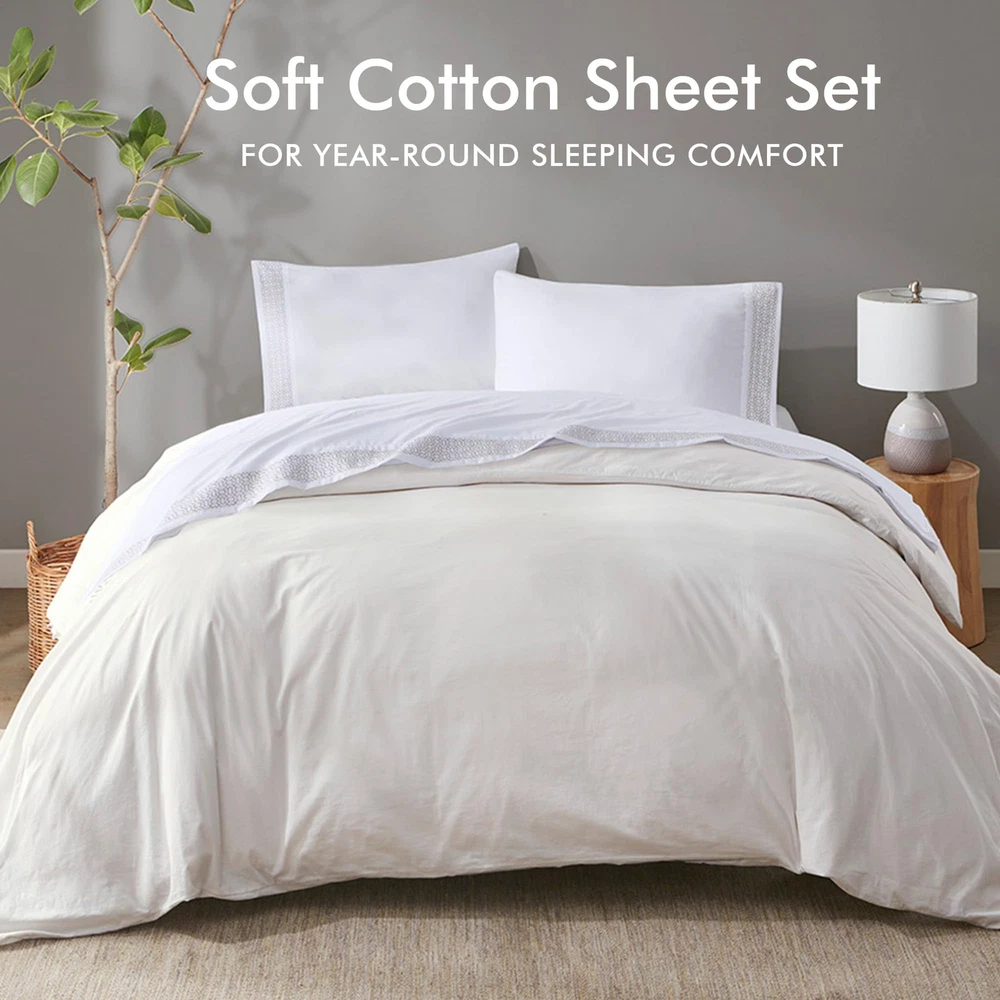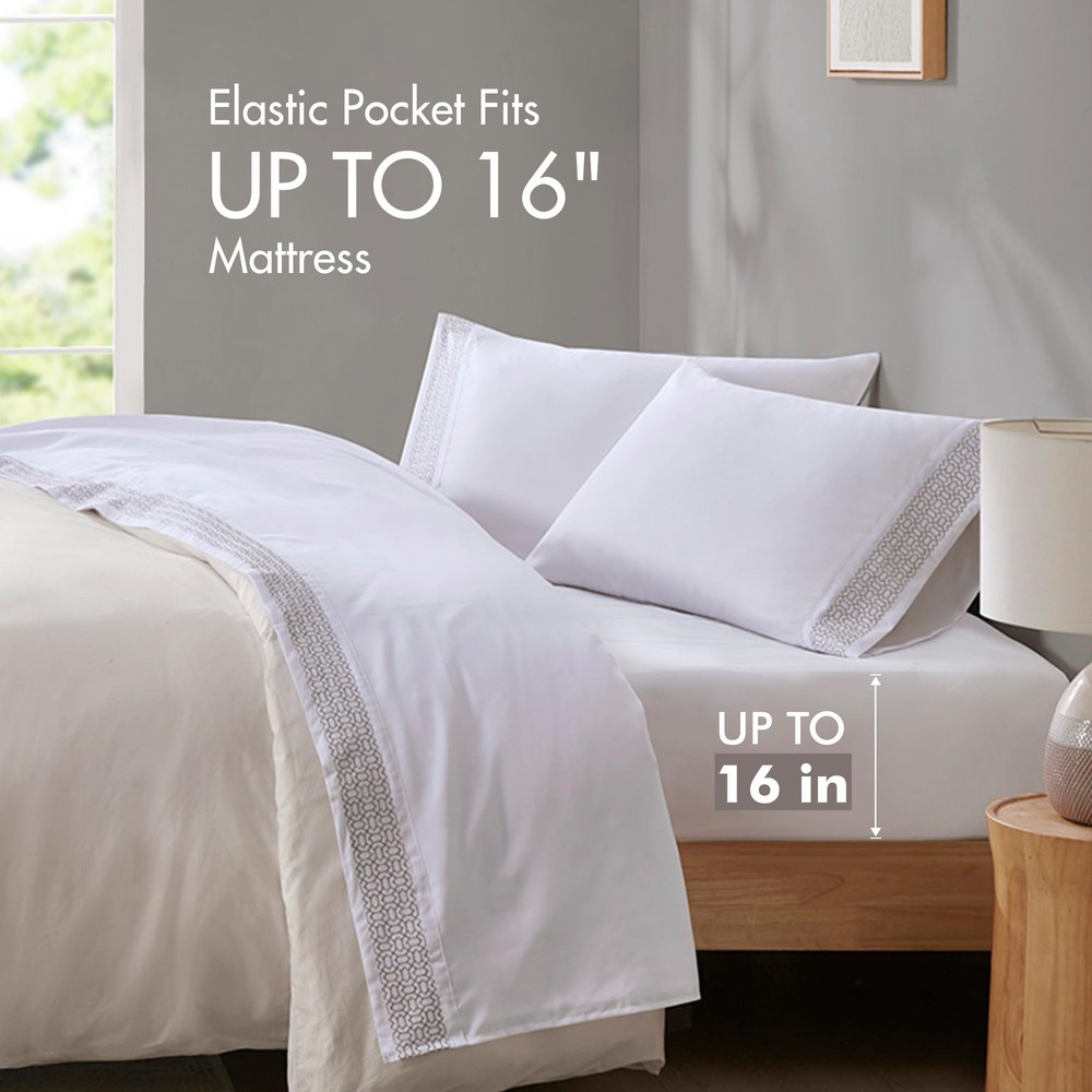 Style your bed with the simple elegance of the Embroidered Microfiber Sheets. This solid microfiber sheet set features a beautiful embroidered hem that adds a refined touch and brings a pop of color to your bedroom. Embroidery is featured on the flat sheet and pillowcase hem face side only. The fitted sheet fits mattresses up to 16". Made from ultra-soft microfiber, this casual sheet set provides a charming and comfy addition to your bedroom decor. This microfiber sheet set is also OEKO-TEX certified, meaning it does not contain any harmful substances or chemicals to ensure quality comfort and wellness. Set includes: 1 Flat Sheet, 1 Fitted Sheet, and 2 Pillowcases. Machine washable for easy care. This solid microfiber sheets feature a beautiful embroidered hem that adds a refined touch and brings a pop of color to your bedroom Bed sheets featured Embroidery on the flat sheet and pillowcase hem face side only, Soft and cozy bedding sheets and pillowcases for all season comfort These Queen sheets are also OEKO-TEX certified for superior COMFORT and WELLNESS, as they are free from any substances or chemicals that may compromise quality Set include: 1 Flat Sheet: 90"W x 102"L, 1 Fitted Sheet: 60"W x 80"L + 14"D, 2 Standard Pillowcases: 20"W x 30"L This microfiber sheets Queen size is machine wash cold with like colors. Gentle cycle. Do not bleach. Tumble dry low. Remove promptly. Warm iron if needed