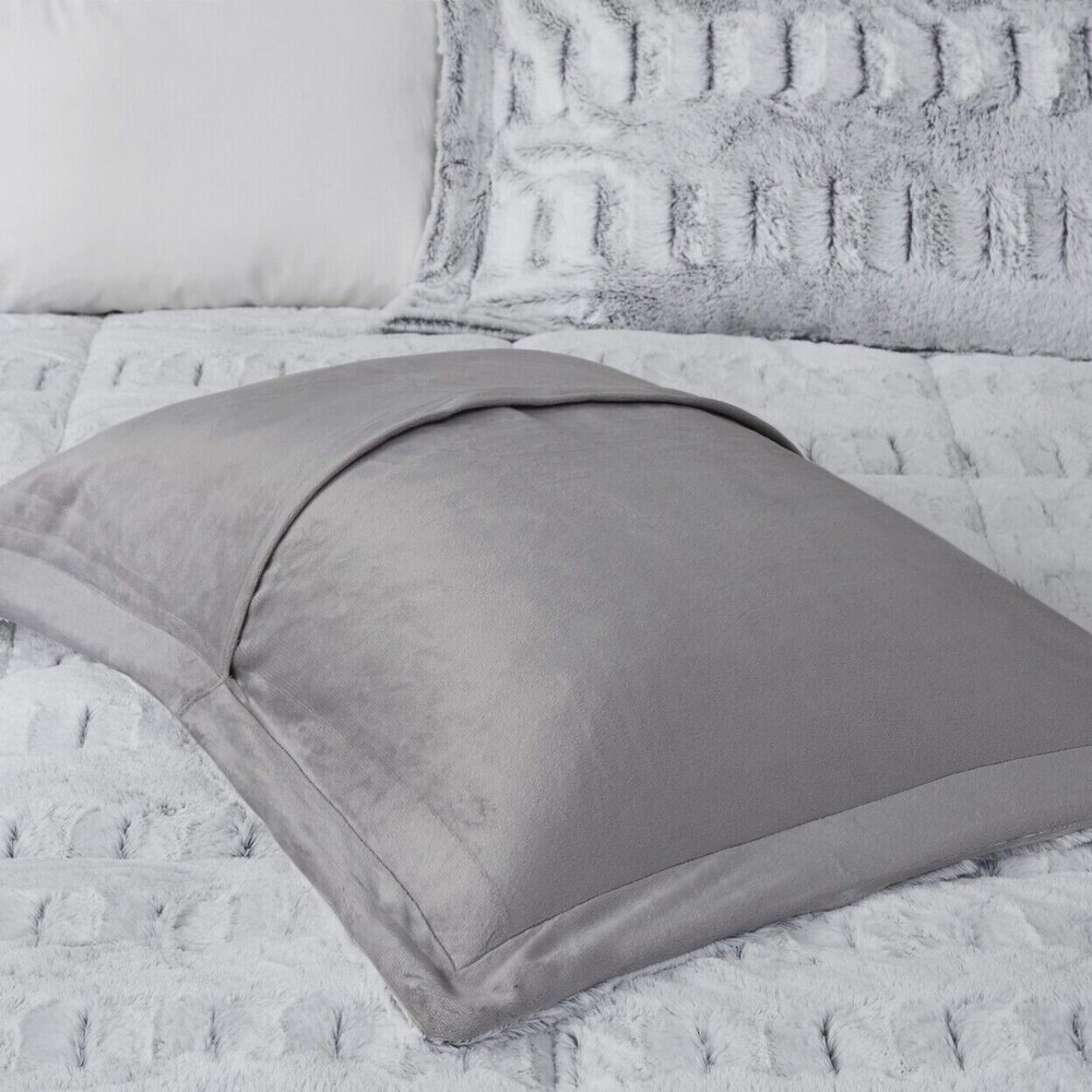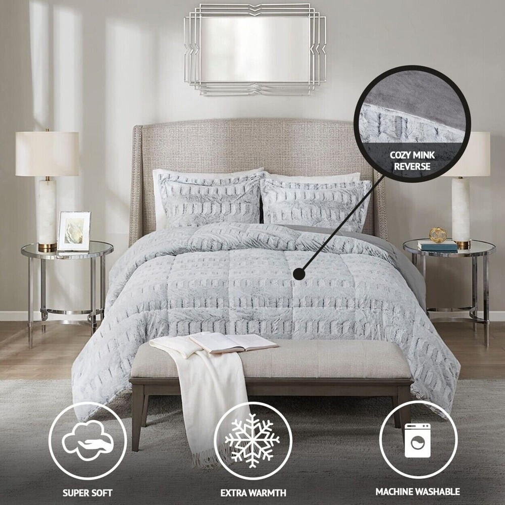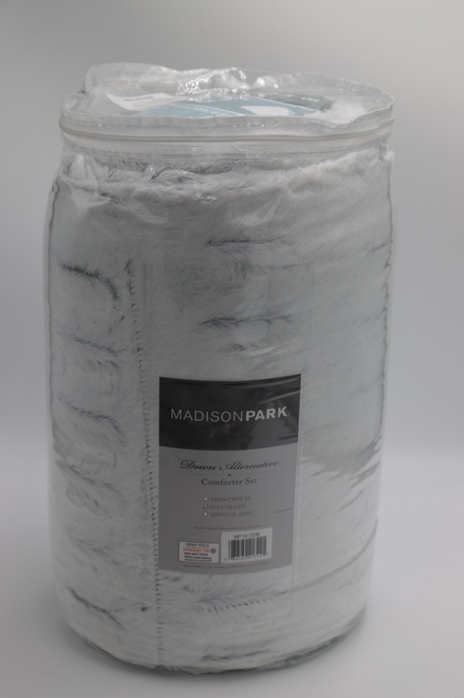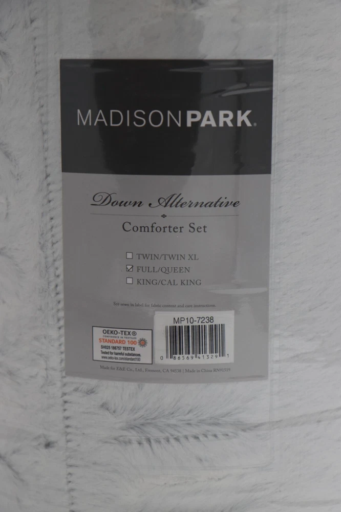 Madison Park Soft Plush Comforter, Grey - Full/Queen Sleep in the pure softness and comfort of the Madison Park Gia Back Print Long faux Comforter Mini Set. The ultra-soft grey comforter flaunts a stylish brushed faux on the face that flips to a soft faux mink reverse, for a luxurious look and feel. Matching shams (1 sham for Twin sizes) mirror the design of the comforter and feature a 2-inch flange to complete the comforter set. Hypoallergenic filling in the faux comforter provides exceptional warmth and comfort, while the end-to-end box stitching keeps the filling in place. Incredibly soft, this reversible long faux comforter mini set brings the perfect amount of comfort and glamorous style to your bedroom decor. This comforter is Fibr-Tec certified, meaning it does not contain any harmful substances or chemicals to ensure quality comfort and wellness.