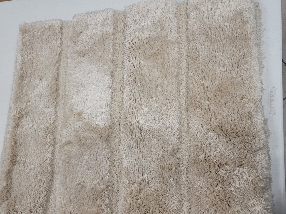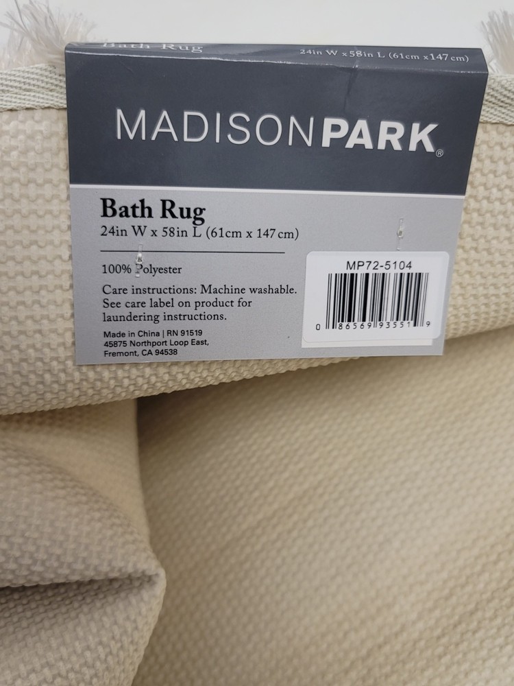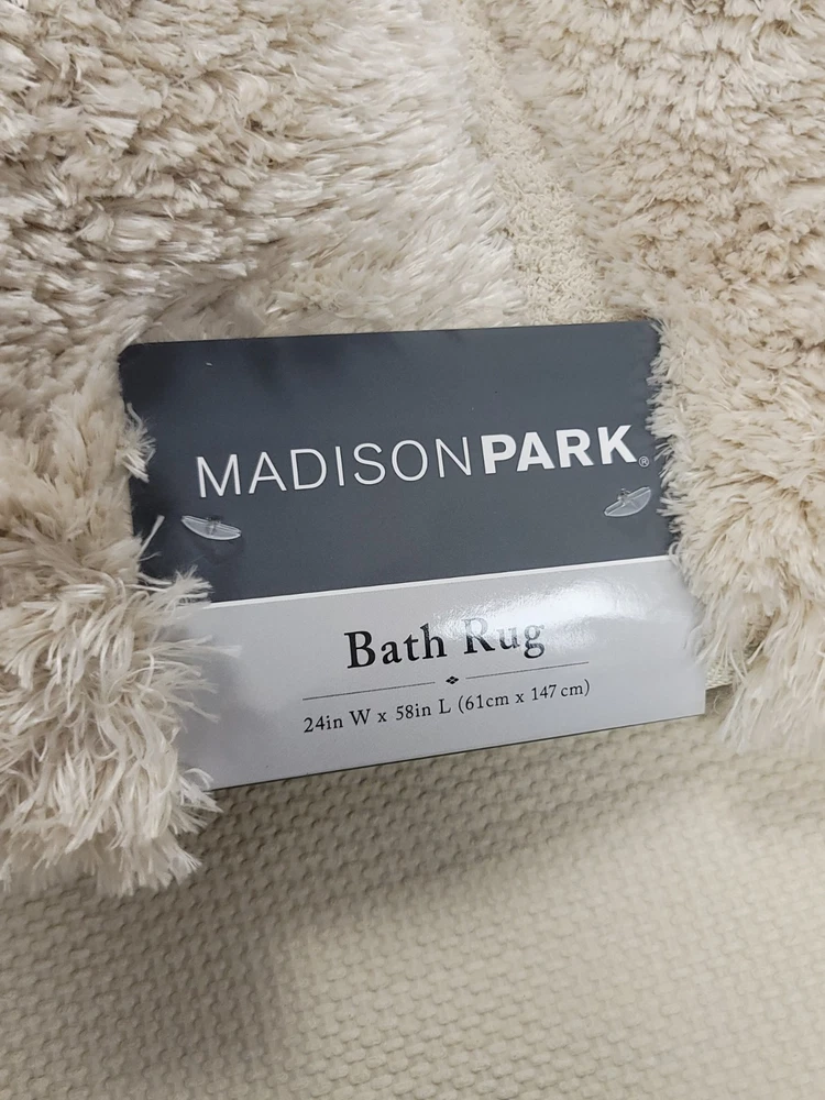 Madison Park Solid Tufted Pearl Channel Non-Slip Rug In Beige, 24"x58"- New 1 Rug 1500GSM Polyester Available in Size 17"W x 24"L, 21"W x 34"L, or 24"W x 60"L Tufted Macro Spun High-Low Stripe Design Durable Soft Hand Feel Rug Backing: Heavy Duty Latex Machine Washable