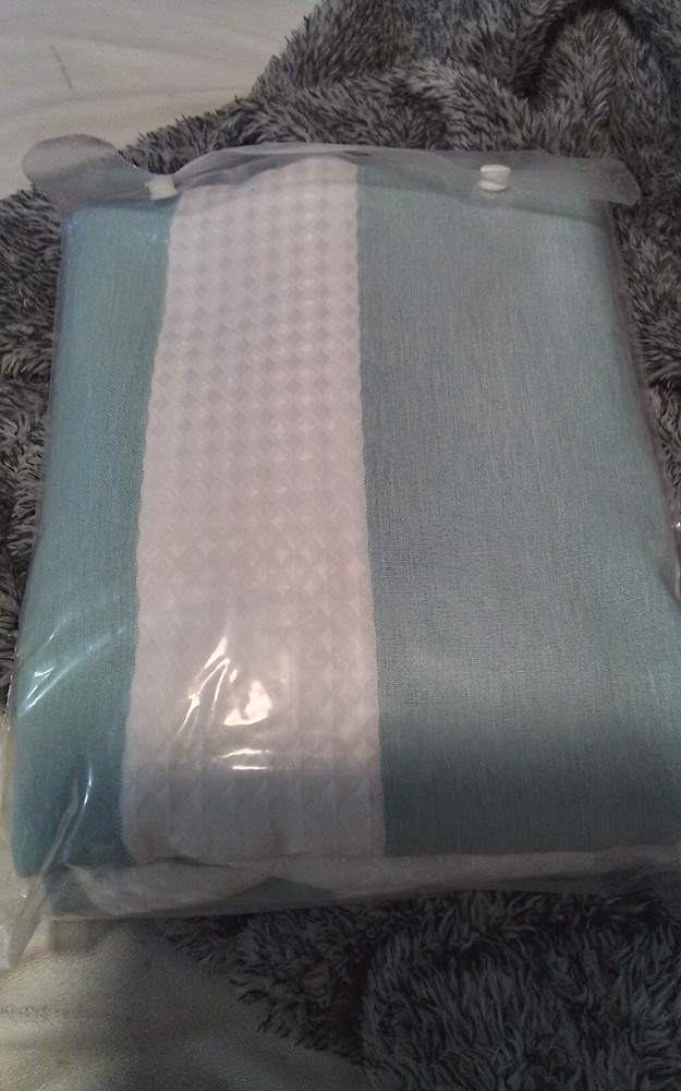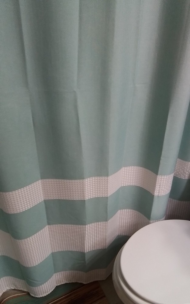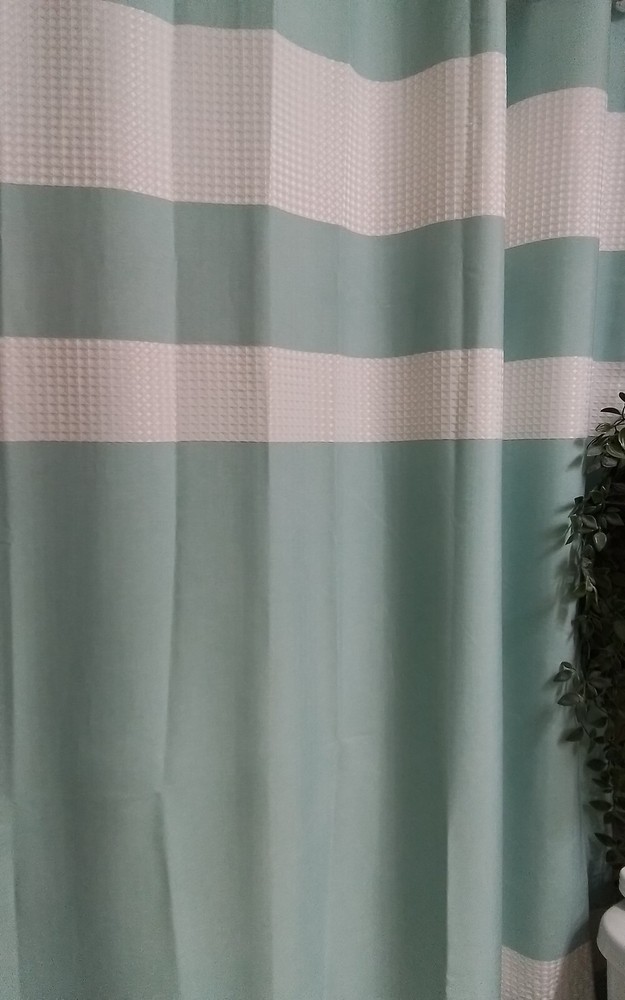This shower curtain is stunning—the aqua green waffle texture looks luxurious and spa-like. It’s brand new, still in its original packaging, and feels high-quality. I only opened it to admire it, but sadly couldn’t use it due to a shower rod height change. If you need a taller curtain, check measurements first, but otherwise, this is a fantastic find!