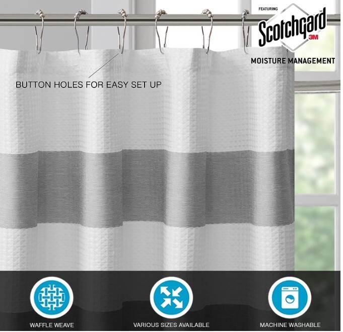 Brand: Madison Park Color: Grey Material: Polyester Product Dimensions: 72 "L x 72"W Opacity: Light-filtering About this item 3M Water Repellent Treatment Waffle Weave Woven Textured Ground Various Sizes To Fit Any Bathroom Space 190gsm Polyester, 3M Water Repellent Scotchagrd Treatment 1 Shower Curtain:72"W x 96"L Machine Washable