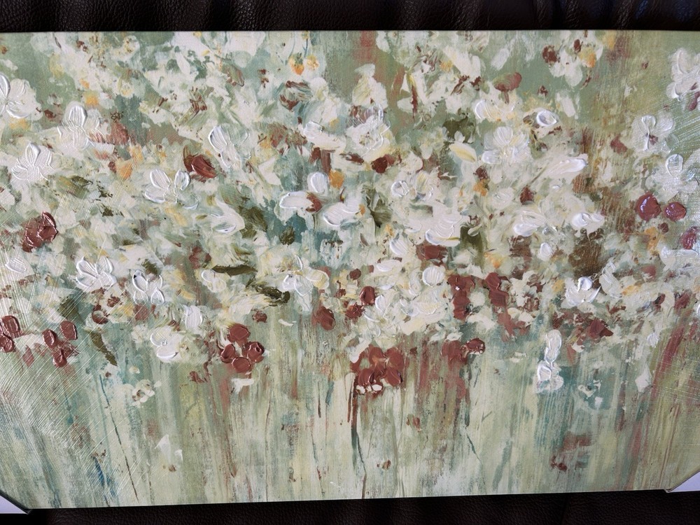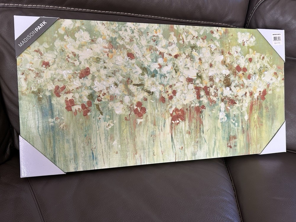 Madison Park Spring Fields Painted Hand Embellished Floral Canvas Wall Art 15X30, Transitional Wall Décor Cross Brush Gel Coat and Hand Embellished Canvas 1 Piece:15x30x1.65" 1 Piece:15x30x1.65" 95% MDF, 5% Canvas Model Number: MP95C-0074 Spring Fields is a beautiful floral piece that will add a breath of freshness to your room. The piece is printed on canvas and hand embellished to give a hand painted feel.