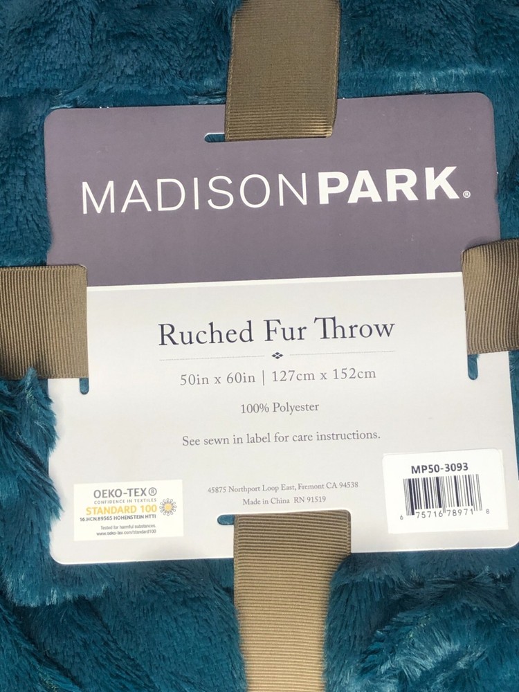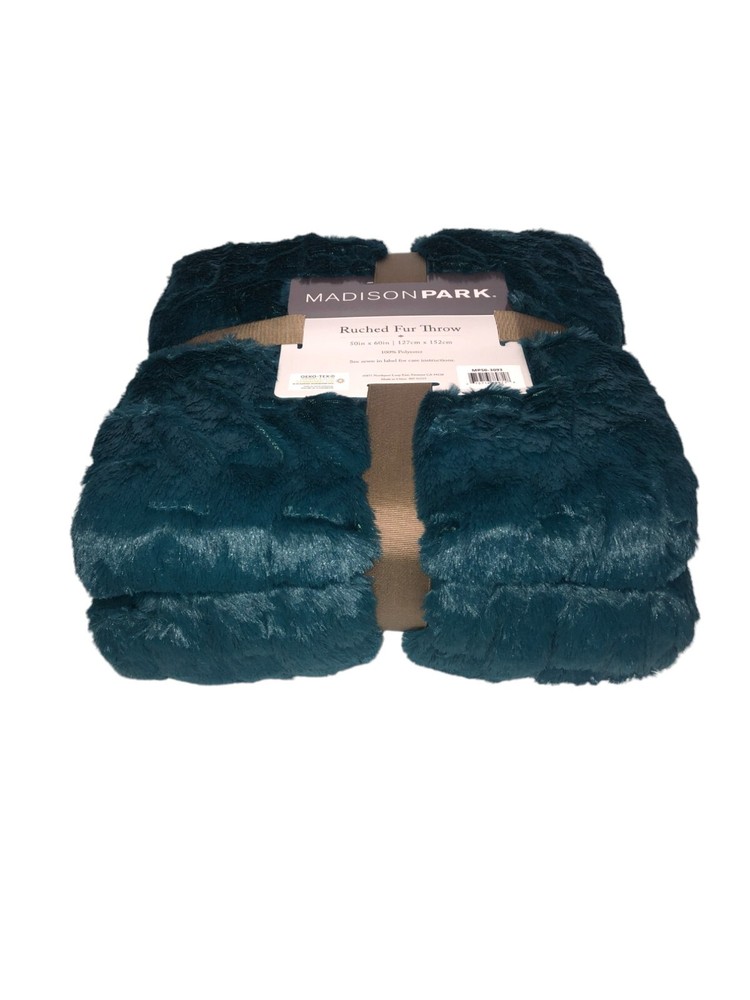 Madison Park Ultra Soft Ruched Faux Fur Throw Blanket 50X60" Color: Teal FEATURES 50" x 60" Ruched design Ultra soft faux mink reverse Fluffy and luxurious Coordinating Madison Park ruched faux fur euro throw pillow sold separately CONSTRUCTION & CARE Polyester Machine wash Imported Actual item Photos. Don't hesitate to contact us before purchasing if you have questions about the item's condition and shipping cost. If you receive an item with a noticeable flaw not shown in the photos, please contact us before leaving feedback. We strive to describe all items thoroughly and accurately. Please ask any questions you have before offering or buying. We will do our best to return your messages within 24 hours. Happy Shopping!