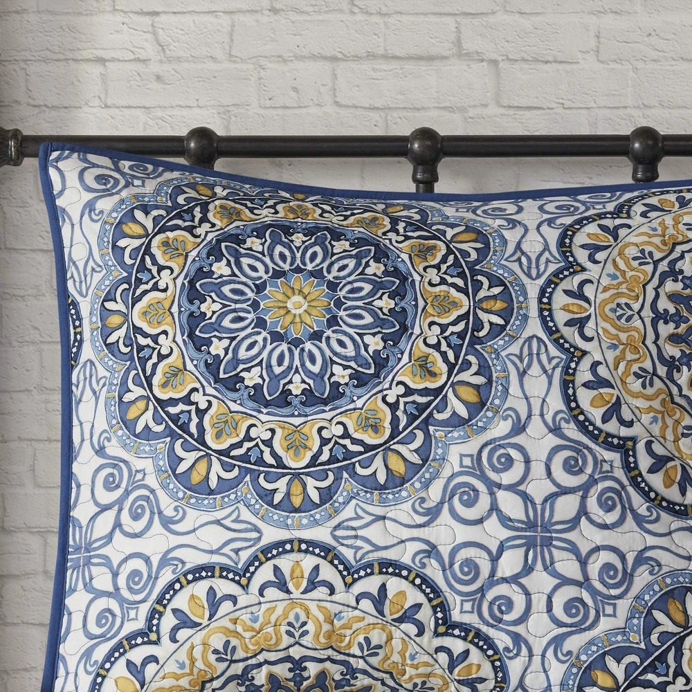 Madison Park Tangiers Quilt Modern Classic Design All Season, Breathable Coverlet Lightweight Bedding Set, Matching Shams, Decorative Pillow, Full/Queen(90"x90"), Circle Blue 6 Piece Description Tangiers instantly adds color and flair to your bedroom. Its bold blue and yellow floral print with large medallions is a modern twist to a classic look. The embroidered detailing on the three decorative pillows pulls the whole look together. This coverlet set also includes two matching standard shams. With a microfiber polyester face and a brushed fabric reverse, this coverlet is soft to the touch and machine washable for easy care. Features: Cotton Tangiers 6 Piece Reversible Coverlet Set instantly adds color and flair to your bedroom. Its bold blue and yellow floral print with large medallions is a modern twist to a classic look. Microfiber fabric is a really soft fabric that is naturally wrinkle and shrinkage resistant. Set includes: 1 Coverlet: 90"W x 90"L, 2 Standard Shams: 20x26+0.5" (2)3 Decorative Pillows: 18"W x 18"L/16"W x 16"L/12"W x 18"L Care instructions: Machine wash cold, gentle cycle, and separately. Do not bleach. Tumble dry low, remove promptly. Do not iron. Spot clean pillows. If there is no free movement in the washer or dryer, use large capacity commercial washer/dryer. Product Details: Size: Full/Queen(90"x90") Included Components: 1 Coverlet, 2 Standard Shams, 3 Decorative Pillows Color: Circle Blue Style: Bedding set Brand: Madison Park Size: Full/Queen(90"x90") Included Components: 1 Coverlet, 2 Standard Shams, 3 Decorative Pillows Color: Circle Blue Style: Bedding set Brand: Madison Park Theme: Floral Pattern: print Material: Polyester Fabric Type: Cotton Number of Pieces: 6 Seasons: All Product Care Instructions: Machine Wash, Dry Clean Only Manufacturer: Madison Park UPC: 675716510596 Item dimensions L x W x H: 90 x 90 x 0.25 inches Global Trade Identification Number: 96 Product Dimensions: 90 x 90 x 0.25 inches Item Weight: 9.52 pounds Department: unisex-adult Country of Origin: China Item model number: MP13-783 Is Discontinued By Manufacturer: No Specifications: certified frustration-free Assembly required: No Batteries required: No Shipping Free fast shipping Return Policy All items qualify for returns within 30 days of receipt.