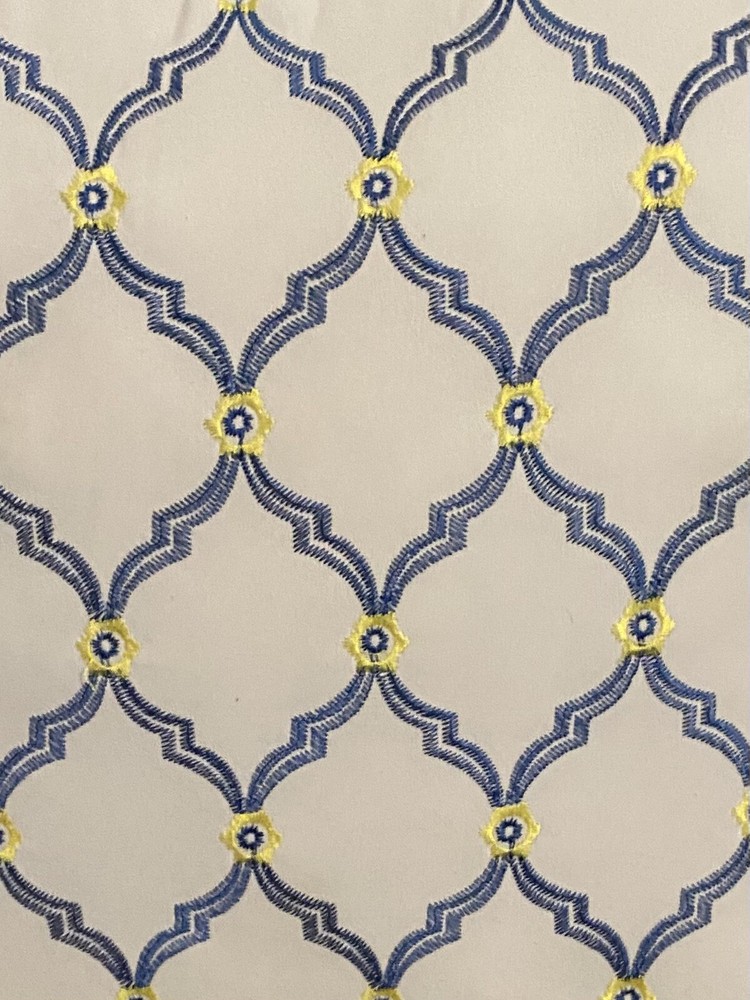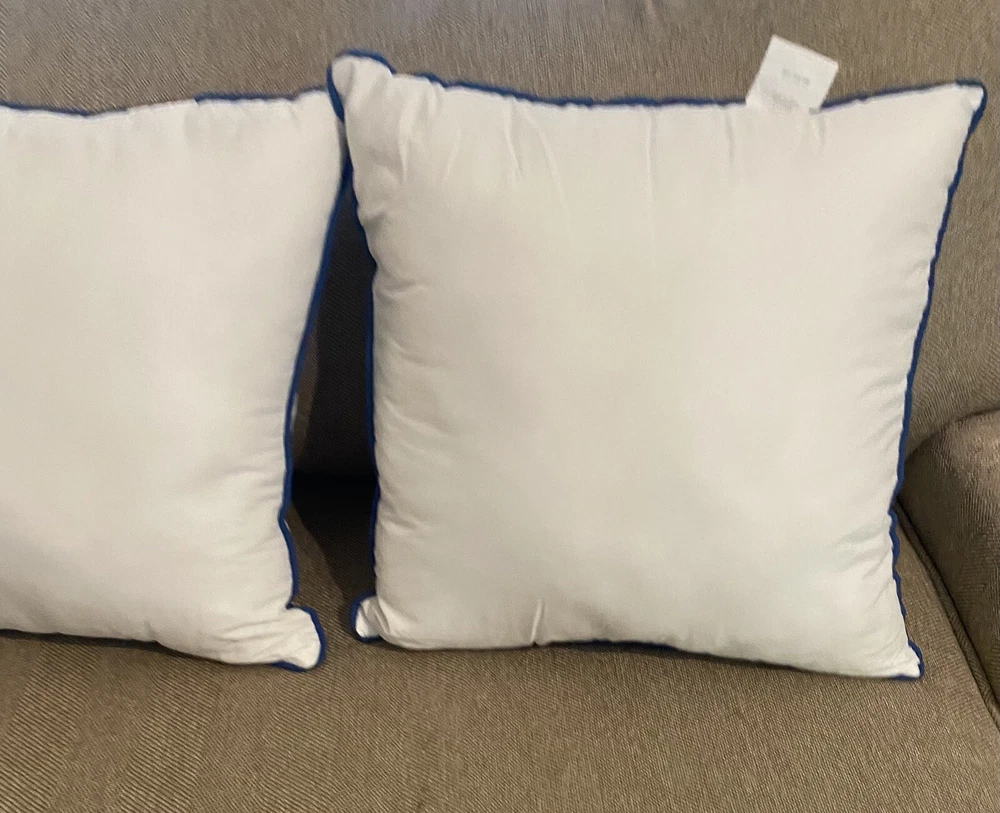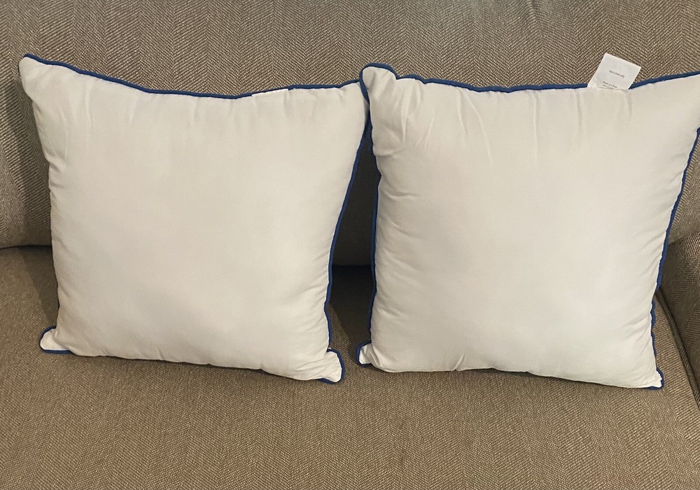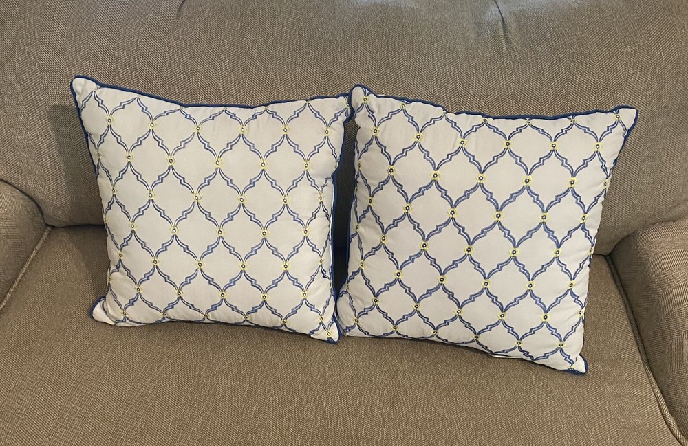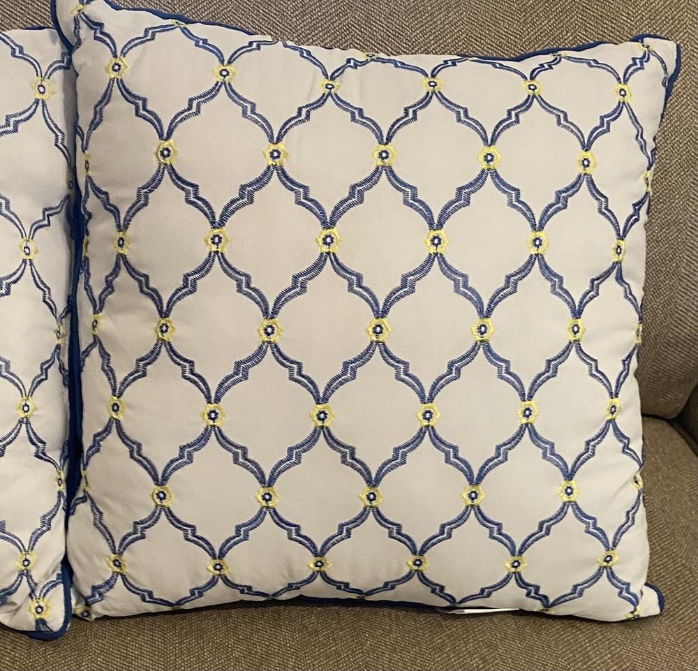 2- Pillows that go with the Madison Park Tangiers bedding set. 16” x 16” It features a white background with a blue geometric pattern and small yellow accents. Pillows are like new! No stains, smells, tears or aging. See photos