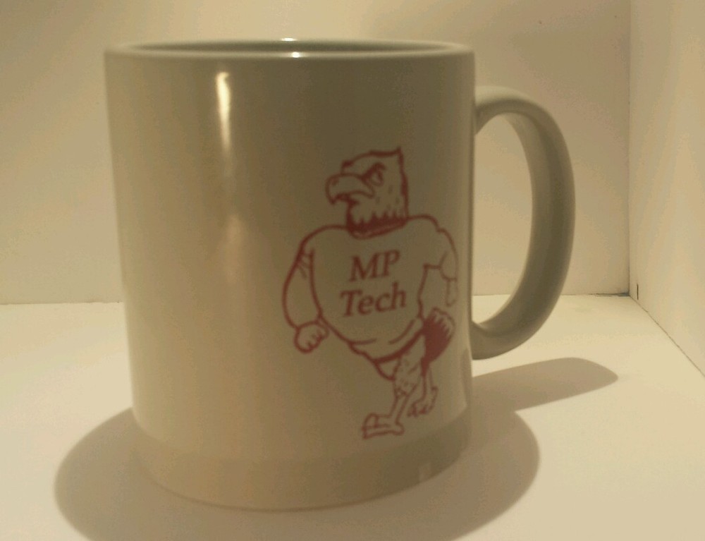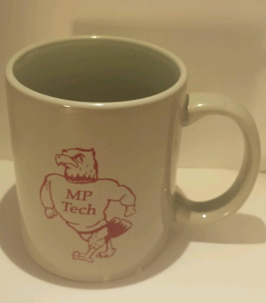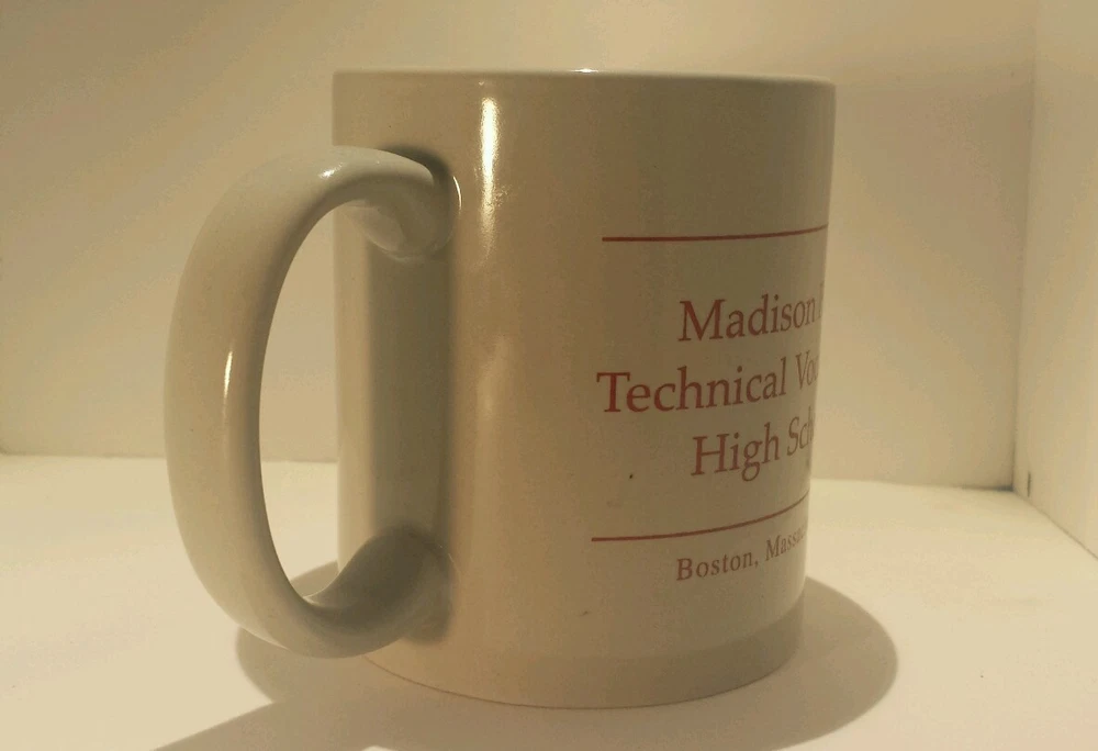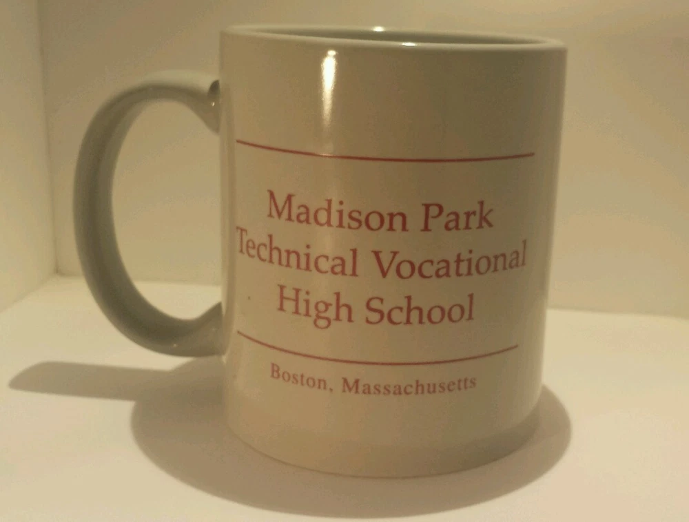 •Madison Park Technical Vocational High School Boston, Massachusetts coffee mug •10 oz • Cup is light gray with maroon lettering and artwork •Picture of the school's mascot, the bald eagle in a sweatshirt that says, "MP Tech." •pre-owned - There are two small chips at the bottom of the cup, the side where the mascot is, also has other wear (please see photos for details) Please note actual colors may vary. It’s important to note that they may look different on a real product than what you see on your computer monitor and/or mobile phone screen. This is due to the fact that every computer monitor and/or mobile phone screen has a different capability to display colors and that everyone sees these colors differently.