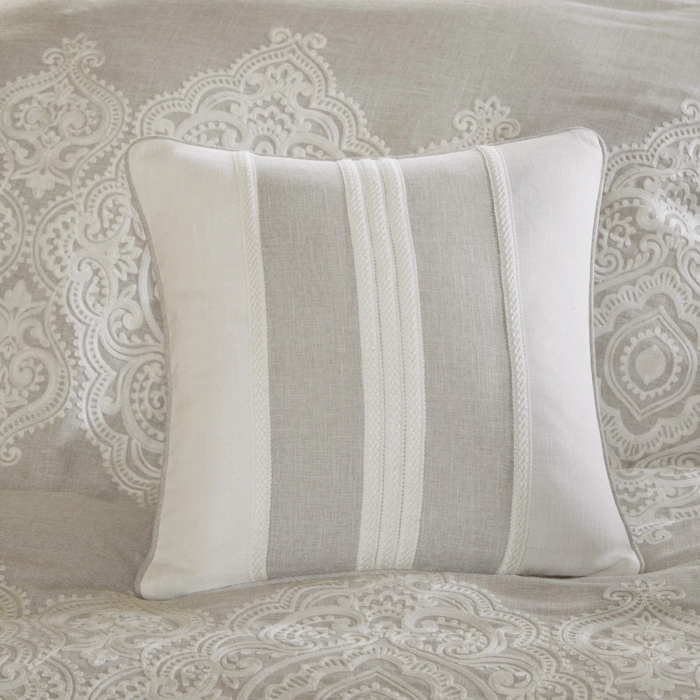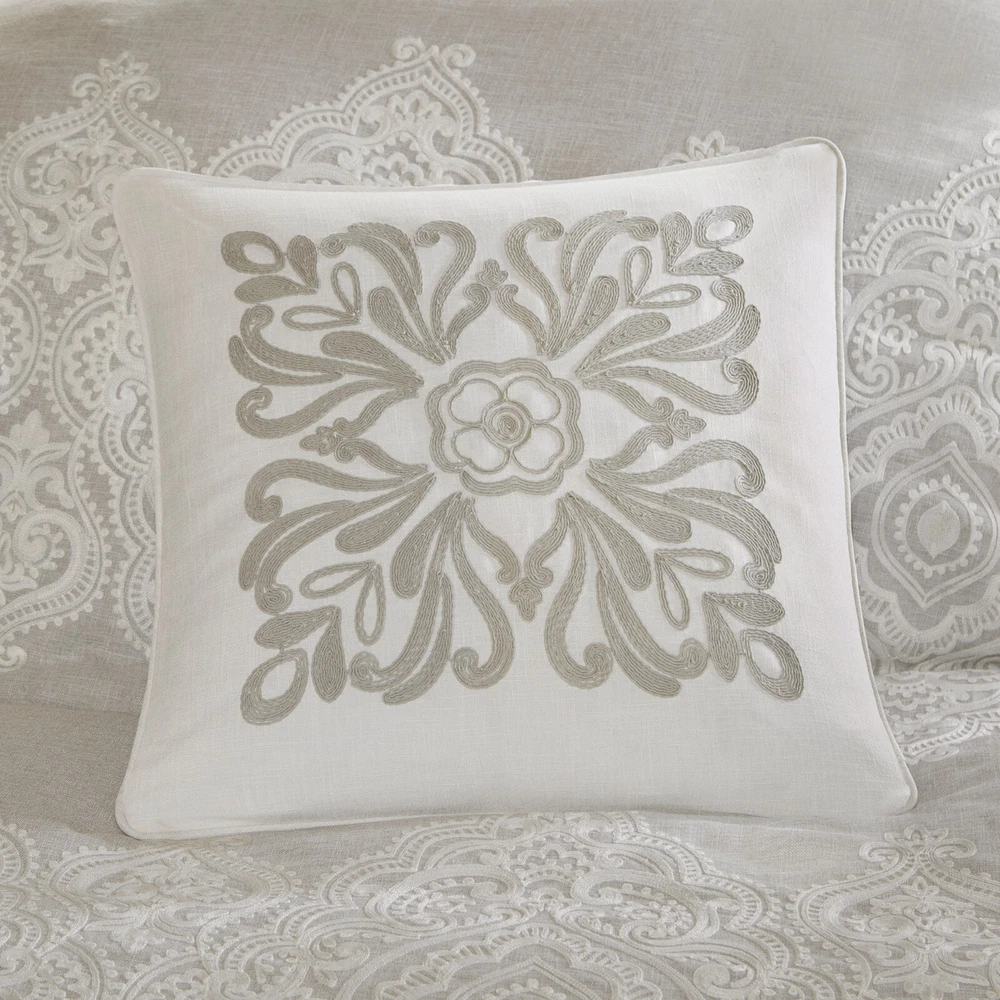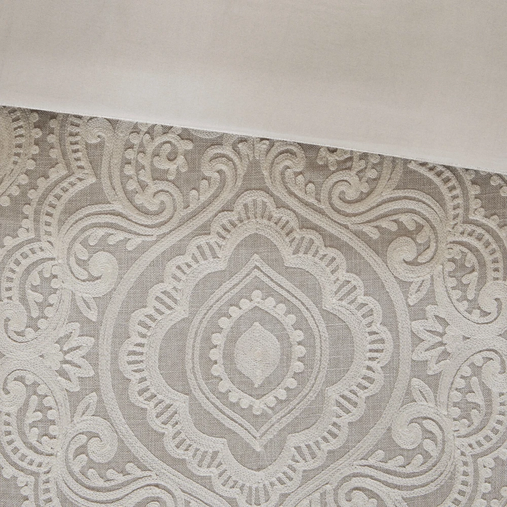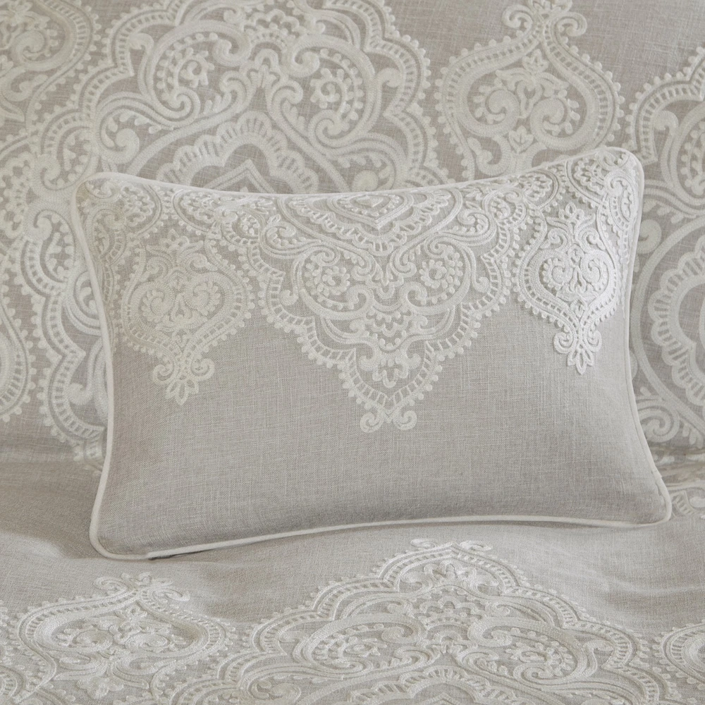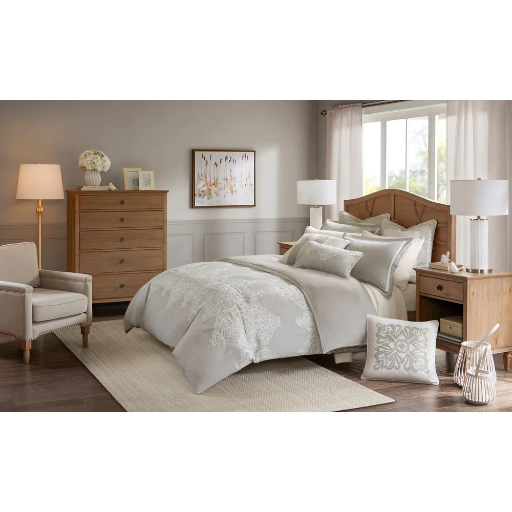 Store Categories Store Categories Bedding Comforters Decorative Pillows Duvet Covers Quilts & Coverlets Sheets Blankets & Throws Mattress Pads Pillows Home Decor Window Treatments Wall Art Home Accents Furniture Beds Dining Seating Ottomans & Benches Accent Chairs Accent Tables Dining Tables Sofas Bath Bath Robes Shower Curtains Towels Bath Rugs Bath Accessories Apparel Pajama Sets Nightgowns Rugs Rugs & Carpets Lighting Lamp Pendant Other Product Overview Details DESCRIPTION Madison Park Signature's Barely There 9 Piece Comforter Set provides a chic and charming update for the bedroom. Oversized and overfilled for maximum warmth and comfort, the textured comforter features a beautiful white chain stitch embroidery in an intricate damask pattern and natural palette of grey and beige. The solid natural reverse pairs well with the top of bed design, while shams in coordinating colors and simple trim complement the overall look. Three white Euro shams feature embroidered borders in a natural hue that add an elegant and sophisticated touch. A trio of decorative pillows, each with a distinct embroidered pattern or textural detail, round out the gorgeous bedding set. This comforter uses a removable duvet-style insert that is secured by inner ties and a hidden button closure. This provides no visible bartacking lines on top of the bed to create a smooth, clean face. Dry clean comforter cover only and machine wash comforter filler. FEATURES • Elegant and glamorous, transitional textured comforter set • Features beautiful white chain stitch embroidery in an intricate damask pattern and natural palette of grey and beige • Oversized and overfilled comforter with removable insert (included), inner ties, and hidden button closure • Duvet style comforter insert, so no visible bartacking lines seen on top of the bed • Set includes comforter, 2 shams, 2 euro shams (3 in King size), 2 square and 1 oblong decorative pillows • Decorative pillows have removable cover with hidden zipper • Hypoallergenic polyester filling in the comforter and pillow (filling contains no allergens and is treated to be dustproof) • Dry clean comforter cover and machine washable comforter filler MATERIAL Comforter face: 100% polyester solid slub with embroidery Comforter Back: 100% polyester 95gram micro fiber solid Sham face and back: 100% polyester solid slub, removable seperate polyester filler inserts ( 300g/sqm ) Euro sham: 100% polyester solid slub with embroidery on face 22x22"pillow cover: 100% polyester solid slub with embroidery on face 20x20" pillow: 100% polyester solid slub pieced with ribbon on face 14x20" pillow cover: 100% polyester solid slub with embroidery on face Pillow: hidden zipper with polyester filler Available Sizes: Queen Comforter Set includes: 1 Comforter: 92"W x 96"L 2 Standard Shams: 20"W x 26"L + 2"D 2 Euro Shams: 26"W x 26"L 1 Decorative Pillow: 22"W x 22"L 1 Decorative Pillow: 20"W x 20"L 1 Decorative Pillow: 14"W x 20"L King Comforter Set includes: 1 Comforter: 110"W x 96"L 2 King Shams: 20"W x 36"L + 2"D 3 Euro Shams: 26"W x 26"L 1 Decorative Pillow: 22"W x 22"L 1 Decorative Pillow: 20"W x 20"L 1 Decorative Pillow: 14"W x 20"L Bedding Comforters Decorative Pillows Duvet Covers Quilts & Coverlets Sheets Blankets & Throws Mattress Pads Pillows Home Decor Window Treatments Wall Art Home Accents Furniture Beds Dining Seating Ottomans & Benches Accent Chairs Accent Tables Dining Tables Sofas Bath Bath Robes Shower Curtains Towels Bath Rugs Bath Accessories Rugs Rugs & Carpets Lighting Lamp Pendant Product Overview Product Details DESCRIPTION Madison Park Signature's Barely There 9 Piece Comforter Set provides a chic and charming update for the bedroom. Oversized and overfilled for maximum warmth and comfort, the textured comforter features a beautiful white chain stitch embroidery in an intricate damask pattern and natural palette of grey and beige. The solid natural reverse pairs well with the top of bed design, while shams in coordinating colors and simple trim complement the overall look. Three white Euro shams feature embroidered borders in a natural hue that add an elegant and sophisticated touch. A trio of decorative pillows, each with a distinct embroidered pattern or textural detail, round out the gorgeous bedding set. This comforter uses a removable duvet-style insert that is secured by inner ties and a hidden button closure. This provides no visible bartacking lines on top of the bed to create a smooth, clean face. Dry clean comforter cover only and machine wash comforter filler. FEATURES • Elegant and glamorous, transitional textured comforter set • Features beautiful white chain stitch embroidery in an intricate damask pattern and natural palette of grey and beige • Oversized and overfilled comforter with removable insert (included), inner ties, and hidden button closure • Duvet style comforter insert, so no visible bartacking lines seen on top of the bed • Set includes comforter, 2 shams, 2 euro shams (3 in King size), 2 square and 1 oblong decorative pillows • Decorative pillows have removable cover with hidden zipper • Hypoallergenic polyester filling in the comforter and pillow (filling contains no allergens and is treated to be dustproof) • Dry clean comforter cover and machine washable comforter filler MATERIAL Comforter face: 100% polyester solid slub with embroidery Comforter Back: 100% polyester 95gram micro fiber solid Sham face and back: 100% polyester solid slub, removable seperate polyester filler inserts ( 300g/sqm ) Euro sham: 100% polyester solid slub with embroidery on face 22x22"pillow cover: 100% polyester solid slub with embroidery on face 20x20" pillow: 100% polyester solid slub pieced with ribbon on face 14x20" pillow cover: 100% polyester solid slub with embroidery on face Pillow: hidden zipper with polyester filler Available Sizes: Queen Comforter Set includes: 1 Comforter: 92"W x 96"L 2 Standard Shams: 20"W x 26"L + 2"D 2 Euro Sha