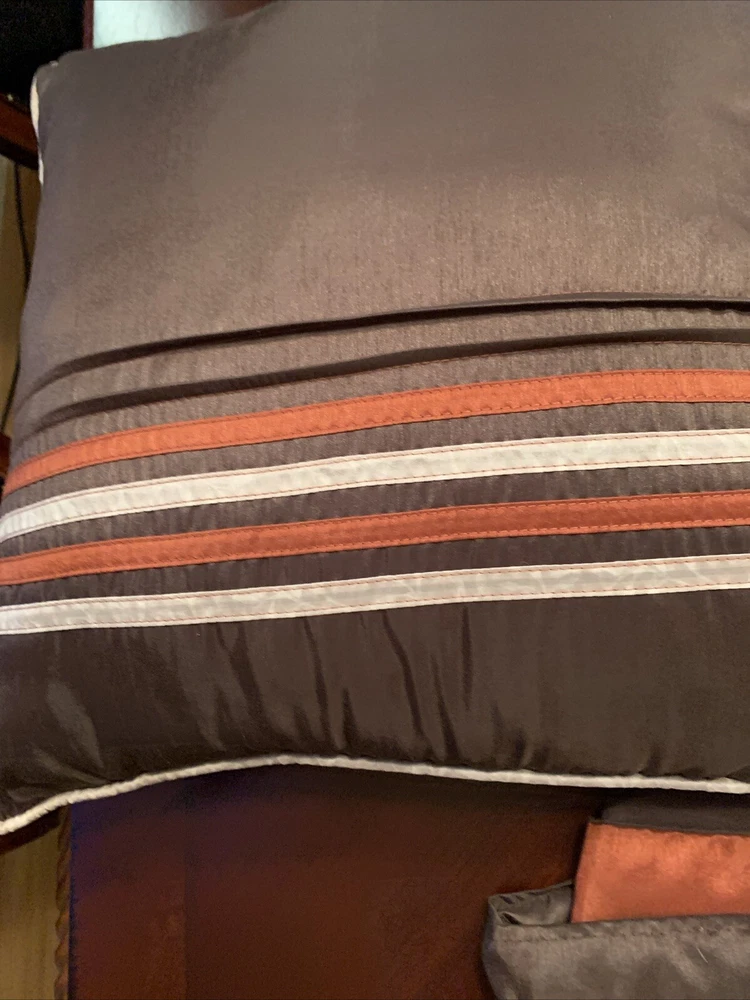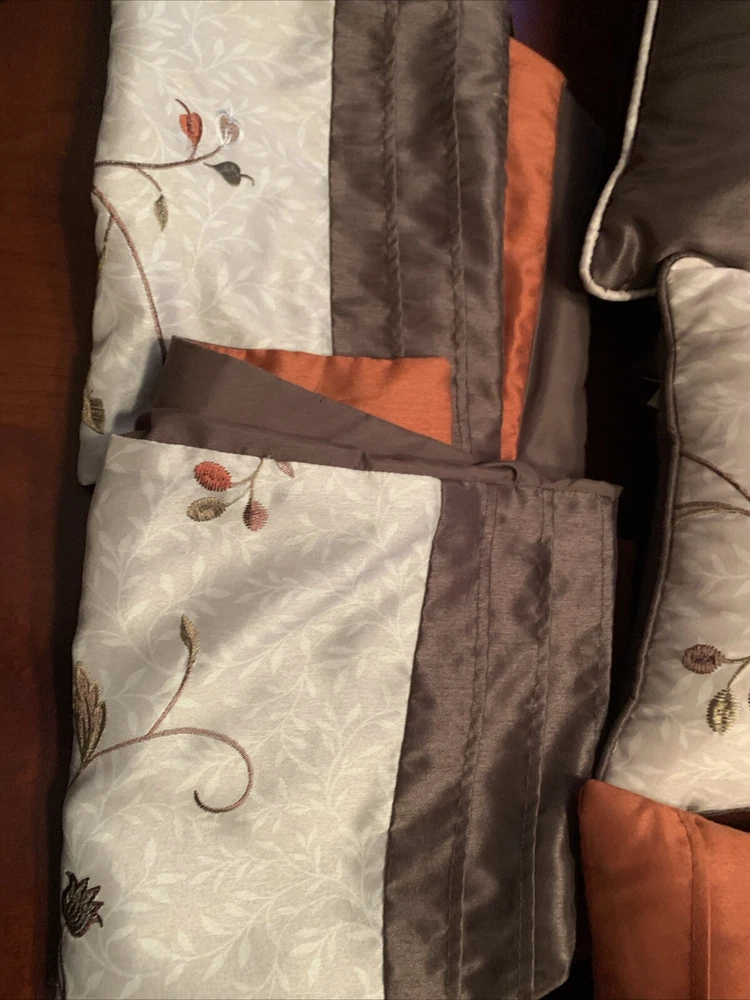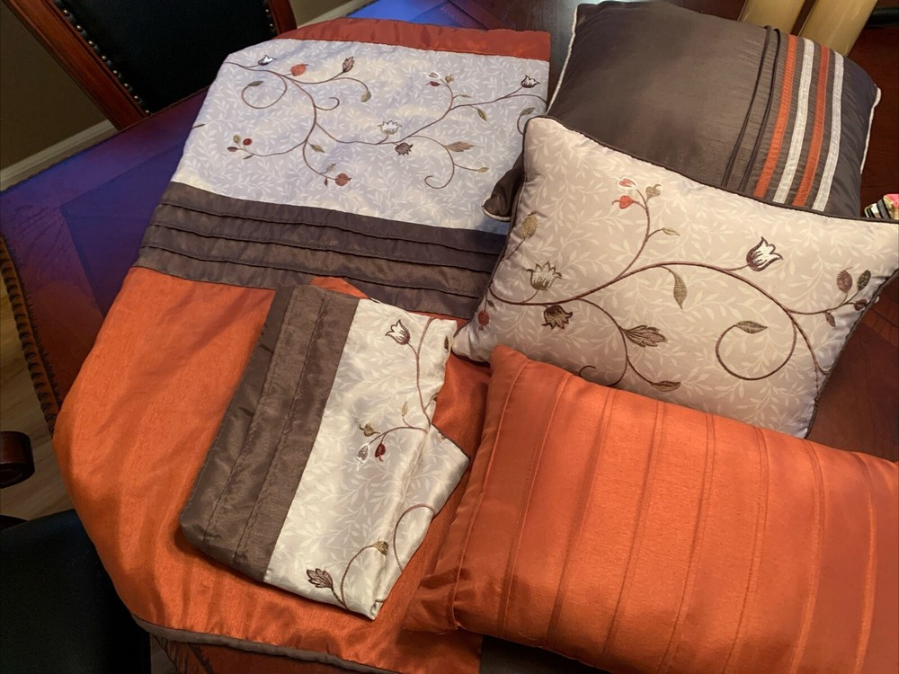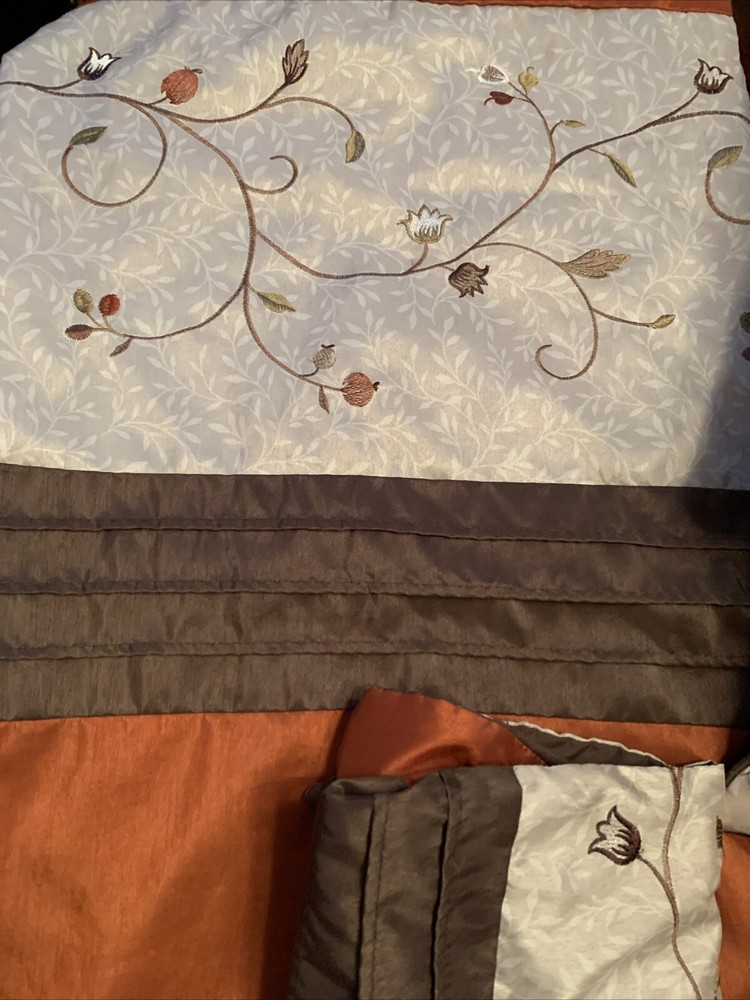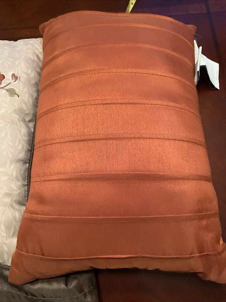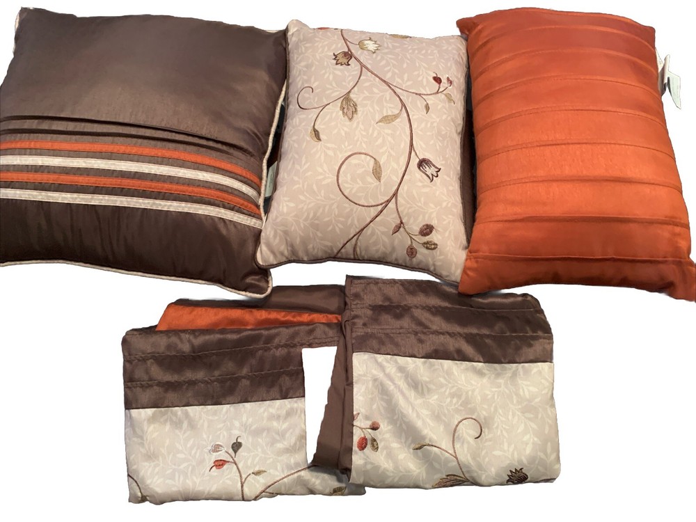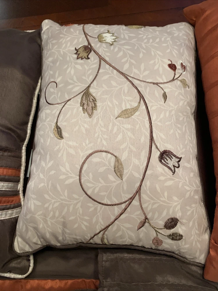Madison Park Throw Pillows set includes 3 pillows and 2 King shams in a Rust Brown color with a Floral pattern. The throw pillows are embroidered in a Contemporary style, suitable for the Bedroom. They are Rectangle in shape and should be spot cleaned. This set is versatile, ideal for women, men, boys, and girls, making it a lovely addition to your home decor.