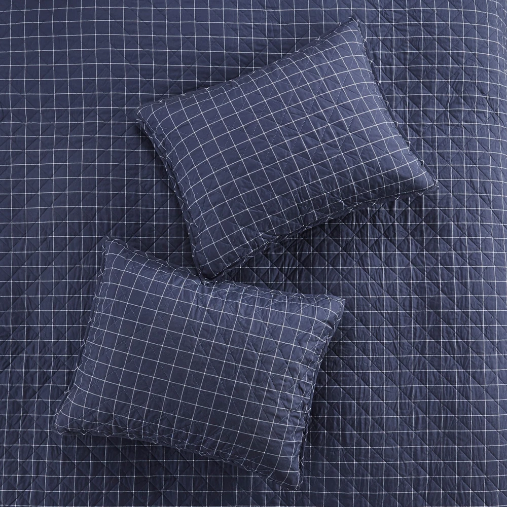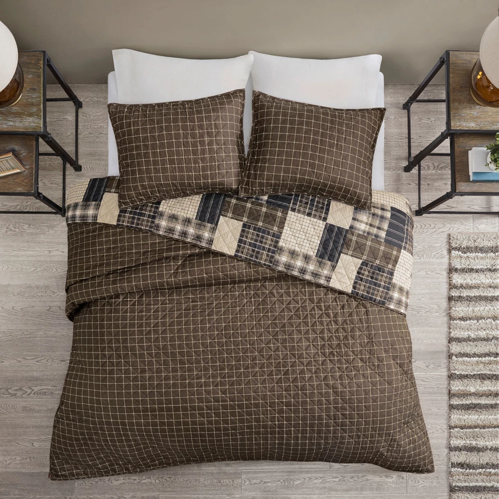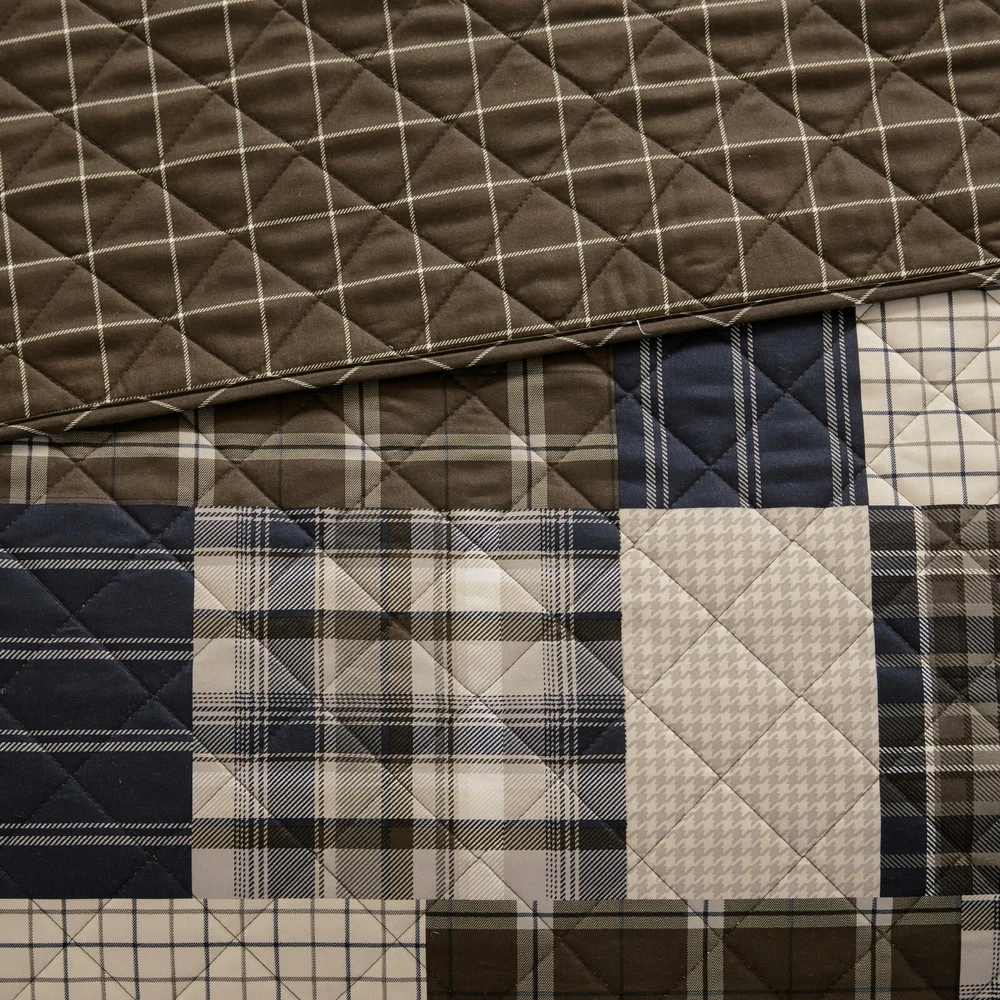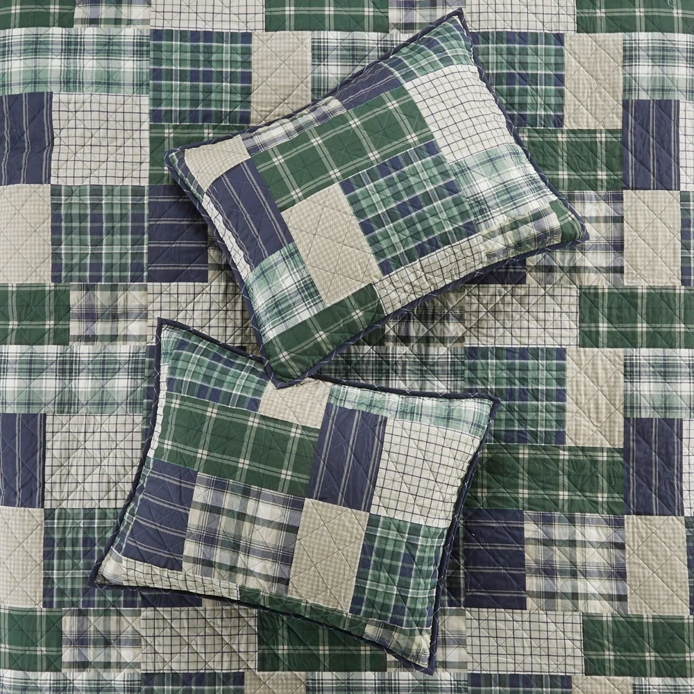 Store Categories Store Categories Bedding Comforters Decorative Pillows Duvet Covers Quilts & Coverlets Sheets Blankets & Throws Mattress Pads Pillows Home Decor Window Treatments Wall Art Home Accents Furniture Beds Dining Seating Ottomans & Benches Accent Chairs Accent Tables Dining Tables Sofas Bath Bath Robes Shower Curtains Towels Bath Rugs Bath Accessories Apparel Pajama Sets Nightgowns Rugs Rugs & Carpets Lighting Lamp Pendant Other Product Overview Details DESCRIPTION Rich in color, the Madison Park Timber 3 Piece Reversible Printed Quilt Set offers a lodge style update for your bedroom. This reversible rustic quilt features a patchwork print, in green and navy hues, for a cabin-inspired look. The navy reverse showcases a clean and inviting all-over windowpane print to complement the top of the quilt. Zipper closures on the 2 matching reversible shams create a clean finished edge, while cotton-rich filling and channel quilting provides a soft hand feel. Machine washable for easy care, this reversible quilt set brings a warm cabin look to your bedroom decor. FEATURES • Reversible rustic quilt set features patchwork print reverses to all over plaid • quilt and shams have cotton filling with channel quilting • Set includes quilt and 2 shams • Zipper closure on reversible shams • Machine washable for easy care MATERIAL Quilt/Sham: Soft Microfiber printed face and back, 90% Cotton, 10% other fiber fill, quilted Available Sizes: Full/Queen Quilt Set includes: 1 Quilt: 90"W x 90"L 2 Standard Shams: 20"W x 26"L King/California King Quilt Set includes: 1 Quilt: 104"W x 94"L 2 King Shams: 20"W x 36"L Bedding Comforters Decorative Pillows Duvet Covers Quilts & Coverlets Sheets Blankets & Throws Mattress Pads Pillows Home Decor Window Treatments Wall Art Home Accents Furniture Beds Dining Seating Ottomans & Benches Accent Chairs Accent Tables Dining Tables Sofas Bath Bath Robes Shower Curtains Towels Bath Rugs Bath Accessories Rugs Rugs & Carpets Lighting Lamp Pendant Product Overview Product Details DESCRIPTION Rich in color, the Madison Park Timber 3 Piece Reversible Printed Quilt Set offers a lodge style update for your bedroom. This reversible rustic quilt features a patchwork print, in green and navy hues, for a cabin-inspired look. The navy reverse showcases a clean and inviting all-over windowpane print to complement the top of the quilt. Zipper closures on the 2 matching reversible shams create a clean finished edge, while cotton-rich filling and channel quilting provides a soft hand feel. Machine washable for easy care, this reversible quilt set brings a warm cabin look to your bedroom decor. FEATURES • Reversible rustic quilt set features patchwork print reverses to all over plaid • quilt and shams have cotton filling with channel quilting • Set includes quilt and 2 shams • Zipper closure on reversible shams • Machine washable for easy care MATERIAL Quilt/Sham: Soft Microfiber printed face and back, 90% Cotton, 10% other fiber fill, quilted Available Sizes: Full/Queen Quilt Set includes: 1 Quilt: 90"W x 90"L 2 Standard Shams: 20"W x 26"L King/California King Quilt Set includes: 1 Quilt: 104"W x 94"L 2 King Shams: 20"W x 36"L