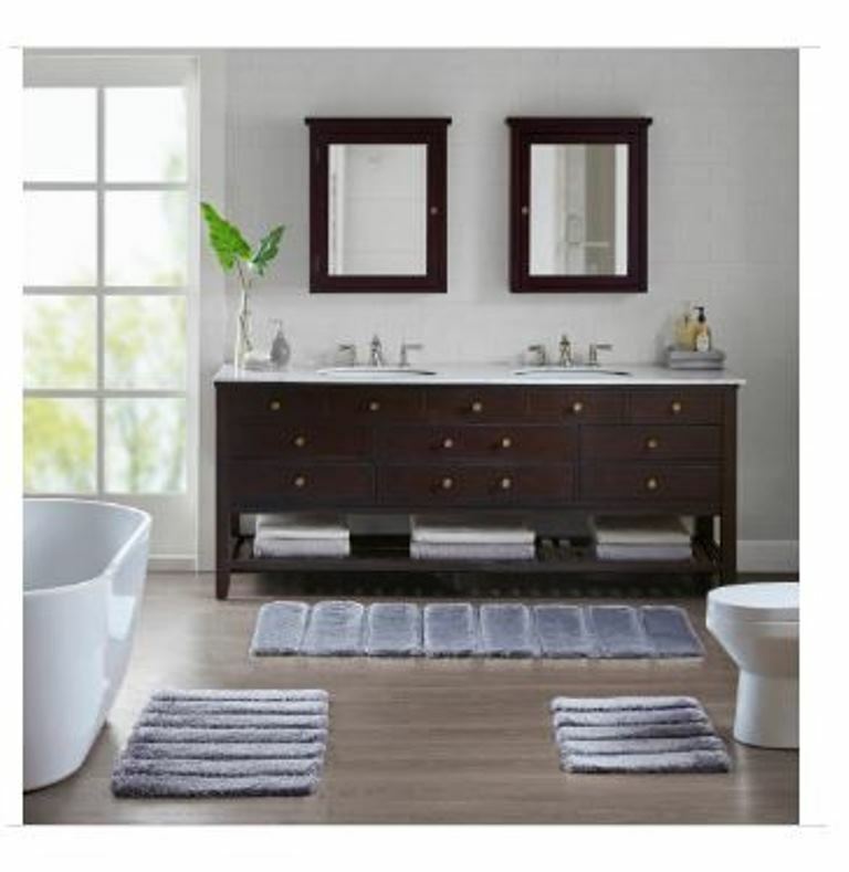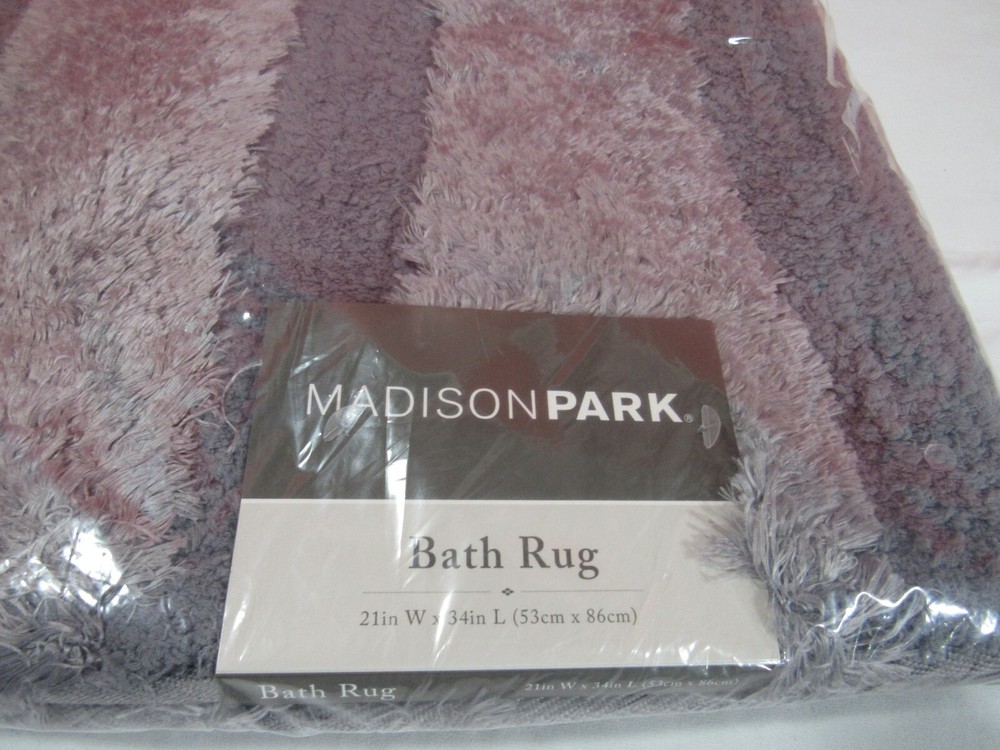 Madison Park Tufted Pearl Channel 21" X 34" Bath Rug-Grey T4102511 Transform your bathroom with the irresistibly soft Madison Park Tufted Pearl Channel Rug. The 1500GSM tufted rug features a high-low stripe design, in an ivory color, made from macro spun fibers to create a charmingly casual look with a soft hand feel. Long-lasting and durable, this bath rug is stain resistant and machine washable to make cleaning a breeze. 21" x 34" Stain Resistant Polyester, tufted Machine washable Imported