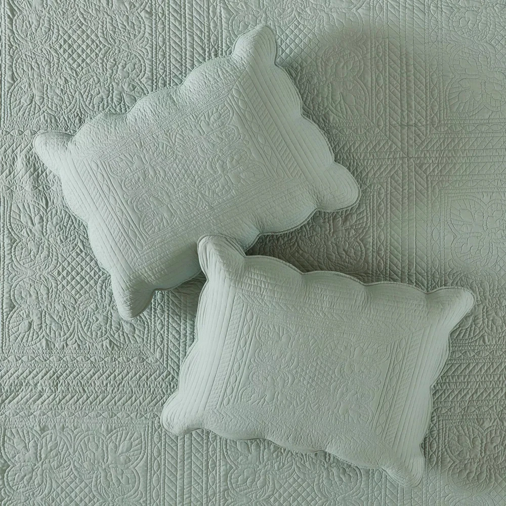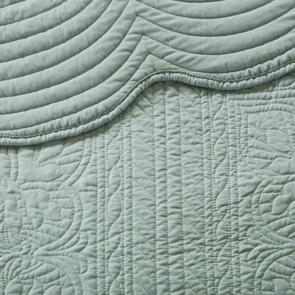 Madison Park Tuscany is the perfect coverlet to use as a layering piece or an alternative to your comforter for a new solid look. The decorative stitch pattern pairs easily with your existing décor and will sure to add a new decorative element to your bedroom with the beautiful scalloped edges. This coverlet is filled with cotton filling and features a polyester microfiber fabrication on the face and the reverse. Its prewash finish gives a worn in appearance to this decorative bedding. Set includes: Coverlet, 2 standard shams. Dimensions: coverlet: 94" x 96", standard sham (2):20" x 26" Madison Park Tuscany 3 Piece Coverlet Set Retail Price $220.00 On Sale Now $ 65.00 Madison Park Tuscany is the perfect coverlet to use as a layering piece or an alternative to your comforter for a new solid look. The decorative stitch pattern pairs easily with your existing décor and will sure to add a new decorative element to your bedroom with the beautiful scalloped edges. This coverlet is filled with cotton filling and features a polyester microfiber fabrication on the face and the reverse. Its prewash finish gives a worn in appearance to this decorative bedding. Set includes: Coverlet, 2 standard shams. Dimensions: coverlet: 94" x 96", standard sham (2):20" x 26" 100% Authentic - New with tags Color: Seafoam Size: Full/Queen Fabric Composition: 100% Polyester; Coverlet fill: Cotton, polyester Number: MP13-6119 Origin: China Care: Machine wash