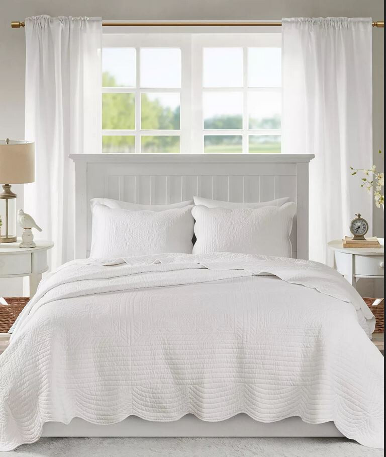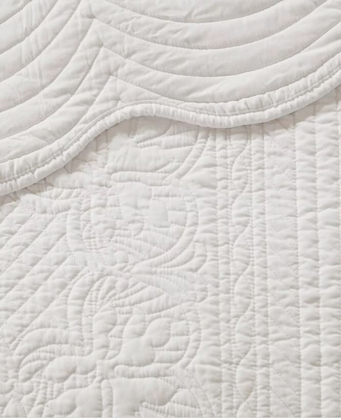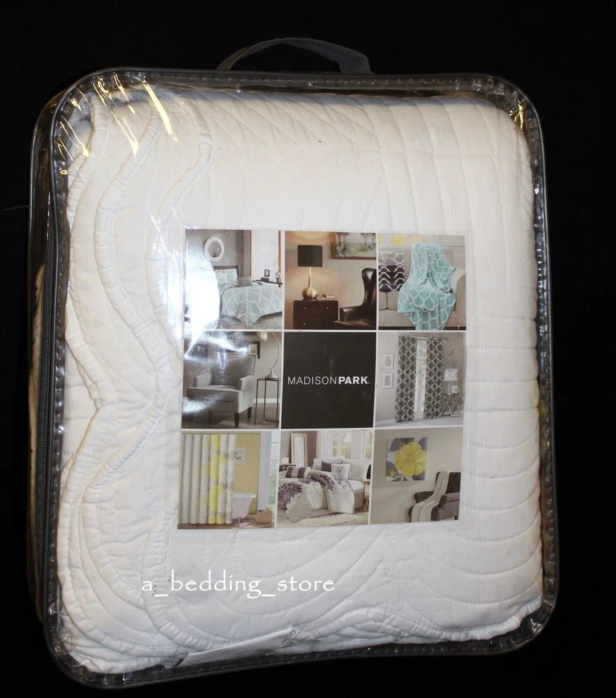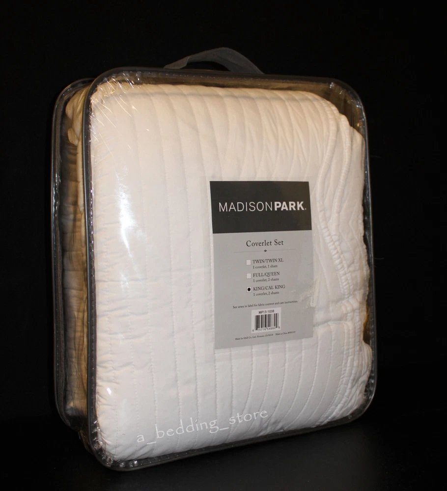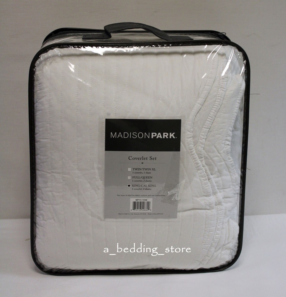 Madison Park Tuscany 3pc KING / Cal King Solid White Matelasse Quilted Coverlet Description New in Opened Packaging * No longer factory folded. * Brand: Madison Park Collection: "Tuscany" (1) King / Cal King Coverlet and (2) King Pillow shams Manufacturer's Name for Color: White Madison Park Tuscany is the perfect coverlet to use as a layering piece or an alternative to your comforter for a new solid look. The decorative stitch pattern pairs easily with your existing décor and will sure to add a new decorative element to your bedroom with the beautiful scalloped edges. This coverlet is filled with cotton filling and features a polyester microfiber fabrication on the face and the reverse. Its prewash finish gives a worn in appearance to this decorative bedding. 1 Coverlet:108" x 96" 2 King shams:20" x 36" Face and Back: 100% Polyester Fill: 90% cotton / 10% Olefin Scalloped Edges Machine Washable Retail Price $280 View My Other Items For Sale My Source I purchase store displays, customer returns, open packages, distressed packages, overstocks, out of season items & discontinued goods. I check over each piece; if there are any flaws, stains, tears or issues of any kind, they will be noted and photographed. Most items will need to be ironed. Shipping If FedEx is a shipping option, please note that Alaska, Hawaii and Post Office Boxes are excluded; be sure to select a USPS shipping option instead.