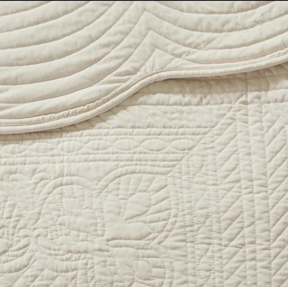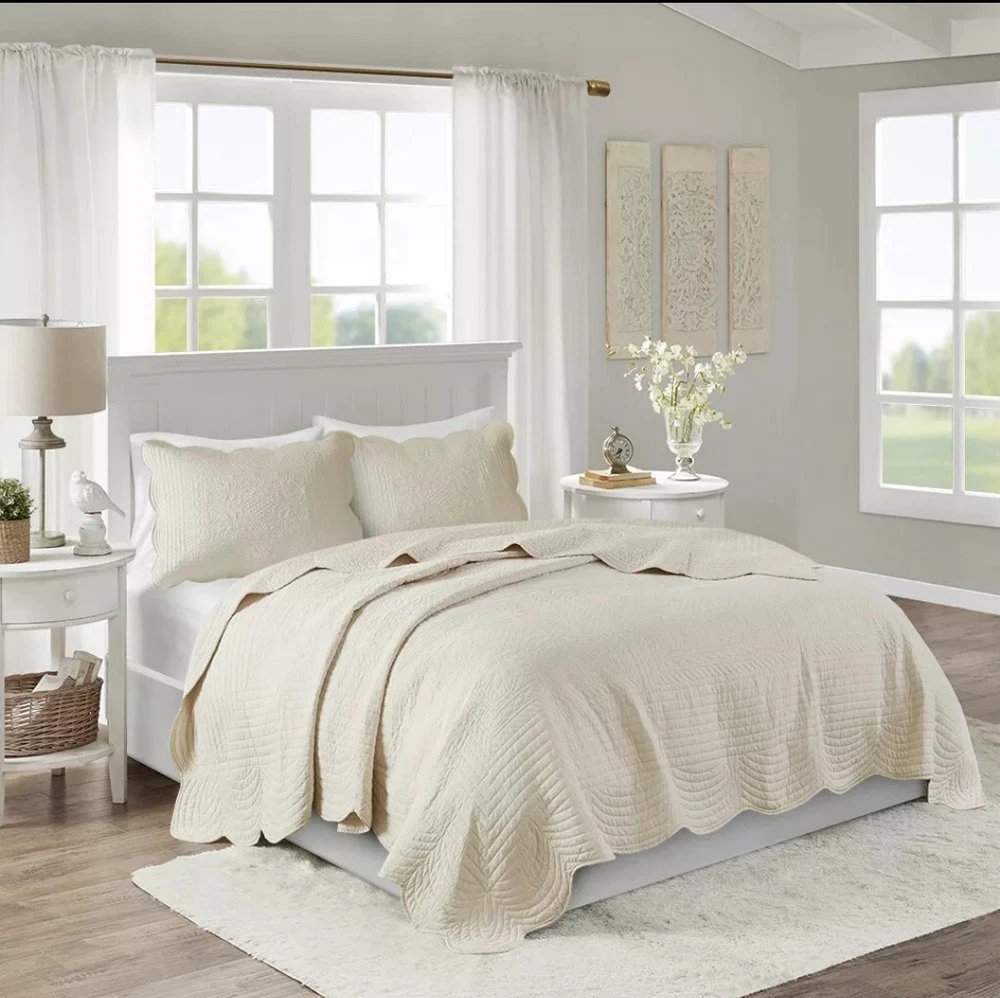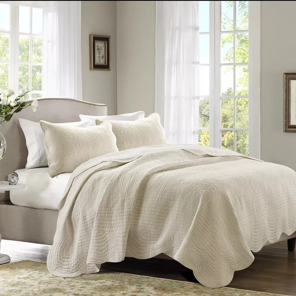 DESCRIPTION The Madison Park Tuscany 3 Piece Reversible Scalloped Edge Quilt Set is perfect as a layering piece or as an alternative to your comforter for a charming country look. The quilt and shams flaunt a classic stitch pattern with scalloped edges that add an elegant touch to your bedroom. This reversible quilt is filled with cotton filling and features a soft microfiber face, giving your bed a cozy cottage look. This farmhouse-inspired quilt also has an antimicrobial treatment that provides built-in freshness protection, reducing the growth of odor causing bacteria to keep fabric lasting longer. FEATURES • Set includes 1 quilt and 2 matching shams • Prewash Finish; Soft brushed microfiber face and back, 90% cotton, 10% other fibers fill • Cottage/country style reversible quilt set featuring an intricate patterned stitching with scalloped edges • Lightweight and easy to coordinate - perfect by itself for summer usage or for layering in the winter • Machine washable for easy care • Hypoallergenic polyester filling contains no allergens and is dust proof • Antimicrobial treatment to keep the bedding fresher for longer by inhibiting bacteria growth MATERIAL Quilt/Sham: Soft brushed Microfiber face and back Filling: 90% Cotton, 10% Other fibers filling King/California King Quilt Set includes: 1 Quilt: 108"W x 96"L 2 King Shams: 20"W x 36"L