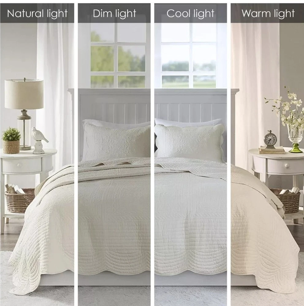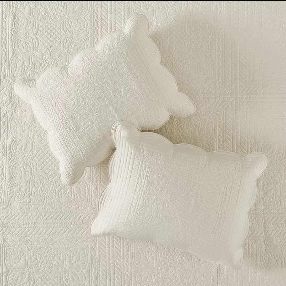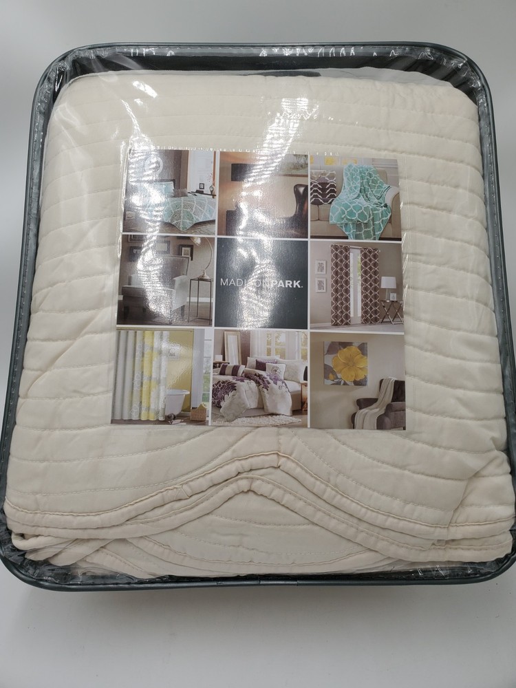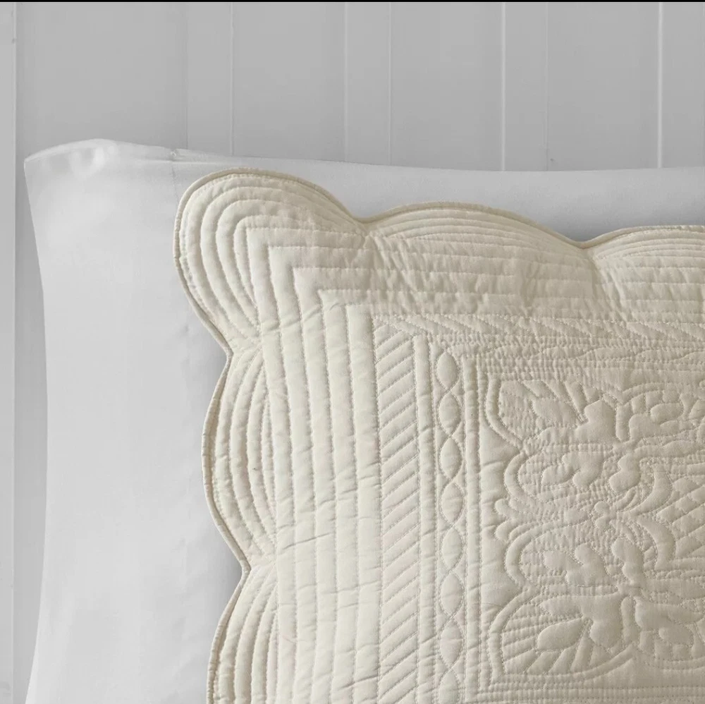 DESCRIPTION The Madison Park Tuscany 3 Piece Reversible Scalloped Edge Quilt Set is perfect as a layering piece or as an alternative to your comforter for a charming country look. The quilt and shams flaunt a classic stitch pattern with scalloped edges that add an elegant touch to your bedroom. This reversible quilt is filled with cotton filling and features a soft microfiber face, giving your bed a cozy cottage look. This farmhouse-inspired quilt also has an antimicrobial treatment that provides built-in freshness protection, reducing the growth of odor causing bacteria to keep fabric lasting longer. FEATURES • Set includes 1 quilt and 2 matching shams • Prewash Finish; Soft brushed microfiber face and back, 90% cotton, 10% other fibers fill • Cottage/country style reversible quilt set featuring an intricate patterned stitching with scalloped edges • Lightweight and easy to coordinate - perfect by itself for summer usage or for layering in the winter • Machine washable for easy care • Hypoallergenic polyester filling contains no allergens and is dust proof • Antimicrobial treatment to keep the bedding fresher for longer by inhibiting bacteria growth MATERIAL Quilt/Sham: Soft brushed Microfiber face and back Filling: 90% Cotton, 10% Other fibers filling King/California King Quilt Set includes: 1 Quilt: 108"W x 96"L 2 King Shams: 20"W x 36"L