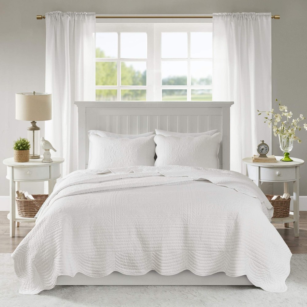 Cottage Quilt Set: Elevate your décor with a charming coastal elegance quilt, featuring embossed damask quilting & a scalloped edge. Oversized coverage for added comfort & complete with matching shams, it's perfect for a charming update Cotton Filling Quilt: Embrace the softness of pre-washed brushed microfiber and cotton-filling in this lofty and breathable, all-season quilt set, perfect for cozy nighttime summer snuggles or as an extra layer of warmth and comfort in the winter season Quality Feel: This quilt set features high-quality stitching and material, and elegant damask quilting designed to prevent clumping while enhancing durability. Hygienically treated for lasting freshness and cozy comfort Set includes: 1 Coverlet: 108"W x 96"L, 2 King Shams: 20"W x 36"L DURABLE & EASY CARE: Our microfiber quilt set offers durability to withstand daily wear and tear. Simply machine wash cold. Gently and separately. Do not bleach, Tumble dry low. Iron on medium temperature if needed