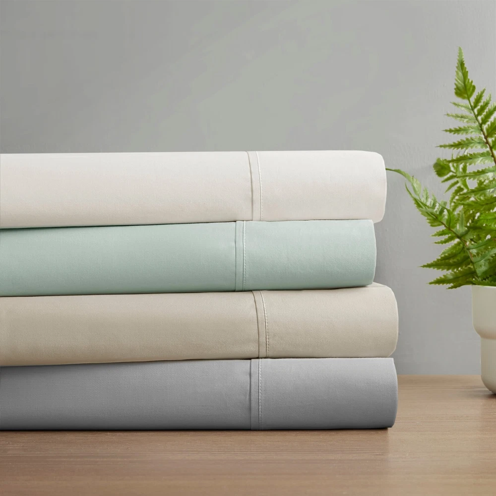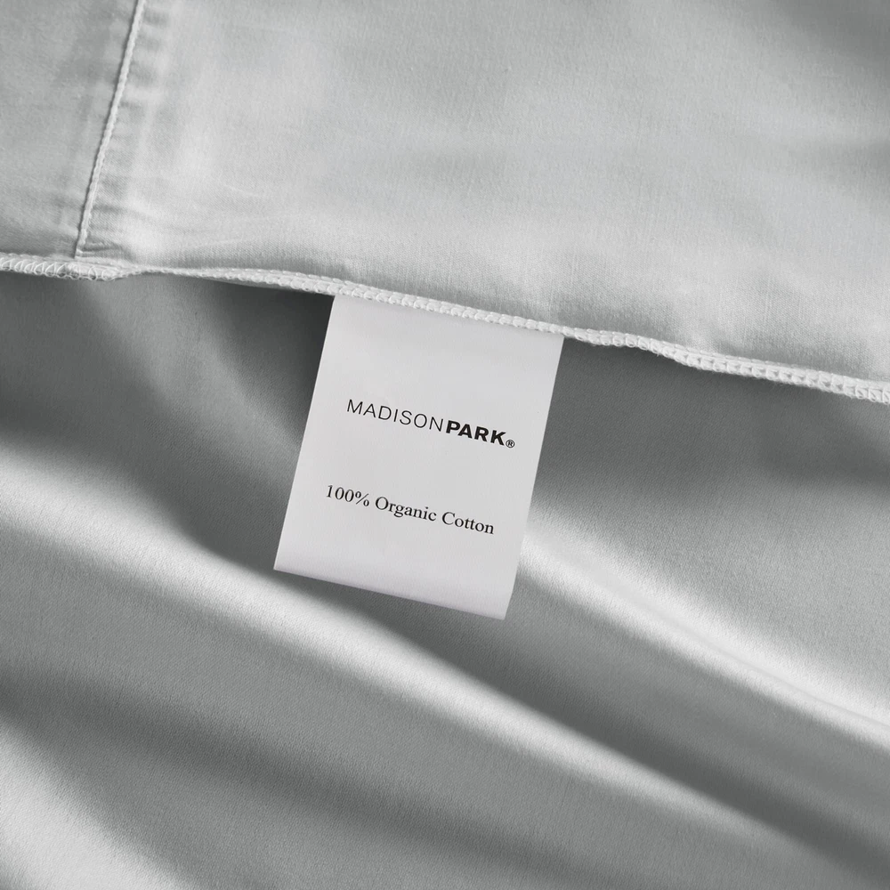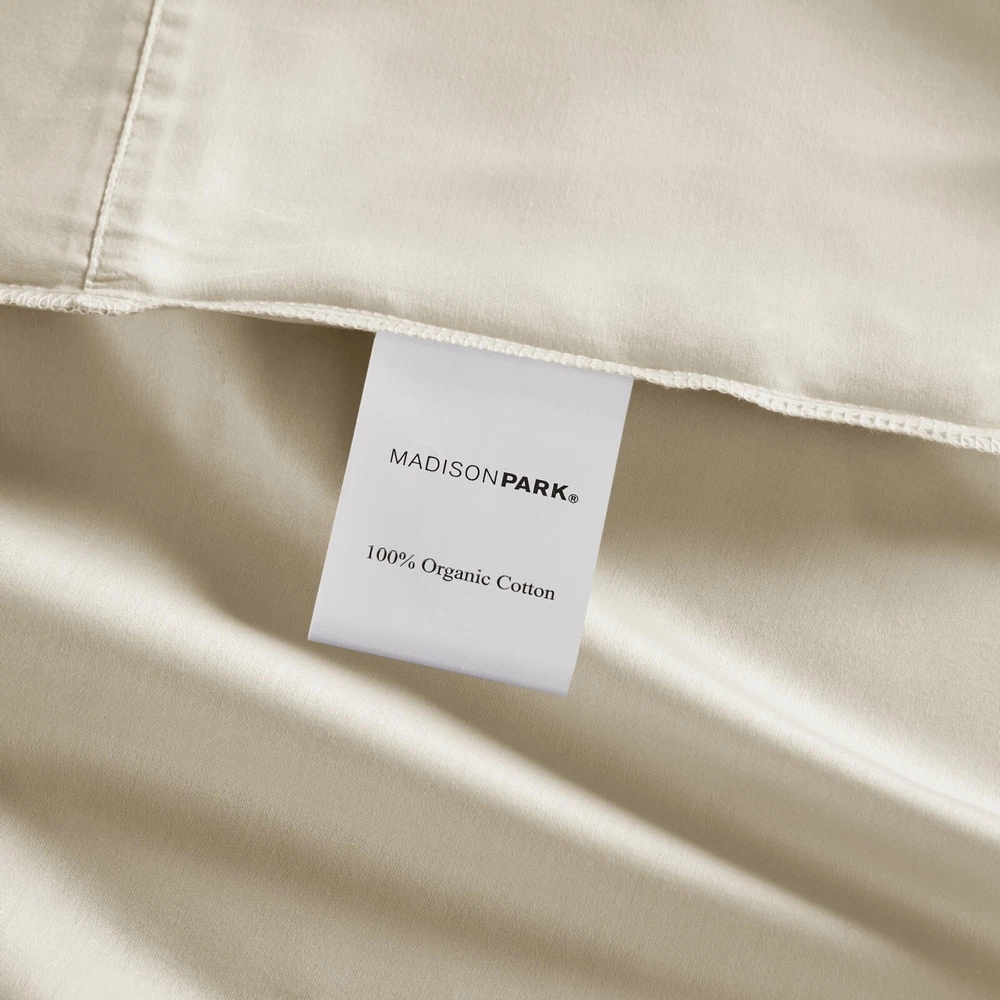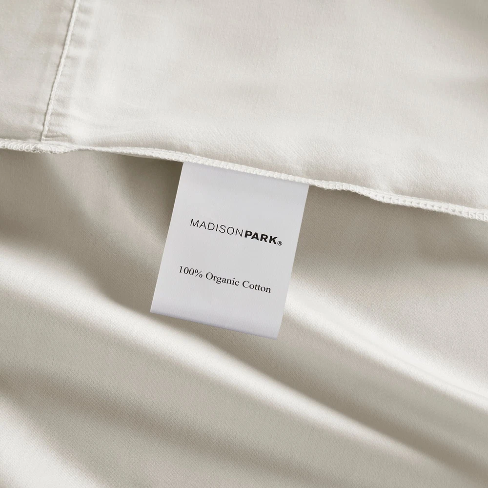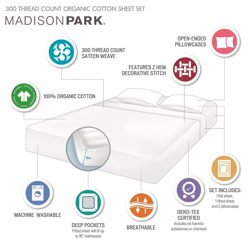 Madison Park Ultra-Soft 100% Organic Cotton Deep Pocket Sheet Set Queen King DESCRIPTION Looking for the perfect ultra soft cotton sheets? You'll love our 300 Thread Count Organic Cotton sheet set! Made of 100% organic cotton, this set has a buttery smooth hand feel with a sateen weave that will make you feel pampered every time you crawl into bed. The breathable fabric helps keep you comfortable so you can rest easy all night long. Plus, our deep pocket fitted sheet will fit mattresses up to 18", making it perfect for any size bed. The Z-style hem stitching adds a decorative touch, while also adding durability to the seams. Machine washable for easy care, this cotton sheet set is also OEKO-TEX certified, meaning it does not contain any harmful substances or chemicals to ensure quality comfort and wellness. FEATURES • 300 Thread Count Sateen Weave, GOTS certified 100% organic cotton • Ultra-soft hand feel, natuarally breathable fabric • Set includes flat sheet, fitted sheet and 2 pillowcases • Deep pocket fitted sheet will fit up to 18" mattresses, comes fully elasticized for better coverage and fit • Pillowcases are open ended on one side • Features a Z hem decorative stitch • In our efforts to reduce plastic, this product comes in a reusable, organic cotton bag • Machine washable for easy care • OEKO-TEX Certified, includes no harmful substances or chemicals MATERIAL 100% Organic Cotton Available Sizes: Queen Sheet Set includes: 1 Flat Sheet: 90"W x 102"L 2 Standard Pillowcases: 20"W x 32"L 1 Fitted Sheet: 60"W x 80"L + 16"D King Sheet Set includes: 1 Flat Sheet: 108"W x 102"L 2 King Pillowcases: 20"W x 40"L 1 Fitted Sheet: 78"W x 80"L + 16"D
