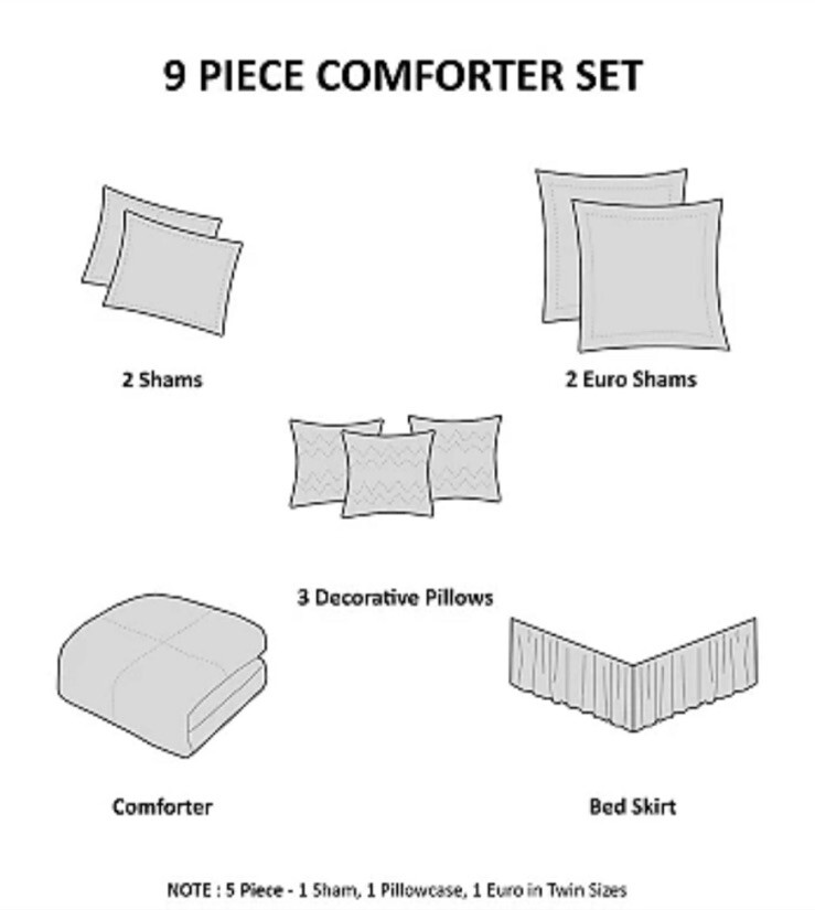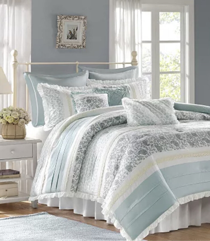 Madison Park Vanessa Blue Multi 9pc Comforter Set King NIP. Set Includes: One Comforter - 104” x 92in. Two King Shams - 20in. X 36in. Bedskirt - 78in. X 80in. X 15in. Drop Two Euro Shams - 26in. X 26in. Oblong decorative pillow - 12in. X 18in. Large square pillow - 18in. X 18in. Small square pillow - 16in. X 16in. Brand new Retail - $399.99