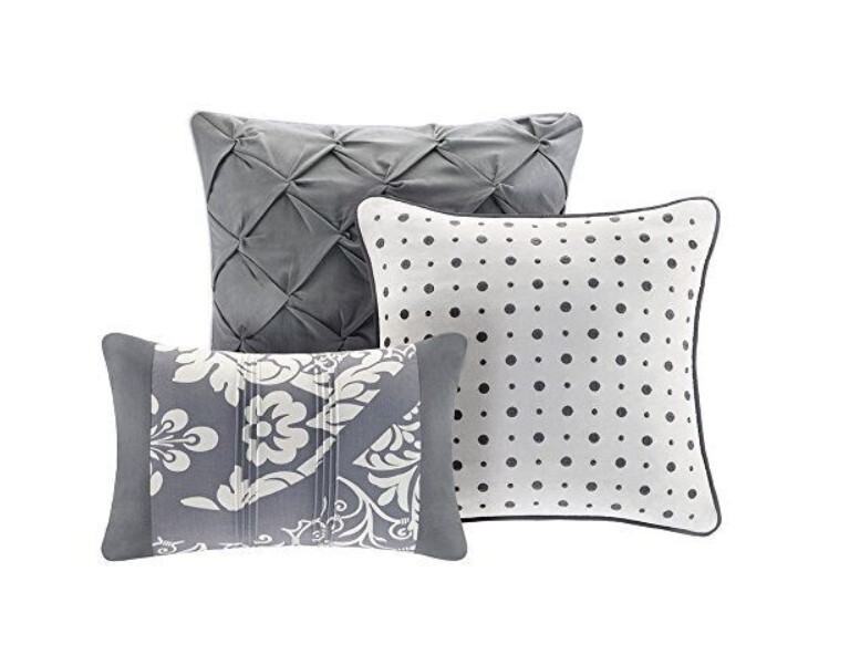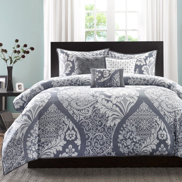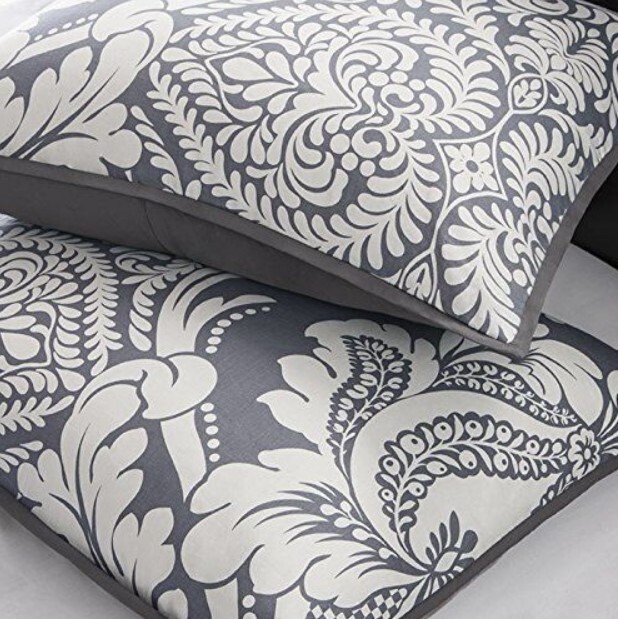 The Madison Park Vienna 6 Piece Printed Duvet Cover Set offers an eye-catching update to your bedroom dandeacute;cor. A beautifully intricate damask pattern is flaunted across the duvet cover and shams, for a chic transitional look. The solid reverse perfectly complements the top of the bed, while the flange border adds a charming accent to the duvet cover. Three decorative pillows with embroidered details and fabric manipulation complete the duvet cover set. Made from 100% cotton sateen, this bedding set is Fibr-Tec certified, meaning it does not contain any harmful substances or chemicals to ensure quality comfort and wellness. A button closure helps secure a comforter insert within the duvet cover and inside ties in the corners help prevent it from shifting (insert is NOT included).