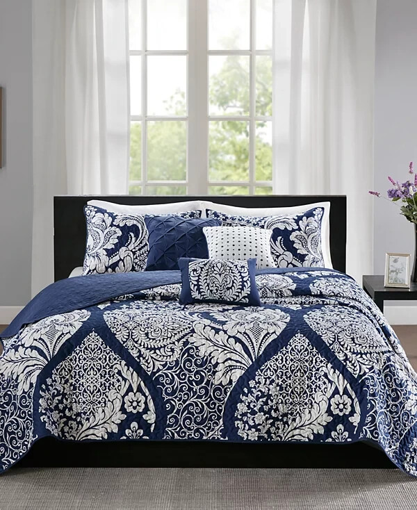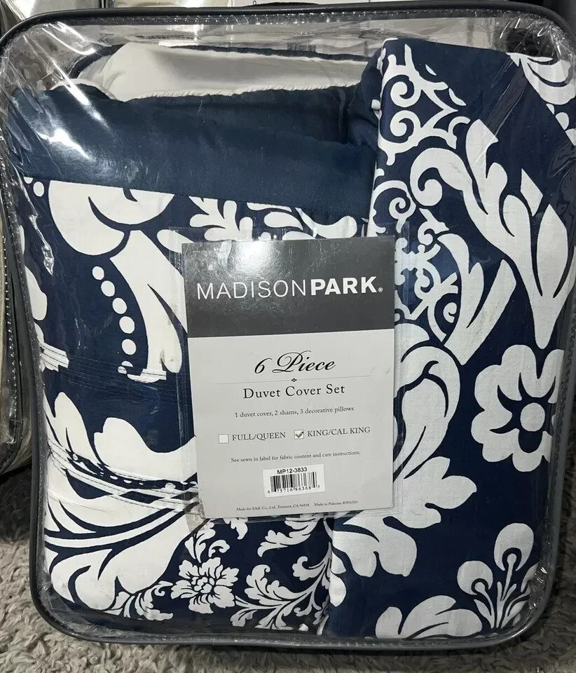 Add relaxing calm to your room with the Vienna duvet cover set from Madison Park, featuring an intricate pattern within an oversized ogee motif, while the soft touch of cotton adds to the overall charm. Product Features Set includes: duvet cover (104" x 92"), three decorative pillows (18" x 18", 16" x 16", 12" x 16") and two king shams (20" x 36") Oversized ogee motif Duvet/sham: cotton; Thread count: 200, reverses to 180; pillow: cotton; Thread count: 180; pillow fill: polyester Machine washable. Spot clean pillows. Imported OEKO-TEX® Standard 100