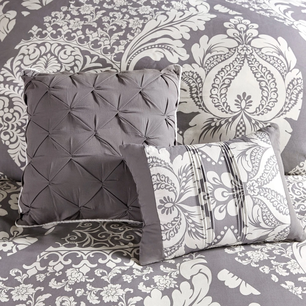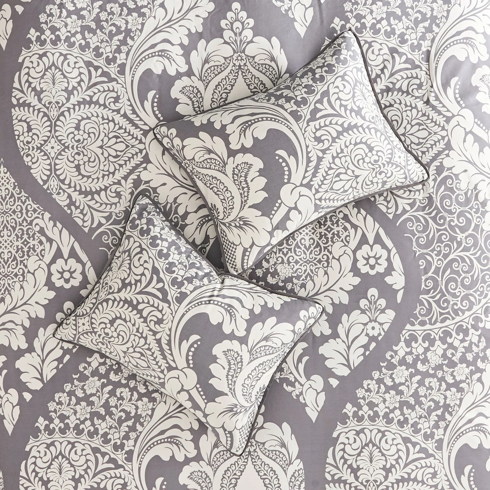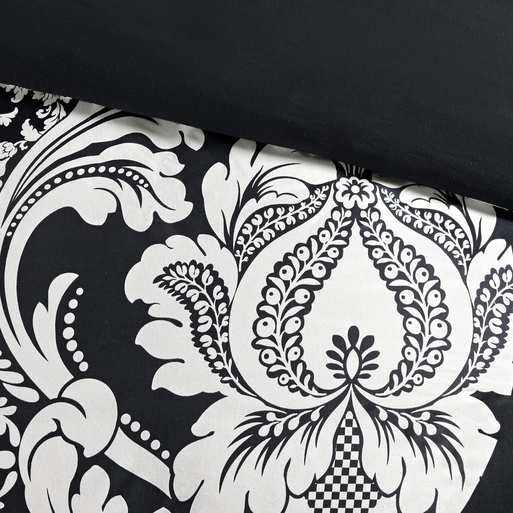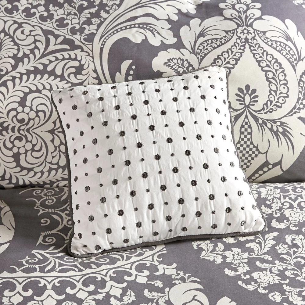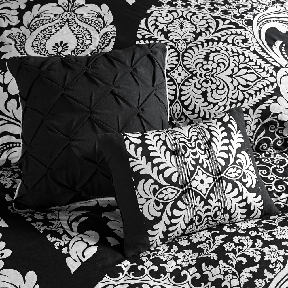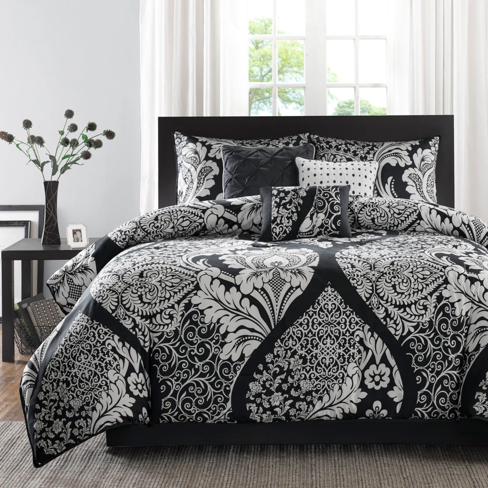 Store Categories Store Categories Bedding Comforters Decorative Pillows Duvet Covers Quilts & Coverlets Sheets Blankets & Throws Mattress Pads Pillows Home Decor Window Treatments Wall Art Home Accents Furniture Beds Dining Seating Ottomans & Benches Accent Chairs Accent Tables Dining Tables Sofas Bath Bath Robes Shower Curtains Towels Bath Rugs Bath Accessories Apparel Pajama Sets Nightgowns Rugs Rugs & Carpets Lighting Lamp Pendant Other Product Overview Details DESCRIPTION The Madison Park Vienna 7 Piece Cotton Printed Comforter Set offers an eye-catching update to your bedroom decor. A beautifully intricate damask pattern is flaunted across the comforter and shams, for a chic transitional look. The solid reverse perfectly complements the top of the bed, while the flange border adds a charming accent to the comforter. Three decorative pillows with embroidered details and fabric manipulation and a solid bed skirt complete the comforter set. Made from 100% cotton sateen, this bedding set is OEKO-TEX certified, meaning it does not contain any harmful substances or chemicals to ensure quality comfort and wellness. FEATURES • Transitional 7 piece cotton printed comforter set • Features Intricate damask design in black and white contrasted colors and solid black color on the reverse • Embroidery and fabric manipulation details on decorative pillows • Set includes 1 comforter, 2 matching shams, 3 decorative pillows and 1 bedskirt • Hypoallergenic polyester filling in the comforter and pillow (filling contains no allergens and is treated to be dustproof) • Oeko-Tex Certified, includes no harmful substances or chemicals • Machine washable for easy care; Steam iron for wrinkle removal • Items in this set may come in rolled or compressed packaging and will need to be fluffed up MATERIAL Comforter/Sham: 200TC Cotton sateen, printed Reverse/Bed Skirt: 180TC Cotton/polyester crossweave backing Fill: 8oz/aq yard Polyester filling Pillow: 180TC Cotton/polyester cover with polyester filling Available Sizes: Queen Comforter Set includes: 1 Comforter: 90"W x 90"L 2 Standard Shams: 20"W x 26"L + 2"D 1 Bedskirt: 60"W x 80"L + 15"D 1 Decorative Pillow: 18"W x 18"L 1 Decorative Pillow: 16"W x 16"L 1 Decorative Pillow: 12"W x 16"L King Comforter Set includes: 1 Comforter: 104"W x 92"L 2 King Shams: 20"W x 36"L + 2"D 1 Bedskirt: 78"W x 80"L + 15"D 1 Decorative Pillow: 18"W x 18"L 1 Decorative Pillow: 16"W x 16"L 1 Decorative Pillow: 12"W x 16"L California King Comforter Set includes: 1 Comforter: 104"W x 92"L 2 King Shams: 20"W x 36"L + 2"D 1 Bedskirt: 72"W x 84"L + 15"D 1 Decorative Pillow: 18"W x 18"L 1 Decorative Pillow: 16"W x 16"L 1 Decorative Pillow: 12"W x 16"L Bedding Comforters Decorative Pillows Duvet Covers Quilts & Coverlets Sheets Blankets & Throws Mattress Pads Pillows Home Decor Window Treatments Wall Art Home Accents Furniture Beds Dining Seating Ottomans & Benches Accent Chairs Accent Tables Dining Tables Sofas Bath Bath Robes Shower Curtains Towels Bath Rugs Bath Accessories Rugs Rugs & Carpets Lighting Lamp Pendant Product Overview Product Details DESCRIPTION The Madison Park Vienna 7 Piece Cotton Printed Comforter Set offers an eye-catching update to your bedroom decor. A beautifully intricate damask pattern is flaunted across the comforter and shams, for a chic transitional look. The solid reverse perfectly complements the top of the bed, while the flange border adds a charming accent to the comforter. Three decorative pillows with embroidered details and fabric manipulation and a solid bed skirt complete the comforter set. Made from 100% cotton sateen, this bedding set is OEKO-TEX certified, meaning it does not contain any harmful substances or chemicals to ensure quality comfort and wellness. FEATURES • Transitional 7 piece cotton printed comforter set • Features Intricate damask design in black and white contrasted colors and solid black color on the reverse • Embroidery and fabric manipulation details on decorative pillows • Set includes 1 comforter, 2 matching shams, 3 decorative pillows and 1 bedskirt • Hypoallergenic polyester filling in the comforter and pillow (filling contains no allergens and is treated to be dustproof) • Oeko-Tex Certified, includes no harmful substances or chemicals • Machine washable for easy care; Steam iron for wrinkle removal • Items in this set may come in rolled or compressed packaging and will need to be fluffed up MATERIAL Comforter/Sham: 200TC Cotton sateen, printed Reverse/Bed Skirt: 180TC Cotton/polyester crossweave backing Fill: 8oz/aq yard Polyester filling Pillow: 180TC Cotton/polyester cover with polyester filling Available Sizes: Queen Comforter Set includes: 1 Comforter: 90"W x 90"L 2 Standard Shams: 20"W x 26"L + 2"D 1 Bedskirt: 60"W x 80"L + 15"D 1 Decorative Pillow: 18"W x 18"L 1 Decorative Pillow: 16"W x 16"L 1 Decorative Pillow: 12"W x 16"L King Comforter Set includes: 1 Comforter: 104"W x 92"L 2 King Shams: 20"W x 36"L + 2"D 1 Bedskirt: 78"W x 80"L + 15"D 1 Decorative Pillow: 18"W x 18"L 1 Decorative Pillow: 16"W x 16"L 1 Decorative Pillow: 12"W x 16"L California King Comforter Set includes: 1 Comforter: 104"W x 92"L 2 King Shams: 20"W x 36"L + 2"D 1 Bedskirt: 72"W x 84"L + 15"D 1 Decorative Pillow: 18"W x 18"L 1 Decorative Pillow: 16"W x 16"L 1 Decorative Pillow: 12"W x 16"L