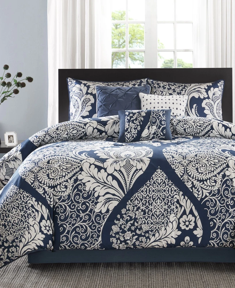 View More Madison Park Items Madison Park Vienna Cotton 7-Pc. Queen Comforter Set Bedding, Indigo Add relaxing calm to your room with the Vienna comforter set from Madison Park, featuring an intricate pattern within an oversized ogee motif, while the soft touch of cotton adds to the overall charm. Set includes: comforter (90" x 90"), three decorative pillows (18" x 18", 16" x 16", 12" x 16"), bedskirt (60" x 80" x 15") and two standard shams (20" x 26") Oversized ogee motif Comforter/sham: cotton, reverses to cotton/polyester; Thread count: 200, reverses to 180; bedskirt/pillow cover: cotton/polyester; Thread count: 180; comforter fill: polyester 270 grams per square meter; pillow fill: polyester Machine washable. Spot clean pillows. Imported Shipping Details Payment Information Customer Service Shipping Cost We generally ship FREE in USA, otherwise please look item shipping info. For international buyers we welcome combining. Delivery Time We generally ship same business day, expedite shipping if otherwise stated. International Buyers Import duties, taxes, and charges are not included in the item price or shipping cost. These charges are the buyer's responsibility. Please check with your country's customs office to determine what these additional costs will be prior to bidding or buying. We accept the PayPal Please contact us if you have any questions. Product Information Feel free to ask for more photos & info Product photos are assumed to be part of the description. Contact Information You can contact us anytime before & after purchase We wil reply your message in 24h. FAST'N FREE shipping to USA EASY RETURNS in 30 days 100% AUTHENTIC large inventory 100% CUSTOMER satisfaction guarantee Private Sellers Network Our aim is; To serve best products of famous brands with reasonable prices to our customers. All our products are authentic. Please take a look our other merchandise and follow us. "Your happiness is our joy..." Visit Store Sign Up for Newsletter View Reviews