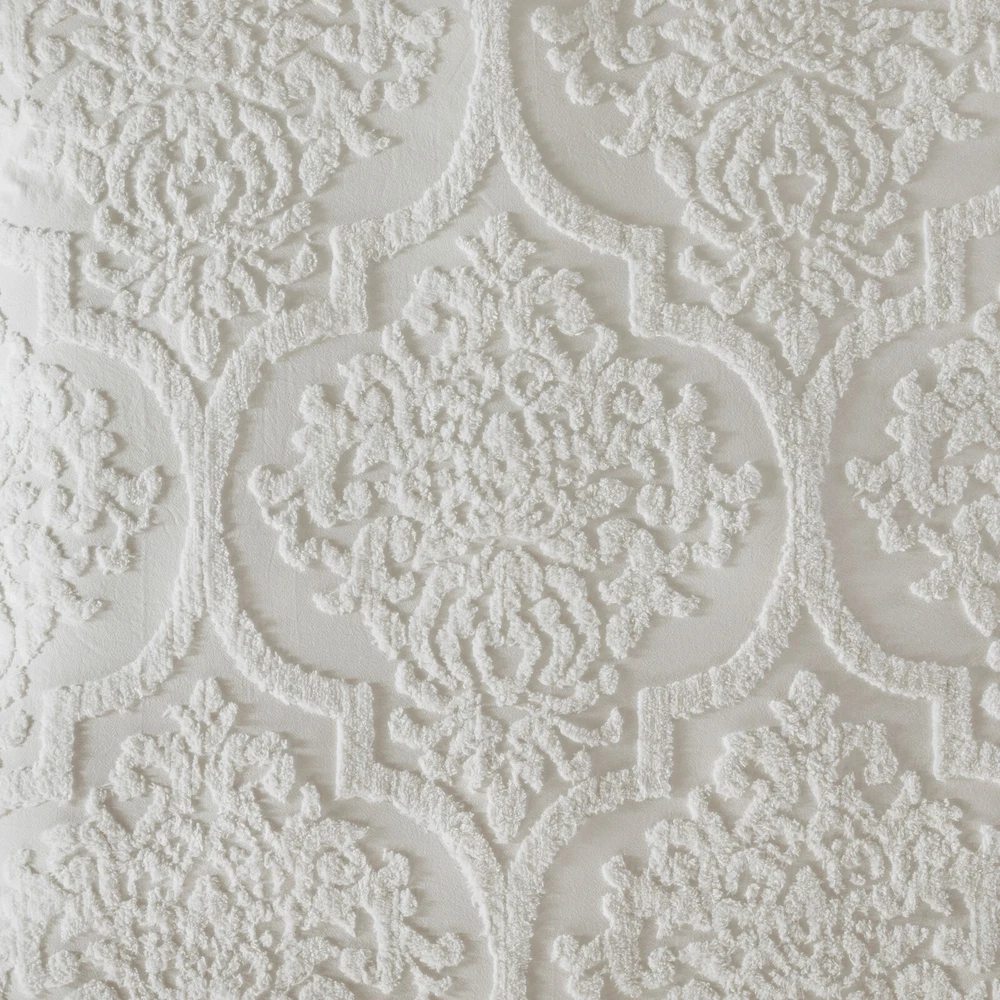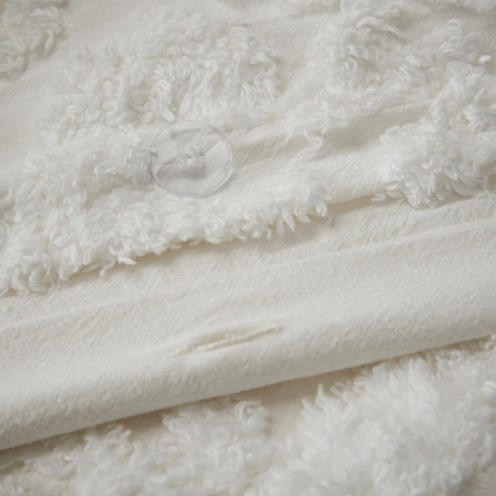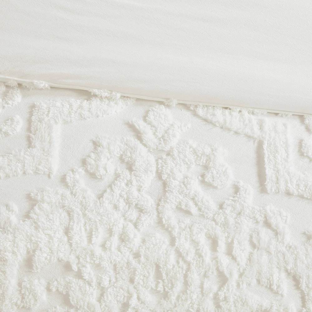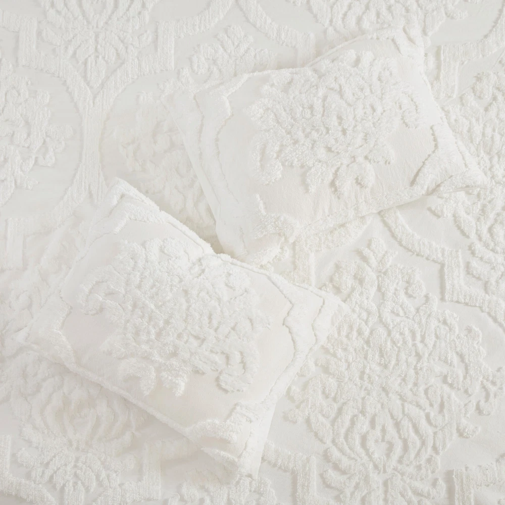 Store Categories Store Categories Bedding Comforters Decorative Pillows Duvet Covers Quilts & Coverlets Sheets Blankets & Throws Mattress Pads Pillows Home Decor Window Treatments Wall Art Home Accents Furniture Beds Dining Seating Ottomans & Benches Accent Chairs Accent Tables Dining Tables Sofas Bath Bath Robes Shower Curtains Towels Bath Rugs Bath Accessories Apparel Pajama Sets Nightgowns Rugs Rugs & Carpets Lighting Lamp Pendant Other Product Overview Details DESCRIPTION The Madison Park Viola 3 Piece Tufted Cotton Chenille Damask Duvet Cover Set offers the perfect cottage touch to your bedroom décor. A tufted chenille damask design is beautifully displayed on the 100% cotton duvet cover and matching shams, for a soft shabby chic look. Machine washable for easy care, this bedding set is OEKO-TEX certified, meaning it does not contain any harmful substances or chemicals to ensure quality comfort and wellness. A button closure secures a comforter insert within the duvet cover and inside corner ties prevent it from shifting (insert is NOT included). Due to the nature of the chenille fabric, some shedding will occur naturally in the first 3-4 washes. FEATURES • Shabby chic cotton chenille damask duvet cover set in white • Set includes duvet cover and 2 matching shams • Inside corner ties to secure the insert, button closure • Duvet cover does not include insert • Oeko-Tex Certified, includes no harmful substances or chemicals (# 19.HIN.73178) • Machine washable • Due to the nature of the chenille fabric, some shedding will occur naturally in the first 3-4 washes MATERIAL Cotton chenille with tufted technique, cotton solid reverse Available Sizes: Full/Queen Duvet Cover Set includes: 1 Duvet Cover: 90"W x 90"L 2 Standard Shams: 20"W x 26"L King/California King Duvet Cover Set includes: 1 Duvet Cover: 104"W x 92"L 2 King Shams: 20"W x 36"L Bedding Comforters Decorative Pillows Duvet Covers Quilts & Coverlets Sheets Blankets & Throws Mattress Pads Pillows Home Decor Window Treatments Wall Art Home Accents Furniture Beds Dining Seating Ottomans & Benches Accent Chairs Accent Tables Dining Tables Sofas Bath Bath Robes Shower Curtains Towels Bath Rugs Bath Accessories Rugs Rugs & Carpets Lighting Lamp Pendant Product Overview Product Details DESCRIPTION The Madison Park Viola 3 Piece Tufted Cotton Chenille Damask Duvet Cover Set offers the perfect cottage touch to your bedroom décor. A tufted chenille damask design is beautifully displayed on the 100% cotton duvet cover and matching shams, for a soft shabby chic look. Machine washable for easy care, this bedding set is OEKO-TEX certified, meaning it does not contain any harmful substances or chemicals to ensure quality comfort and wellness. A button closure secures a comforter insert within the duvet cover and inside corner ties prevent it from shifting (insert is NOT included). Due to the nature of the chenille fabric, some shedding will occur naturally in the first 3-4 washes. FEATURES • Shabby chic cotton chenille damask duvet cover set in white • Set includes duvet cover and 2 matching shams • Inside corner ties to secure the insert, button closure • Duvet cover does not include insert • Oeko-Tex Certified, includes no harmful substances or chemicals (# 19.HIN.73178) • Machine washable • Due to the nature of the chenille fabric, some shedding will occur naturally in the first 3-4 washes MATERIAL Cotton chenille with tufted technique, cotton solid reverse Available Sizes: Full/Queen Duvet Cover Set includes: 1 Duvet Cover: 90"W x 90"L 2 Standard Shams: 20"W x 26"L King/California King Duvet Cover Set includes: 1 Duvet Cover: 104"W x 92"L 2 King Shams: 20"W x 36"L
