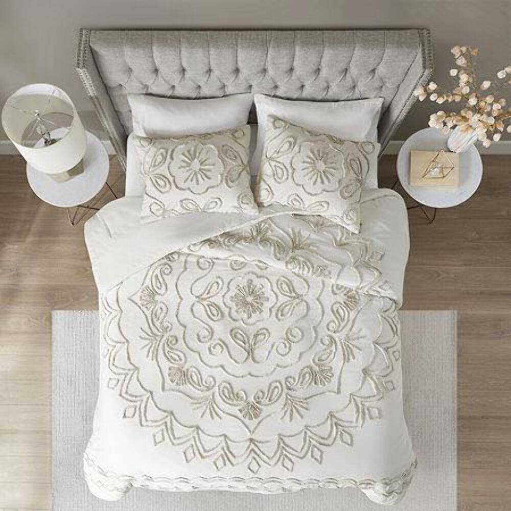 Madison Park Violette 3 Piece Tufted Cotton Chenille Comforter Set - King/Cal Ki - All Violette 3 Piece Tufted Cotton Chenille Comforter Set - King/Cal King by Madison Park The Madison Park Violette 3 Piece Tufted Cotton Chenille Comforter Set offers a globally inspired update to brighten your bedroom decor. A large tufted chenille medallion is displayed in the center of the comforter, creating an elegant textural look. Matching shams mirror the beautiful design on the comforter to complete the cotton bedding set. This bedding set is OEKO-TEX certified, meaning it does not contain any harmful substances or chemicals to ensure quality comfort and wellness. Due to the nature of the chenille fabric, some shedding will occur naturally in the first 3-4 washes. 100% Cotton Tufted Comforter Set King/Cal King: 104"W x 92"L/20"W x 36"L 2 Primary Color: Ivory/Taupe Comforter/Sham:Cotton chenille with tufted technique, cotton solid reverse. Filling: polyester filling. Includes: 1 Comforter 2 King Shams. Madison Park Violette 3 Piece Tufted Cotton Chenille Comforter Set - King/Cal Ki - All Violette 3 Piece Tufted Cotton Chenille Comforter Set - King/Cal King by Madison Park The Madison Park Violette 3 Piece Tufted Cotton Chenille Comforter Set offers a globally inspired update to brighten your bedroom decor. A large tufted chenille medallion is displayed in the center of the comforter, creating an elegant textural look. Matching shams mirror the beautiful design on the comforter to complete the cotton bedding set. This bedding set is OEKO-TEX certified, meaning it does not contain any harmful substances or chemicals to ensure quality comfort and wellness. Due to the nature of the chenille fabric, some shedding will occur naturally in the first 3-4 washes. 100% Cotton Tufted Comforter Set King/Cal King: 104"W x 92"L/20"W x 36"L 2 Primary Color: Ivory/Taupe Comforter/Sham:Cotton chenille with tufted technique, cotton solid reverse. Filling: polyester filling. Includes: 1 Comforter 2 King Shams. × Buy now and save! Shipping info Click the Shipping & Payments tab above the listing description for more info FREE Shipping Click the Shipping & Payments tab above the listing description for more info! Additional delivery notes PICK UP OPTION Sorry, our items are NOT available for pick-up. PAYMENT Immediate payment is required upon selecting "Buy It Now" or upon checking out through the cart. We accept payment via U.S. PayPal accounts and all Major Credit Cards, Debit Cards & Google Pay. We are legally required to collect sales tax in those states and localities where we maintain a physical presence (nexus). The applicable amount of sales tax charged to an order will be calculated based on the shipment destination's state and local sales tax laws. Thank you for shopping with us on eBay! Additional Information No additional information at this time Ask seller a question You might also like 90-Tooth SAE Ratcheting Flex-Head Combination Wrench Set with Tray (8-Piece) Weatherford Men's Medium Black Cotton/Poly Hoodie Sweatshirt with Front Pocket a #9 X 3 in. Green Exterior Self-Starting Star Flat Head Wood Deck Screws 5 Lbs. B Orley 1-Light Midnight Black Pendant Light with Clear Glass Globe Shade Contact To contact our Customer Service Team, simply click the button here and our Customer Service team will be happy to assist. Ask seller a question © My Store Shipping & Payments Shipping is FREE for this item Payment Accepted Payment Methods Immediate payment is required upon selecting "Buy It Now" or upon checking out through the cart. We accept payment via U.S. PayPal accounts and all Major Credit Cards, Debit Cards & Google Pay. We are legally required to collect sales tax in those states and localities where we maintain a physical presence (nexus). The applicable amount of sales tax charged to an order will be calculated based on the shipment destination's state and local sales tax laws. Thank you for shopping with us on eBay! Returns Returns are accepted Items must be returned within 30 days of the auction ending Buyer will pay for return shipping. eBay integration by