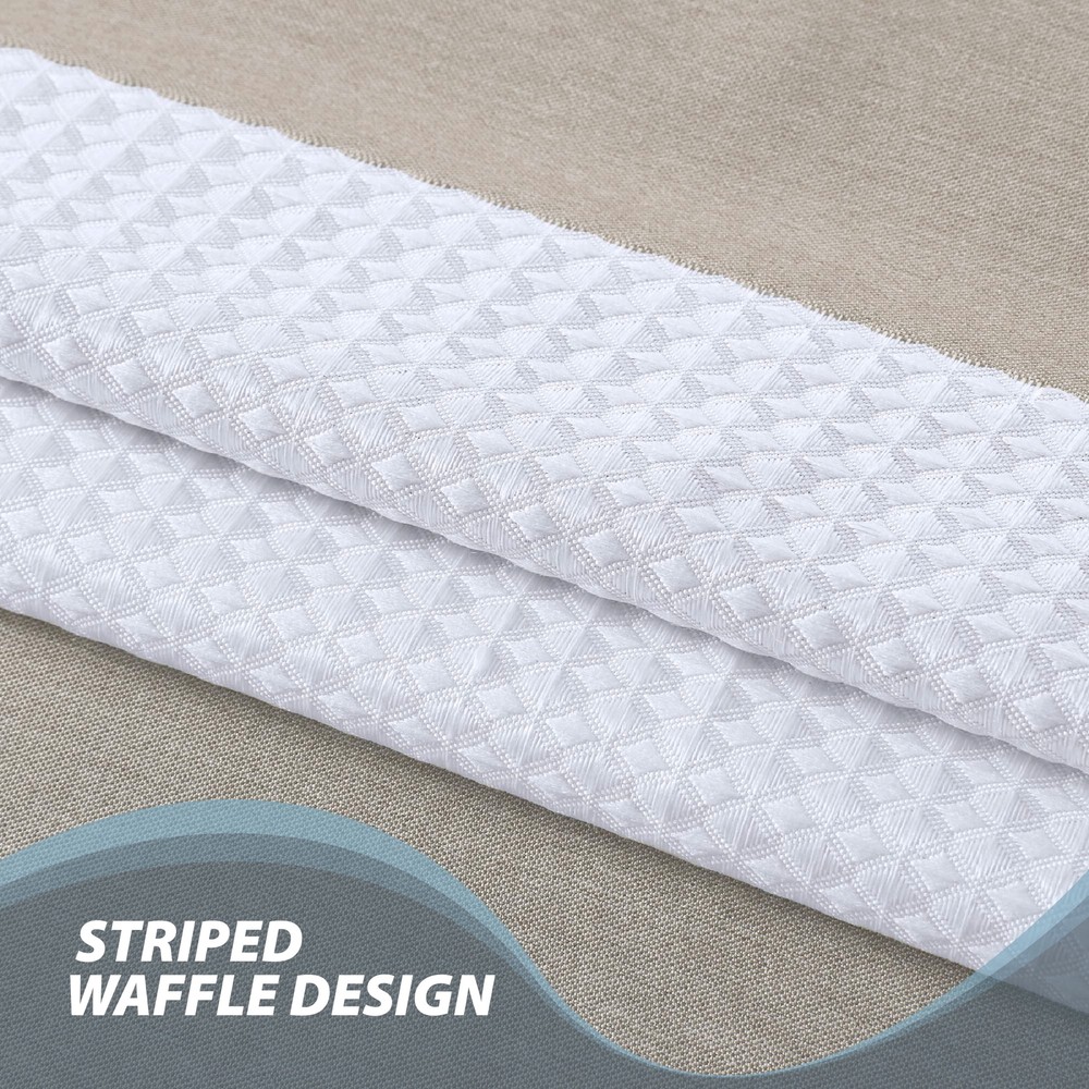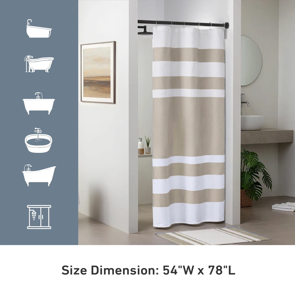 Refresh your bathroom décor with the Madison Park Waffle Shower Curtain. Featuring a sophisticated striped design, this striped shower curtain combines a heathered taupe fabric with a crisp white waffle weave, adding elegance to your bathroom. The curtain is treated with 3M Scotchgard to keep it looking fresh through multiple washes. Ideal for a variety of bathroom sizes, this long shower curtain measures 54"x78", offering an ideal fit for most spaces. Though hooks and rods aren't included, this shower curtain is a great choice to elevate your bathroom decor. Its modern, contemporary stripe design enhances the look of your bathroom shower curtains, making it a stylish addition to any space. The durable polyester fabric ensures long-lasting use, while the textured waffle weave offers a luxurious, spa-like feel. To maintain its fresh appearance, machine wash cold on a gentle cycle. Add a waterproof liner for extra protection and to keep your fabric shower curtains in top condition. Chic Design: This waffle shower curtain combines a modern striped pattern with a heathered taupe fabric and a crisp white waffle weave. The design adds a touch of elegance and complements various bathroom styles. Durable and Long-Lasting: Made from quality polyester fabric, the bathroom shower curtains are treated with 3M Scotchgard for water repellency. The treatment helps them maintain their fresh appearance through multiple washes. Elegant Texture: The waffle weave fabric gives this shower curtain a sophisticated texture, offering a luxurious spa-like feel. Its unique texture enhances the overall bathroom aesthetic, making it both functional and stylish. Ideal Size: Measuring 54" x 78", this long shower curtain is designed to fit most bathroom spaces. It provides excellent coverage while adding to your bathroom's overall charm. Easy to Care For: The fabric shower curtains are machine washable for easy maintenance. To keep your curtains looking fresh, simply wash them on a gentle cycle with cold water.