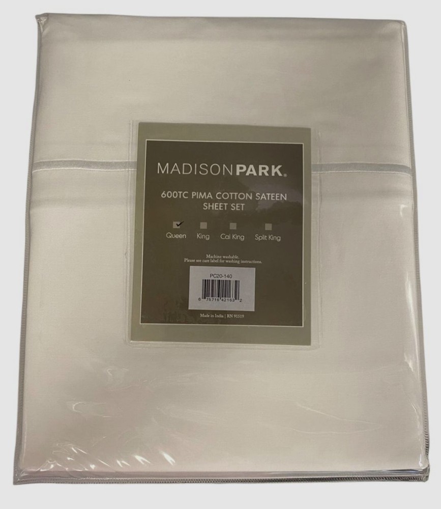 Madison Park White 600 Thread Count Sateen 4 Pc. Sheet Set Size Queen Description Flat Sheet, Fitted Sheet, 2 Pillowcases Flat Sheet: 90" x 102", Fitted Sheet: 60" x 80" + 15", 2 Standard Pillowcases: 20" x 30" 600 TC Fits mattresses up to 17" All cotton Machine washable Imported About Us We sell only 100% authentic clothing from new with tags to gently used. We have a 100% authentic or money back guarantee on every item we sell. Items are listed daily so make sure to put us on your favorite! We have been in business for over 10 years selling tens of thousands of designer items. We strive to meet your designer needs at a quality price! Payment Shipping Returns Payment accepted via paypal, credit/debit card. Shipping is usually within 24 hours of purchase (M-F). Super fast service. Tracked delivery. 100% satisfaction guaranteed. Please review our eBay return policy for more details.