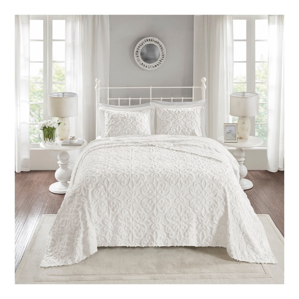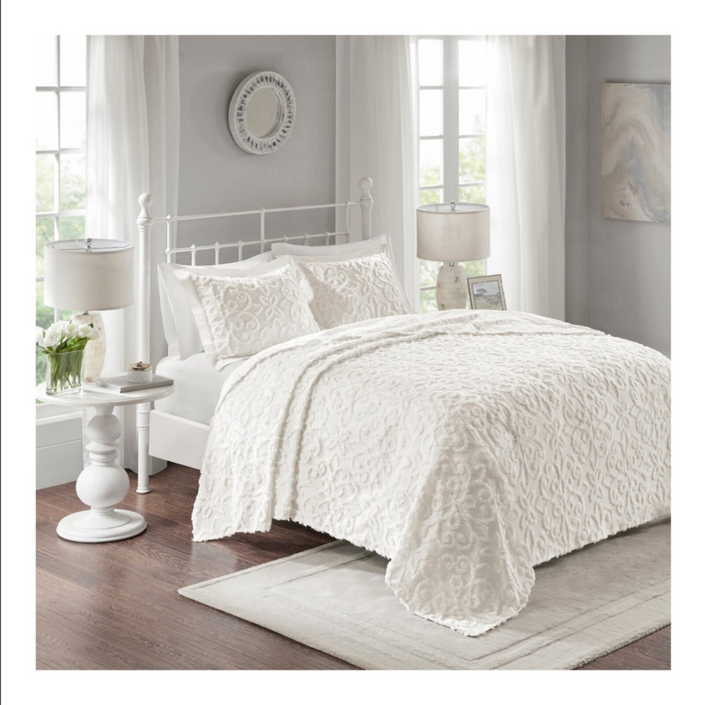 ' Madison Park - Madison Park BEDSPREAD SET Color: White Retail: 150 Description Madison Park White Amber Cotton Chenille Bedspread Set (Full/Queen) New Cotton chenille Oversized Classic design Due to the nature of the chenille fabric, some shedding will occur naturally in the first 3-4 washes Materials: 100% Cotton Shipping to Hawaii, Puerto Rico and Alaska is not free. We offer a 30 days refund policy only if the items sold are found to be incorrectly described. We are not responsible for pictures showing incorrectly on your monitor. The refunds will only be made if the following return guidelines are followed: The item must be returned in all the original packaging, including cartons, boxes and must not have been cleaned or laundered. All returns must be boxed and packed securely for shipping. Refunds are within 30 days from the day the customer received the original item. We will send you a prepaid label to send the item back. If the item is found to be as described you will receive a refund of your winning bid minus shipping both ways and a 20% restocking fee. We may except returns that do not qualify under ou'