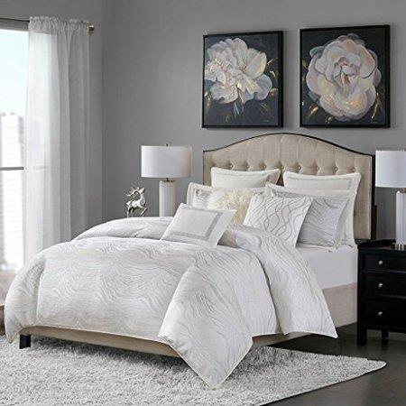 Madison Park White Signature Hollywood Glam King Comforter Set The Madison Park Signature Hollywood Glam Comforter Set offers a modern and elegant update to the bedroom. This jacquard comforter flaunts an all-over metallic detailing on the luxurious white base, for glamorous allure. Coordinating shams mirror the motif of the comforter and the Euro shams feature a rich cotton velvet face with embroidered details. Three decorative pillows are embellished with unique embroidery and texture, adding dimension and glam to this lavish comforter set. The oversized and overfilled comforter uses and includes a removable duvet-style insert that is secured by inner ties and a hidden button closure. This provides no visible bartacking lines on top of the bed to create a smooth, clean face. Dry clean comforter cover only and machine wash comforter filler. This bedding set is OEKO-TEX certified, meaning it does not contain any harmful substances or chemicals, ensuring quality comfort and wellness. Brand: Madison Park Size: King Dimensions: 1 Comforter: 110 inches wide x 96 inches long 2 King Shams: 20 inches wide x 36 inches long with 2 inches depth 3 Decorative Pillows: 20 inches wide x 20 inches long, 20 inches wide x 20 inches long, 14 inches wide x 20 inches long 3 Euro Shams: 26 inches wide x 26 inches long Materials: Comforter/Sham face: 100-percent polyester jacquard with metallic with filled piping around 3 edges Comforter Back: 100-percent polyester micro fiber Standard sham back: 100-percent polyester solid jacquard, removable seperate polyester filler inserts ( 300g/sqm ) Color: White Set includes one (1) comforter, two (2) matching shams, three (3) decorative pillows, and two (2) euro shams (three in king size) Comforter/Sham face: 100-percent polyester jacquard with metallic with filled piping around 3 edges Comforter Back: 100-percent polyester micro fiber Standard sham back: 100-percent polyester solid jacquard, removable seperate polyester filler inserts ( 300g/sqm ) Euro sham: 100-percent cotton velvet with embroidery on face 20x20 inches pillow cover: faux fur pilow 20x20 inches pillow cover: 100-percent polyester jacquard with embrodiery on face 14x20 inches pillow cover: 100-percent cotton velvet with embroidery on face Pillow: hidden zipper with polyester filler Elegant and glamorous, modern/contemporary jacquard comforter set Features an all-over metallic detailing on the luxurious white base Oversized and overfilled comforter with removable insert (included), inner ties, and hidden button closure Duvet style comforter insert, so no visible bartacking lines seen on top of the bed Decorative pillows have removable cover with hidden zipper Hypoallergenic polyester filling in the comforter and pillow (filling contains no allergens and is treated to be dustproof) Madison Park White Signature Hollywood Glam King 8 PC Comforter Set Click images to enlarge Description Madison Park White Signature Hollywood Glam King 8 Pc Comforter Set The Madison Park Signature Hollywood Glam Comforter Set offers a modern and elegant update to the bedroom. This jacquard comforter flaunts an all-over metallic detailing on the luxurious white base, for glamorous allure. Coordinating shams mirror the motif of the comforter and the Euro shams feature a rich cotton velvet face with embroidered details. Three decorative pillows are embellished with unique embroidery and texture, adding dimension and glam to this lavish comforter set. The oversized and overfilled comforter uses and includes a removable duvet-style insert that is secured by inner ties and a hidden button closure. This provides no visible bartacking lines on top of the bed to create a smooth, clean face. Dry clean comforter cover only and machine wash comforter filler. This bedding set is OEKO-TEX certified, meaning it does not contain any harmful substances or chemicals, ensuring quality comfort and wellness. Brand: Madison Park Size: King Dimensions: 1 Comforter: 110 inches wide x 96 inches long 2 King Shams: 20 inches wide x 36 inches long with 2 inches depth 2 Decorative Pillows: 20 inches wide x 20 inches long, 14 inches wide x 20 inches long 3 Euro Shams: 26 inches wide x 26 inches long Materials: Comforter/Sham face: 100-percent polyester jacquard with metallic with filled piping around 3 edges Comforter Back: 100-percent polyester micro fiber Standard sham back: 100-percent polyester solid jacquard, removable seperate polyester filler inserts ( 300g/sqm ) Color: White Set includes one (1) comforter, two (2) matching shams, three (3) decorative pillows, and two (2) euro shams (three in king size) Comforter/Sham face: 100-percent polyester jacquard with metallic with filled piping around 3 edges Comforter Back: 100-percent polyester micro fiber Standard sham back: 100-percent polyester solid jacquard, removable seperate polyester filler inserts ( 300g/sqm ) Euro sham: 100-percent cotton velvet with embroidery on face 20x20 inches pillow cover: faux fur pilow 20x20 inches pillow cover: 100-percent polyester jacquard with embrodiery on face 14x20 inches pillow cover: 100-percent cotton velvet with embroidery on face Pillow: hidden zipper with polyester filler Elegant and glamorous, modern/contemporary jacquard comforter set Features an all-over metallic detailing on the luxurious white base Oversized and overfilled comforter with removable insert (included), inner ties, and hidden button closure Duvet style comforter insert, so no visible bartacking lines seen on top of the bed Decorative pillows have removable cover with hidden zipper Hypoallergenic polyester filling in the comforter and pillow (filling contains no allergens and is treated to be dustproof) Combined Shipping We charge full shipping & handling on the item with the highest shipping rate. Each additional items shipping & handling rate will be discounted 50% off. Please insert all items in the cart to show all applicable discounts. Items must be paid together to receive full disc