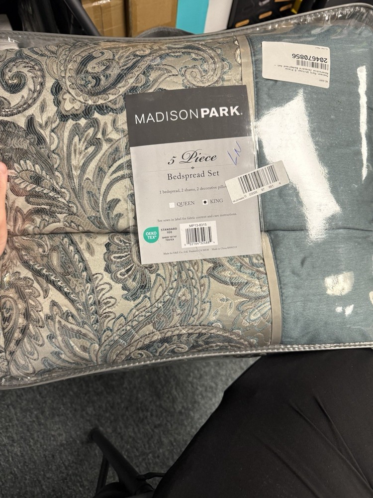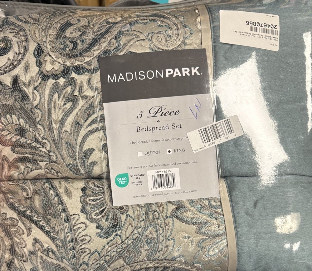The Madison Park Whitman 5 PC Reversible Jacquard Bedspread Set in KING size is a luxurious addition to any adult's bedroom. Featuring a paisley pattern with a quilted stitch design, this bedspread is made from high-quality jacquard polyester, providing warmth and comfort for all seasons. The rectangular shape and below 150 GSM make it lightweight and breathable, while the machine wash care instructions ensure easy maintenance. The elegant paisley design and quilted features add a touch of luxury to the room, creating a cozy and stylish sleeping space.
