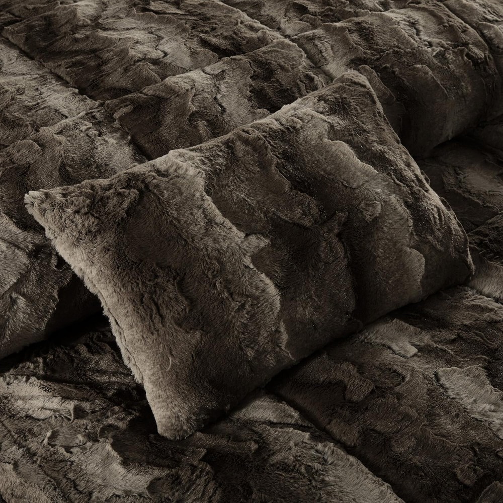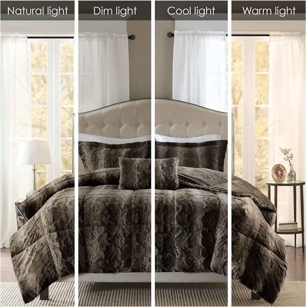 Faux Fur Ultra soft and cozy Plush Faux Fur fabric, looks luxury and keeps you snuggly warm With special dye technic, color in different layer and depth, makes the product unique Light weight, perfect for all season use and great for your bedroom, or guest room Set include: 1 Comforter: 104"W x 90"L, 2 King Shams: 20"W x 36"L + 2"D, 1 Decorative Pillow: 14"W x 20"L Machine wash cold, gentle cycle and separately. Do not bleach, tumble dry low. Remove promptly. Do not iron