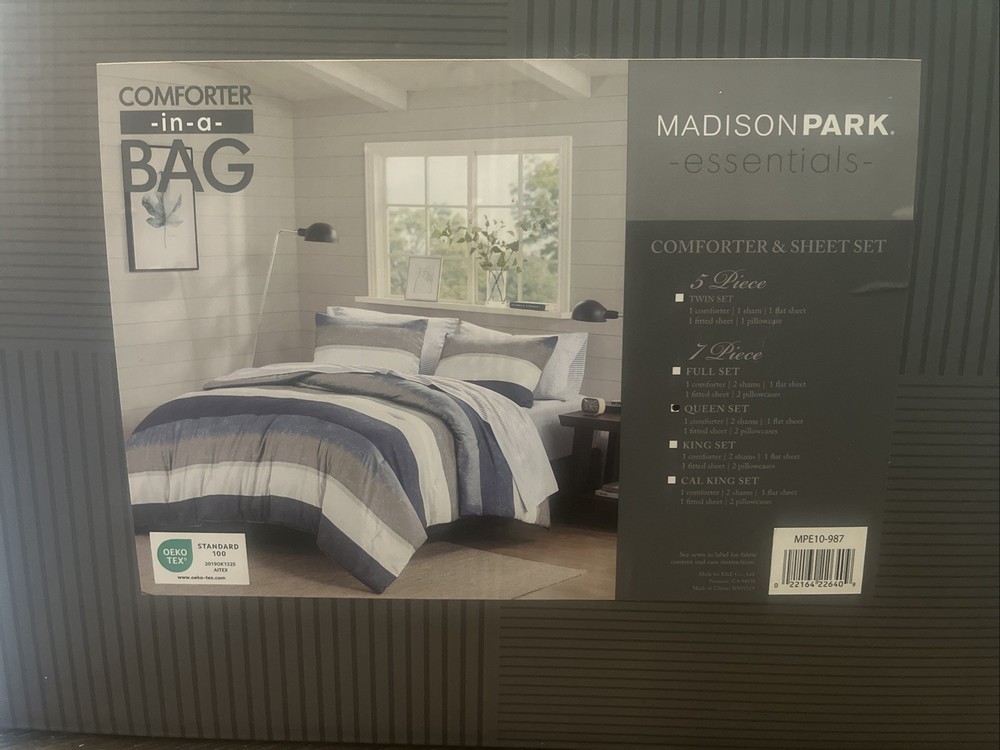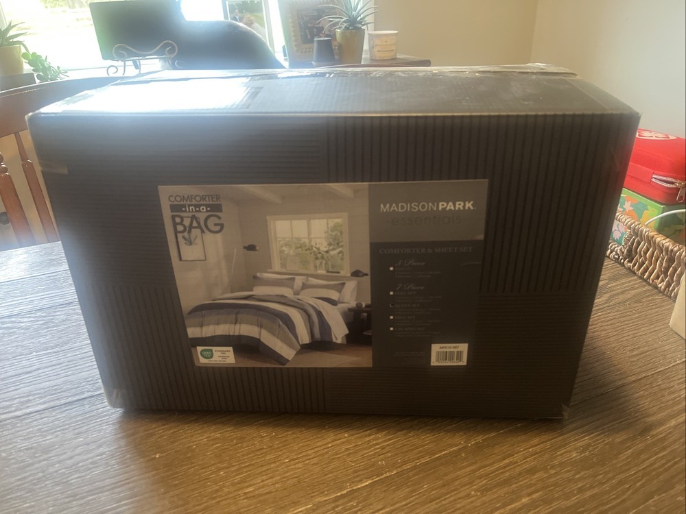 *New In Box* Madison Park Essentials - Blue, gray, white striped comforter set