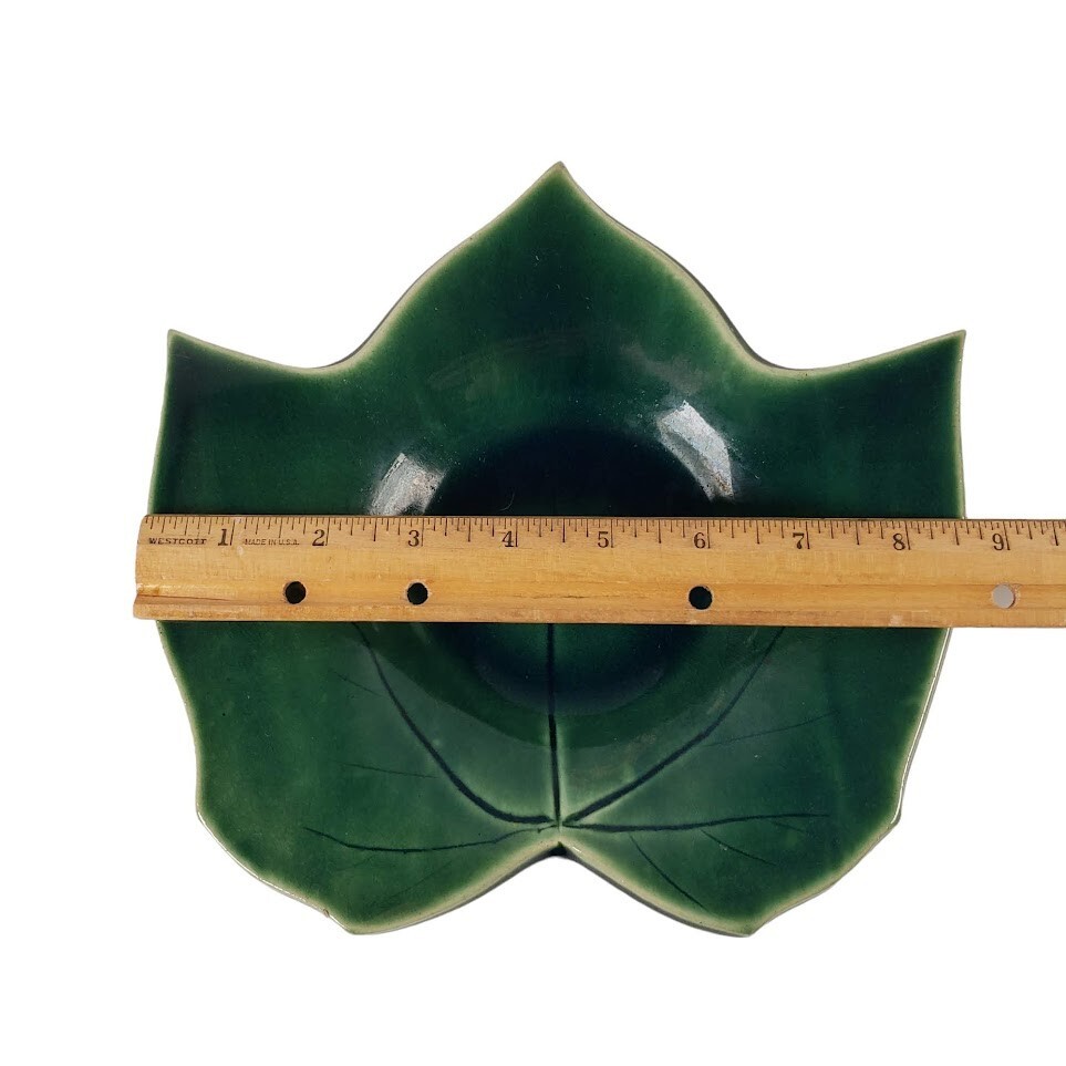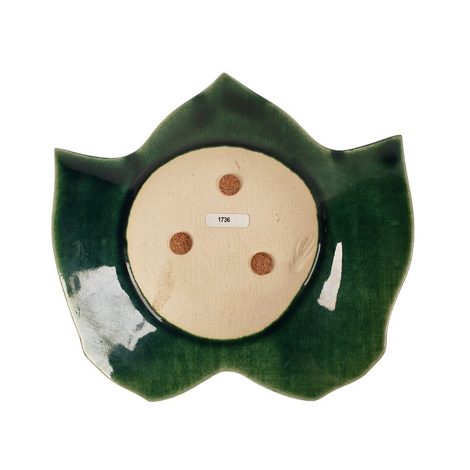 Vintage Studio Art Pottery Dish - Leaf Shape Mid century modern Incised back stamp - paw print Paper sticker "1736" 8 3/4" across widest points Glazed upper Unglazed base Artist unknown Condition - No cracks or chips. Age-related crazing. Item in hand. All photos taken by me. Selling as shown in photos and as described.