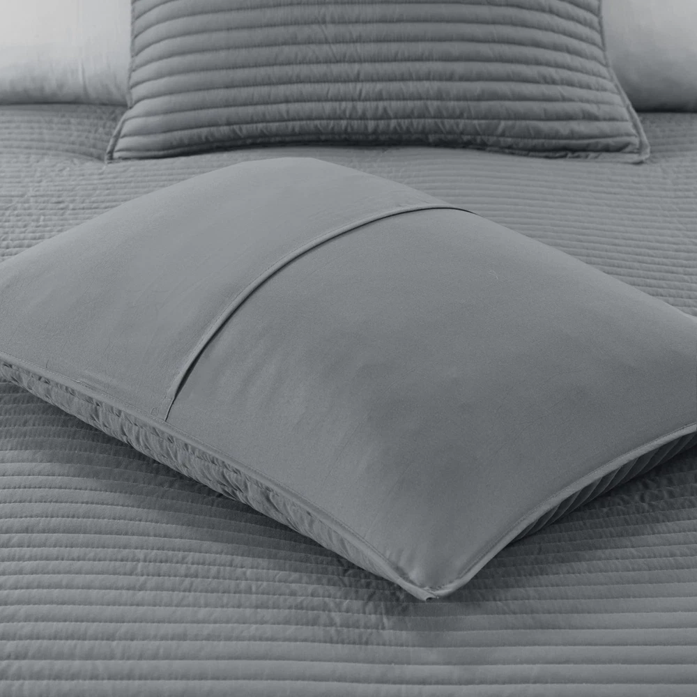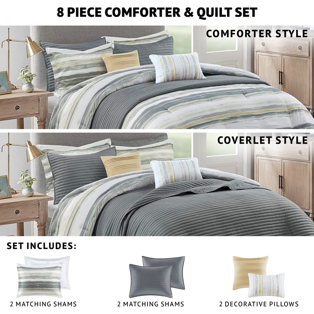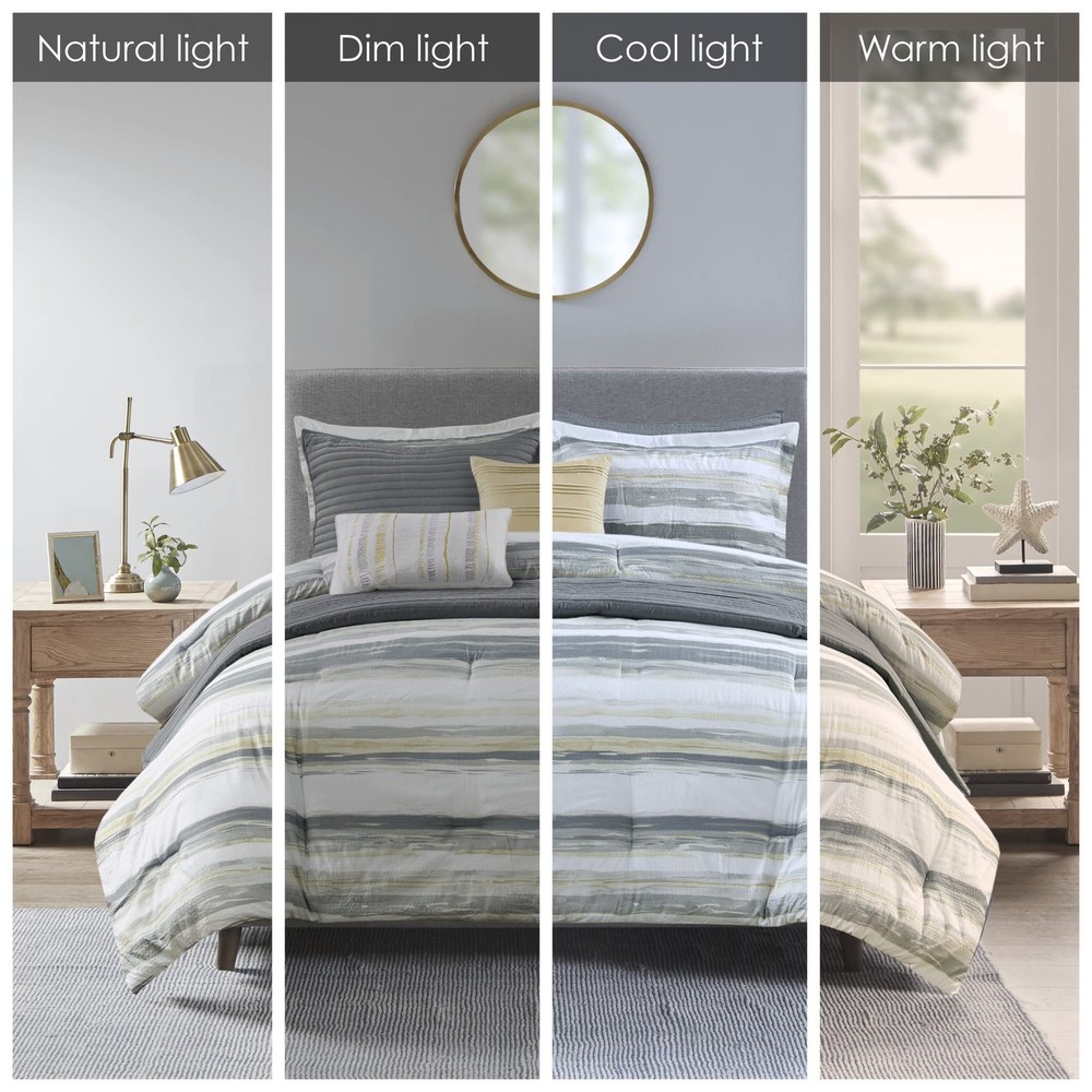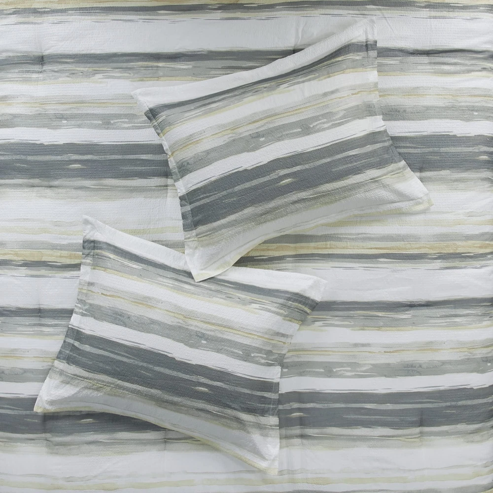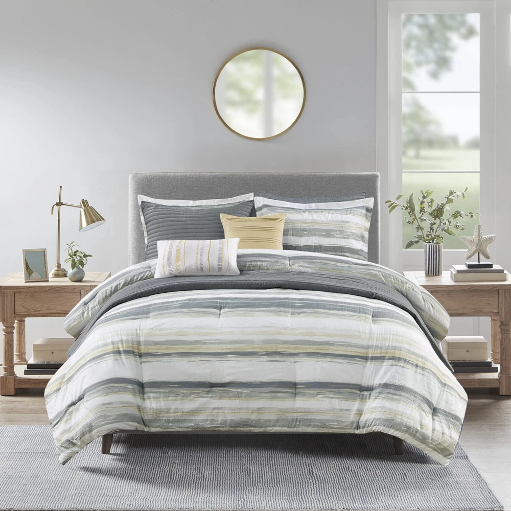 The textured seersucker comforter features a watercolor stripe print in yellow and white hues for a serene look The included coverlet features channel stitch quilting pattern. Two shams mirror the design on the face of the comforter Microfiber fabric is a really soft fabric that is naturally wrinkle and shrinkage resistant. Set include: 1 Comforter: 90"W x 90"L, 2 Standard Shams:20"W x 26 "L + 1.5" D (2), 1 Decorative Pillow: 16"W x 16"L, 1 Decorative Pillow: 12"W x 18"L, 1 Coverlet: 90"W x 90"L, 2 Standard Quilted Shams: 20"W x 26"L Care instructions: Machine washable, pillow spot clean