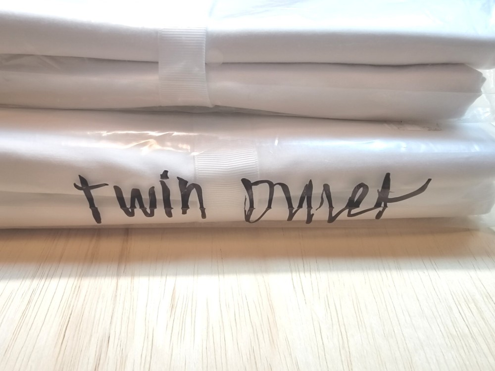 New Mark & Graham (a Pottery Barn company) Twin Duvet Cover, White, NWOT 100% Cotton. This duvet cover is still in plastic but lacks a tag. Plastic may have writing on end "twin duvet" for organization purposes. (As you can see in the second picture, one has writing and one does not).