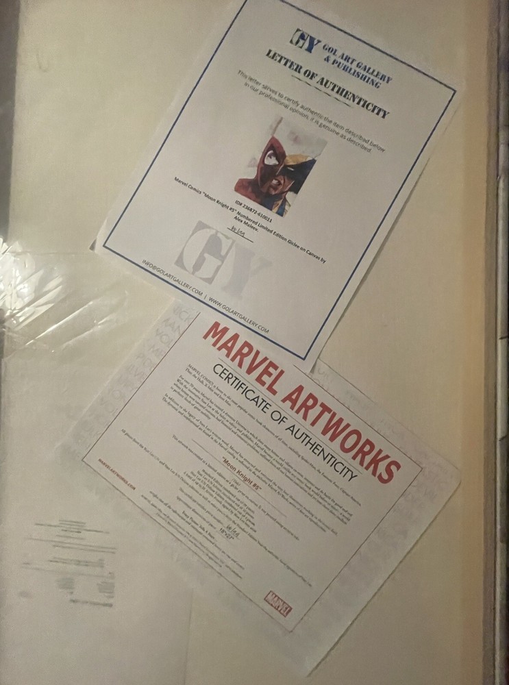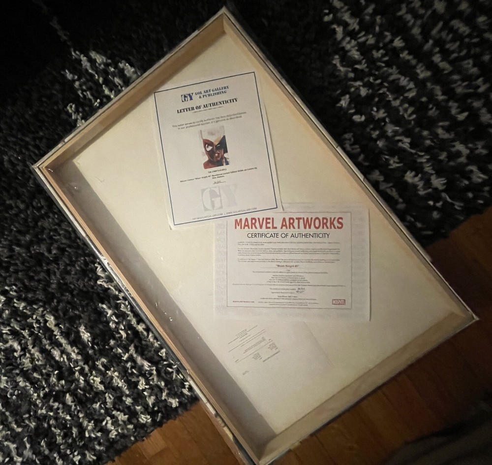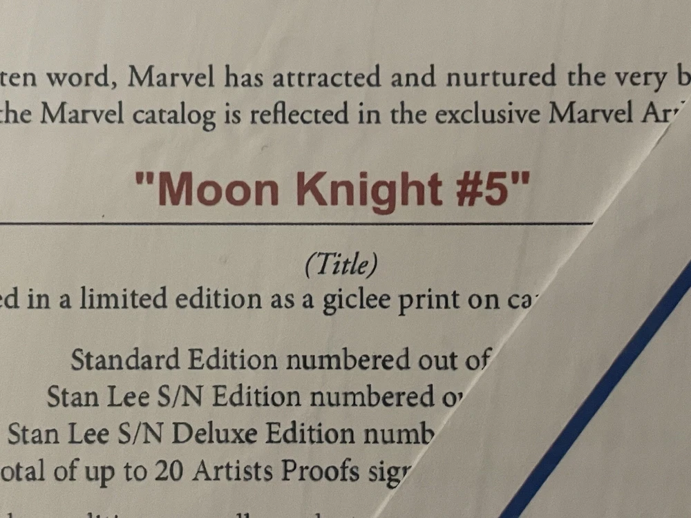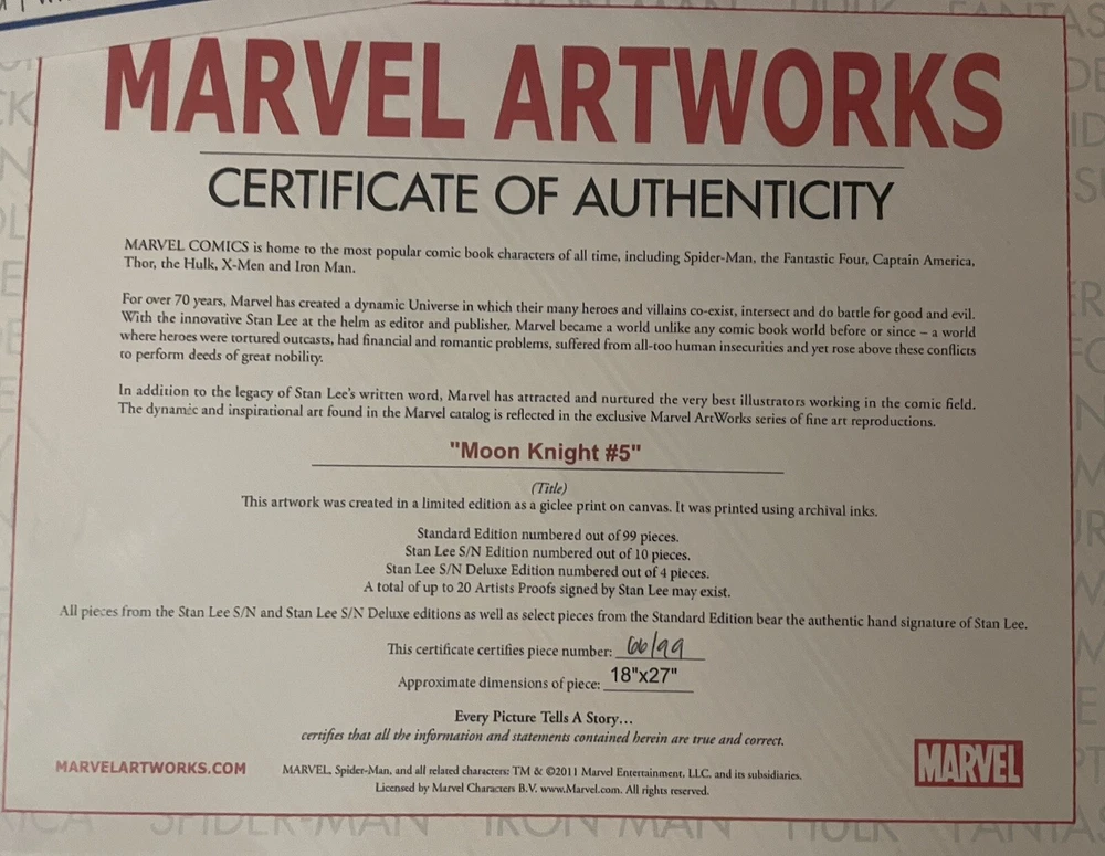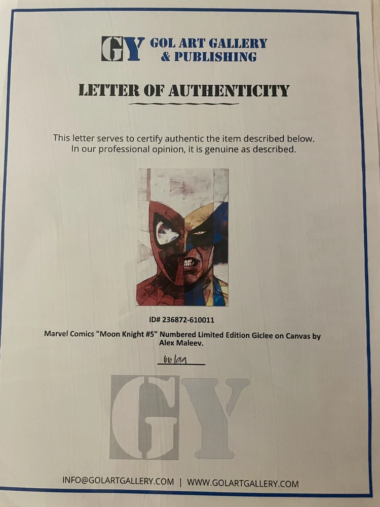 Wrapped in a protective plastic safety bag. “MOON KNIGHT #5” - RARE VERY LIMITED EDITION OUT OF ONLY 99 CERTIFICATE OF AUTHENTICATION (Marvel) INCLUDED. This is the REAL DEAL, not some copy sellers are trying to pass off as “real.” This has a protective covering, as you can see in the photos. WOLVERINE (in his iconic yellow suit, as seen in the feature film “Wolverine and. Deadpool). This artwork was created in a limited edition in 2011 as a giclee print on canvas. It was printed using archival inks. Marvel Comics "Moon Knight #5" Numbered Limited Edition Giclee on Canvas by Alex Maleev. Only 99 were made, this item is #66/99 This artwork was created in a limited edition as a giclee print on canvas. It was printed using archival inks. - Beautiful RARE art print of Moon Knight #5 - Artist: Alex Maleev - Licensed by Marvel Characters B.V. www.Marvel.com. All rights reserved. - Released: ©2011 Marvel Entertainment, LLC. - Size: 18" x 27” - Condition: Mint Condition - Giclée on Canvas - Comes with TWO Certificates of Authenticity All pieces from the Stan Lee S/N and Stan Lee S/N Deluxe editions as well as select pieces from the Standard Edition bear the authentic hand signature of Stan Lee. MARVEL COMICS is home ro the most popular comic book characters of all time, including Spider-Man, the Fantastic Four, Captain America, Thor, the Hulk, X-Men and Iron Man. For over 70 years, Marvel has created a dynamic Universe in which their many heroes and villains co-exist, intersect and do battle for good and evil. With the innovative Stan Lee at the helm as editor and publisher, Marvel became a world unlike any comic book world before or since - a world where heroes were tortured outcasts, had financial and romantic problems, suffered from all-too human insecurities and yet rose above these conflicts to perform deeds of great nobility. In addition to the legacy of Stan Lee's written word, Marvel has attracted and nurtured the very best illustrators working in the comic field. The dynaméc and inspirational art found in the Marvel catalog is reflected in the exclusive Marvel ArtWorks series of fine art reproductions.