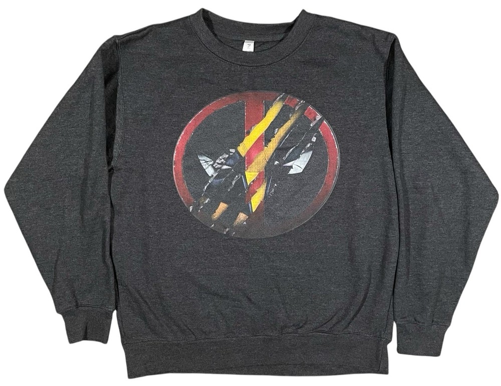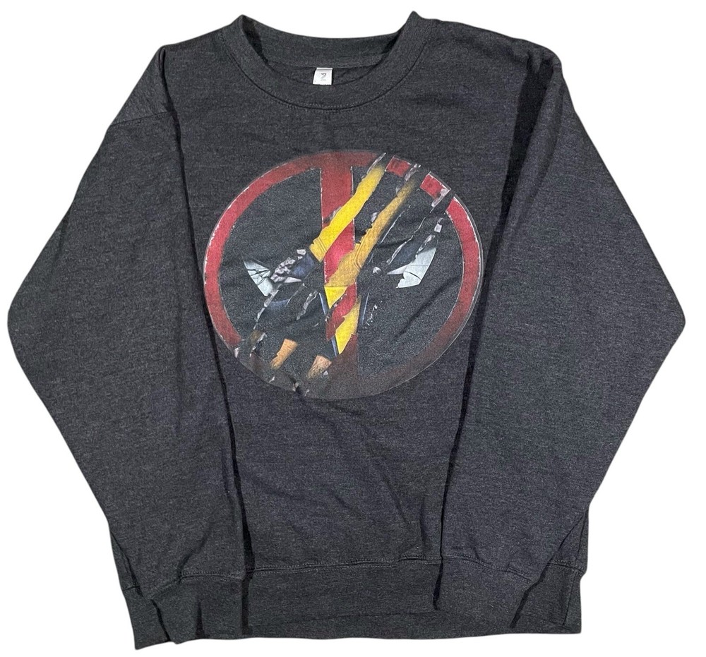 This is a Marvel Deadpool and Wolverine logo pullover sweatshirt in adult medium size. It features a graphic print of the two characters, a round neck, long sleeves, and a pullover closure. Made of polyester, cotton, and cotton blend knit fabric with a logo accent. The hoodie is machine washable, making it easy to care for. It is suitable for both men and women, with a regular fit, and is themed around movies and comics. Great for all seasons and activities.