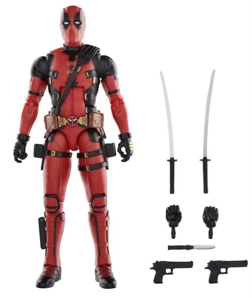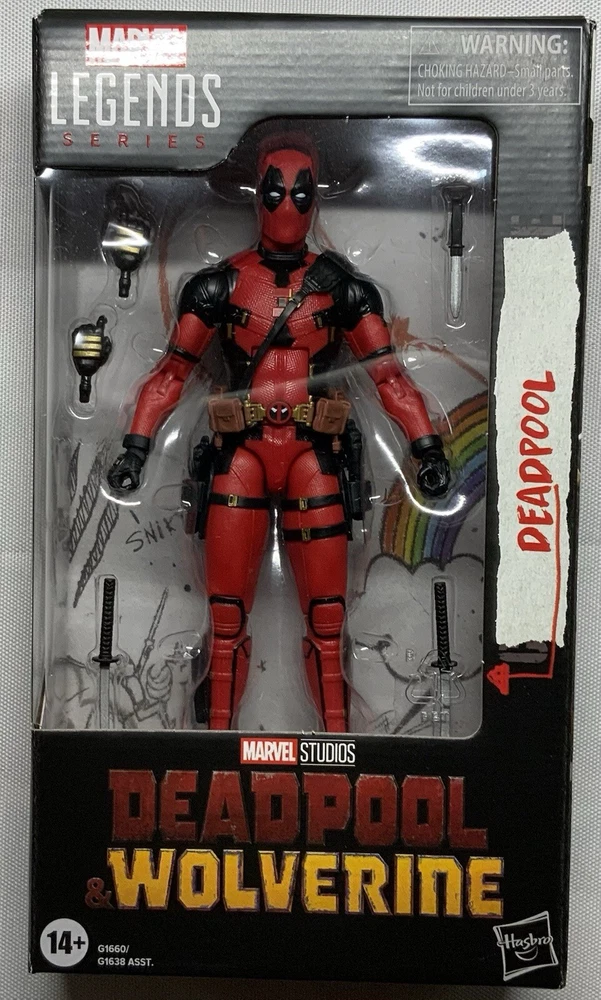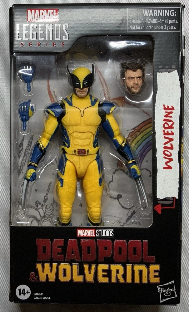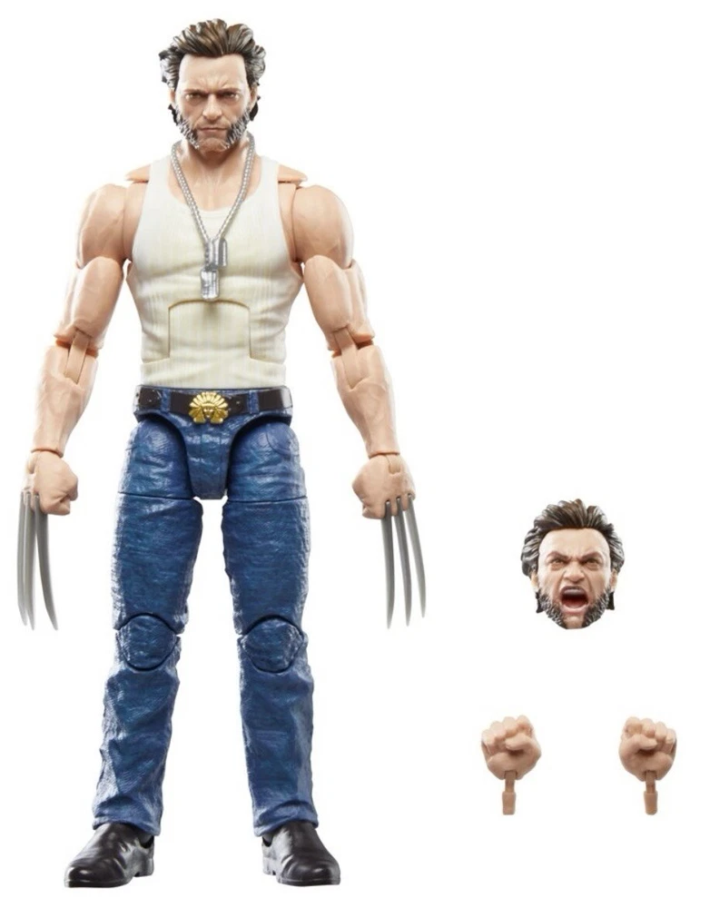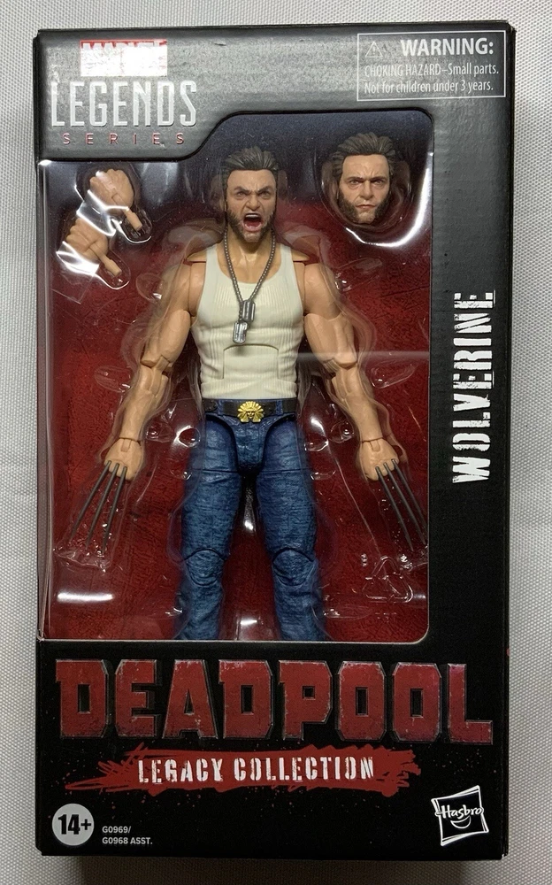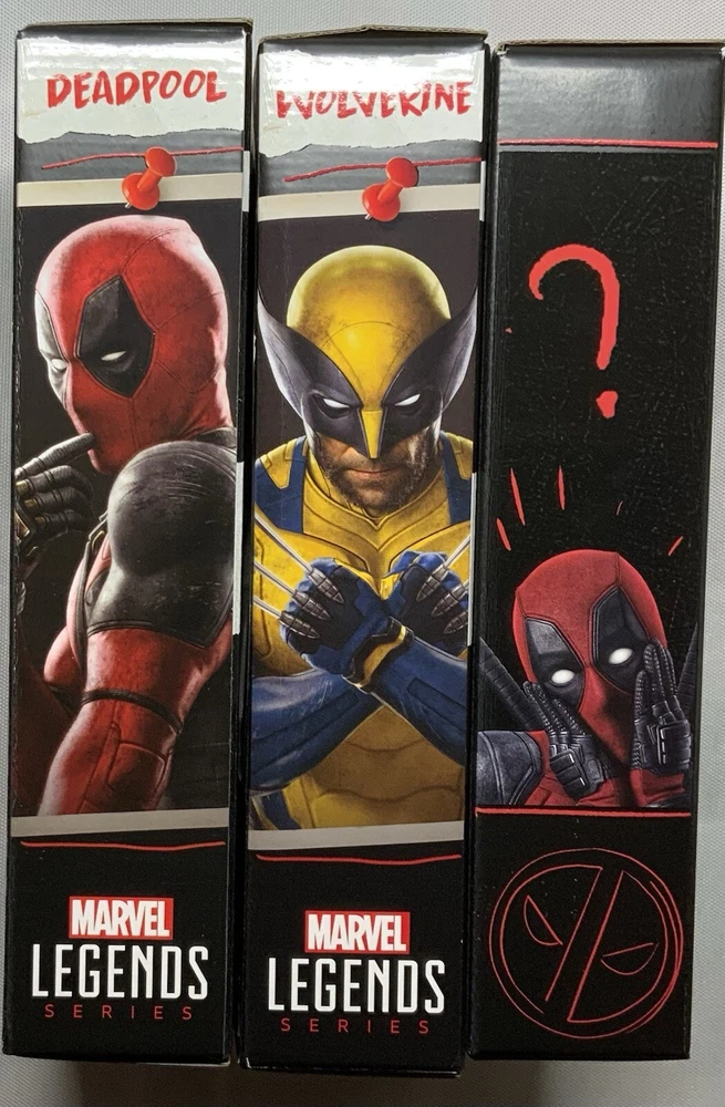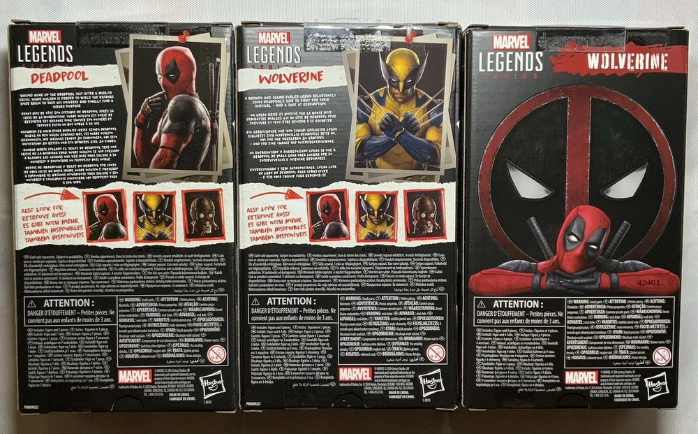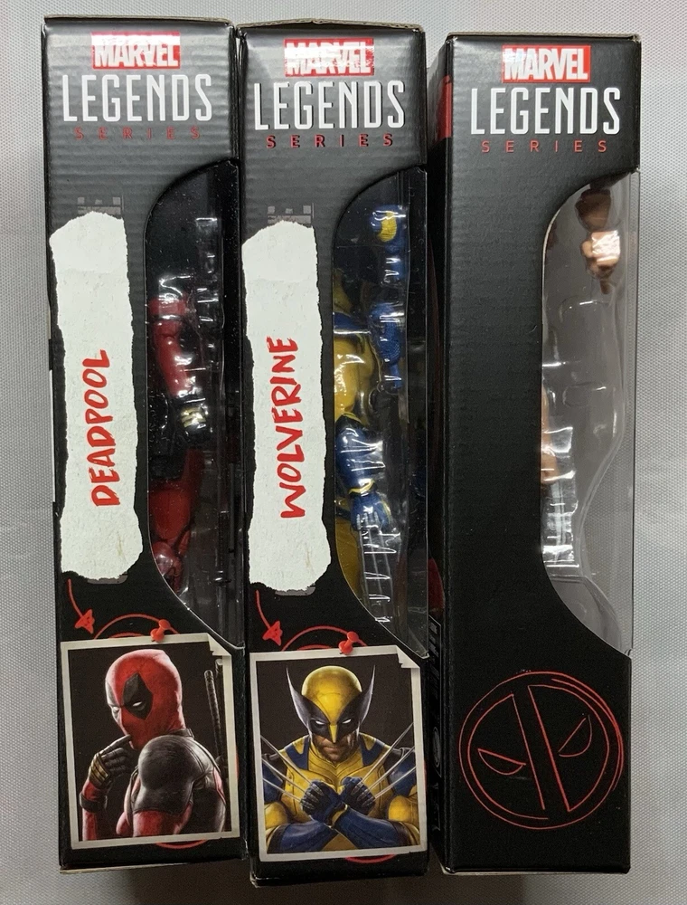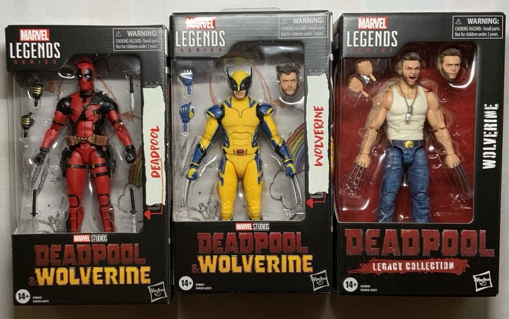 Deadpool & Wolverine Marvel Legends (3 pack) 1) Deadpool (Version 2) 6-Inch Action Figure: Having hung up the Deadpool suit after a midlife crisis, Wade Wilson is forced to wield the katanas once again to save his universe and finally find a higher purpose - bothering Wolverine. This super-articulated 6-inch action figure includes alternate hands. a knife, 2 pistols, and 2 swords. 2) Wolverine (Yellow and Blue) 6-Inch Action Figure: A broken and shame-fueled Logan reluctantly joins Deadpool’s side to fight for their survival -- and a shot at redemption. Will they get along in the city? This figure not only features a stunning Hugh Jackman likeness, but sports an alternate masked head along with clawed and de-clawed hands. 3) Wolverine (Logan) 6-Inch Action Figure: Complete with alternate head and hands, the Deadpool Legacy Collection Marvel Legends Wolverine 6-Inch Action Figure is ready to bring a berserker barrage to fans ages 4 and up. Complete with an amazing movie-inspired Wolverine head sculpt.