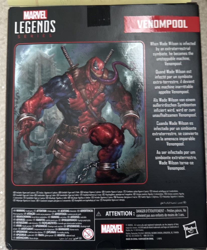 This Marvel Legends Series action figure features Venompool, a character from the Deadpool movie and TV show Spider-Man. The figure is made of ABS plastic and is 1:12 in scale. It comes in multicolor and is an original licensed reproduction. The figure is part of the Legends Series and is a Target exclusive. It is new and in hand, ready to be added to your collection.