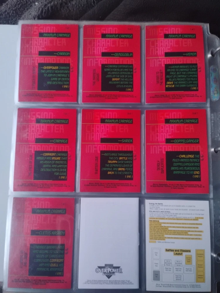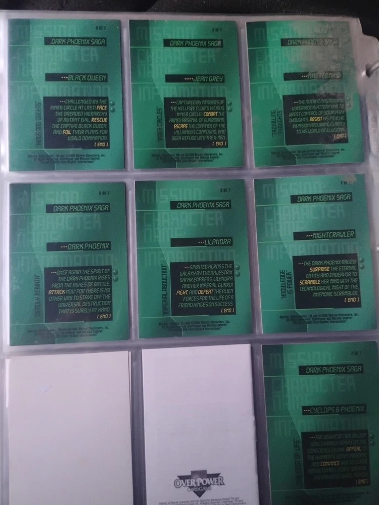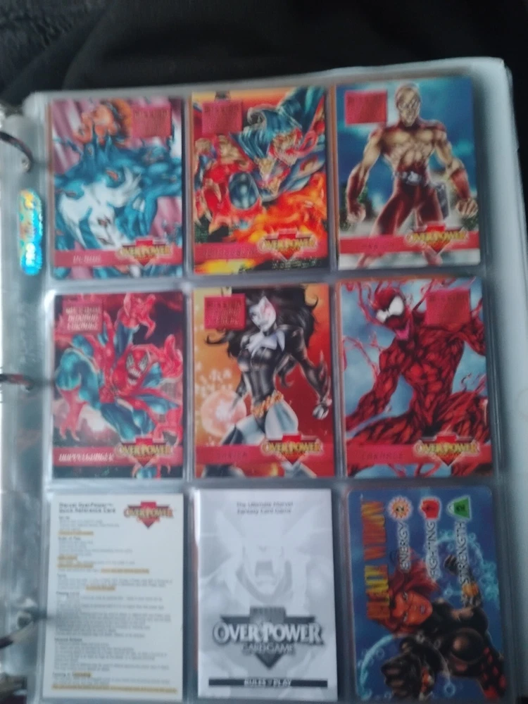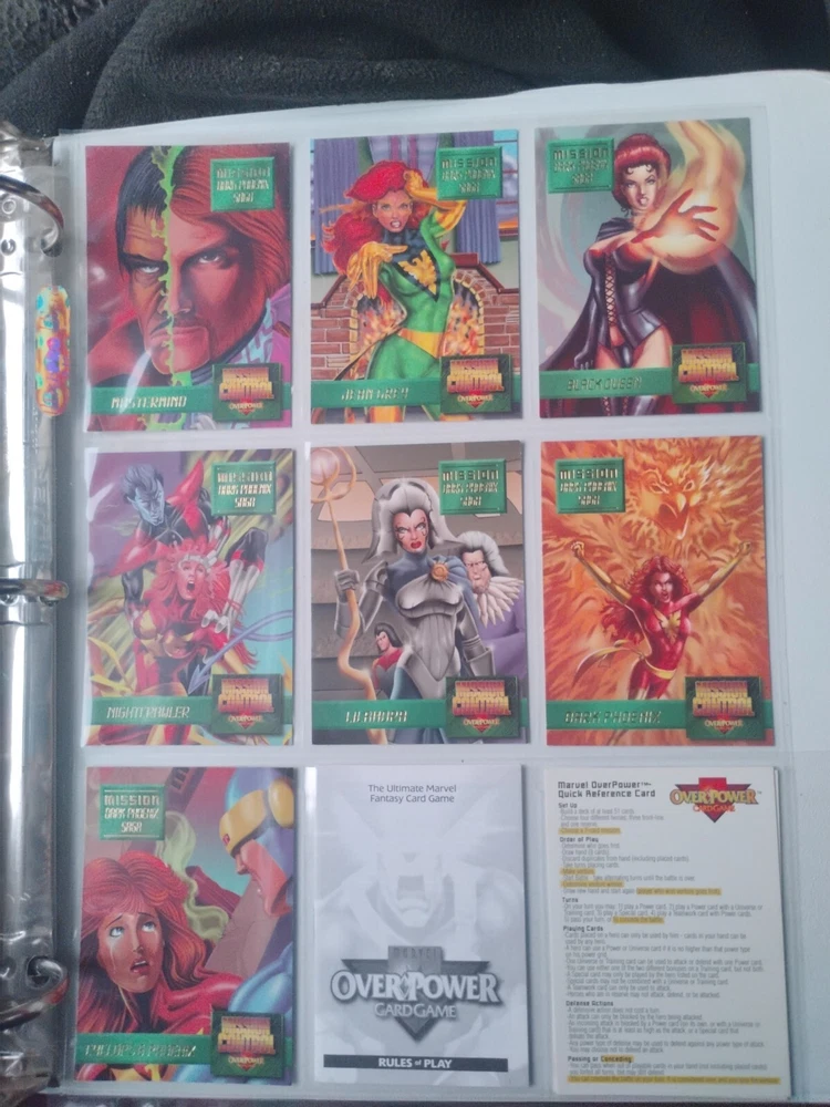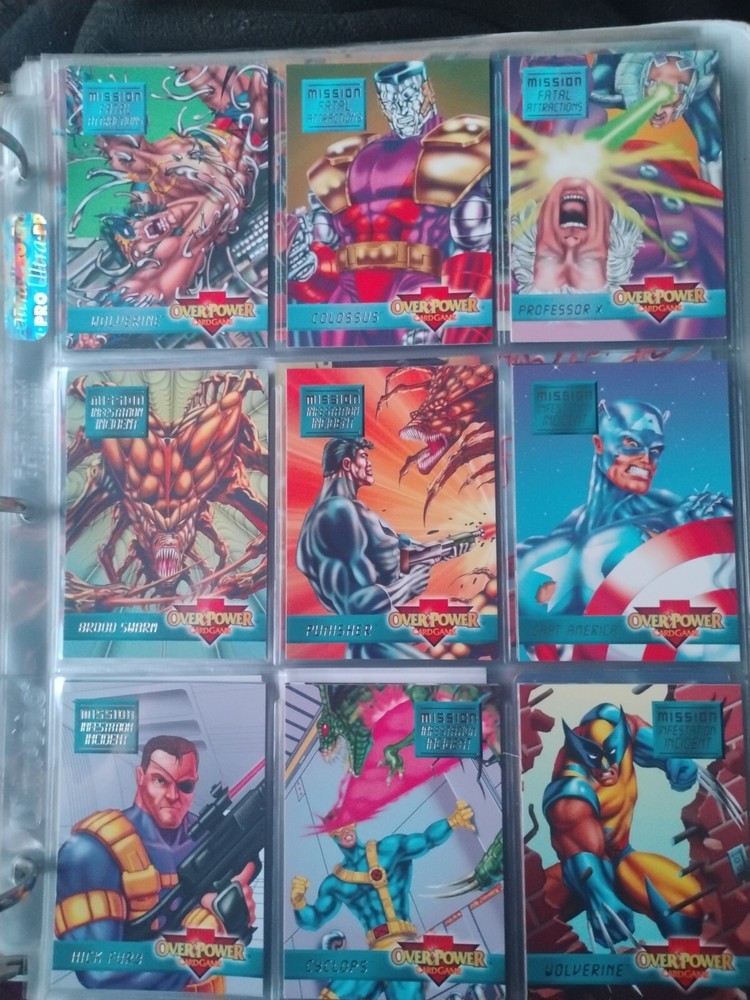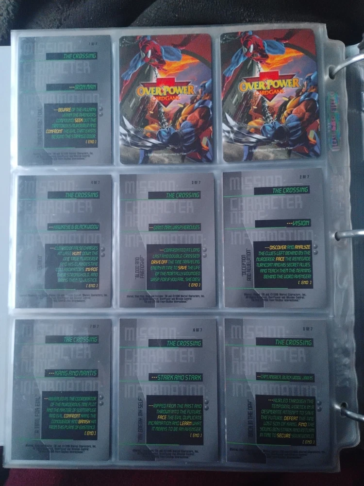 The Marvel Overpower Complete Set is a collection of non-sport trading cards card game featuring characters from the Marvel universe. These cards are a complete trading card set that allows fans to collect and trade their favorite heroes and villains. This set is complete and in a binder with card pages. Comes with all character cards, action cards, teamwork cards, mission cards, and instruction manual. Also included is the complete Overpower Mission Control set with added characters and missions. All cards in in mint/near mint condition. This is like Magic: the Gathering for Marvel fans.