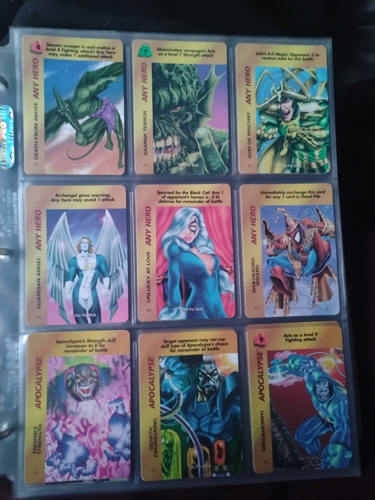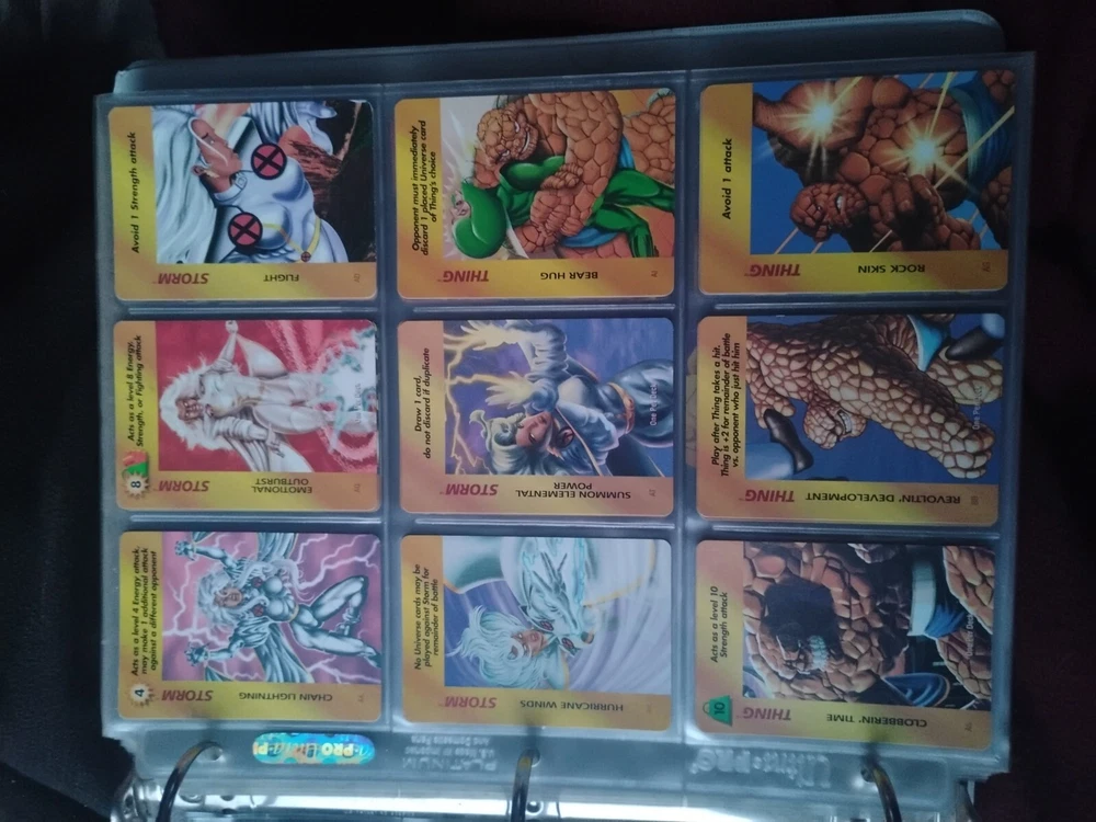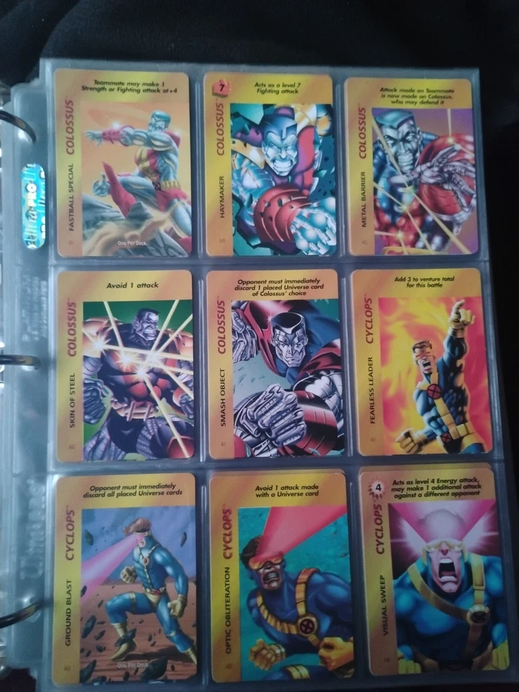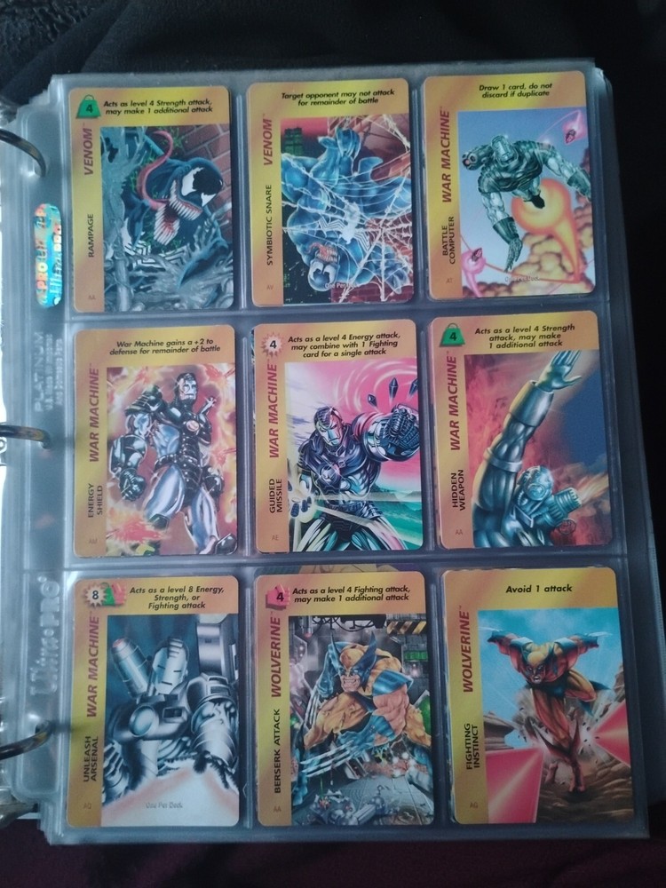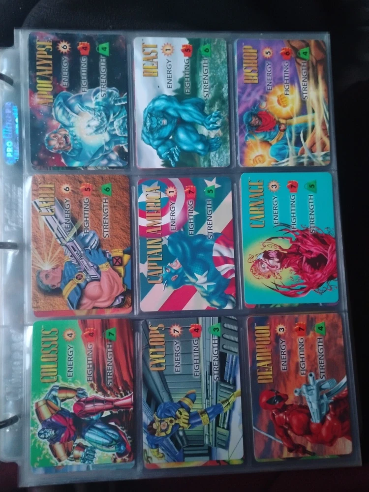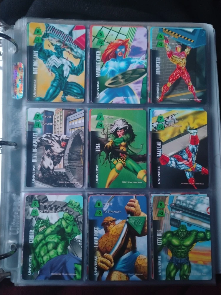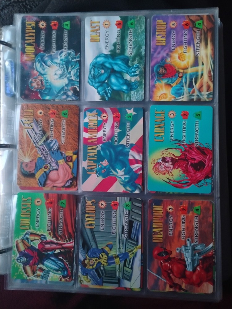 The Marvel Overpower Complete Set is a collection of non-sport trading cards card game featuring characters from the Marvel universe. These cards are a complete trading card set that allows fans to collect and trade their favorite heroes and villains. This set is complete and in a binder with card pages. Comes with all character cards, action cards, teamwork cards, mission cards, and instruction manual. Also included is the complete Overpower Mission Control set with added characters and missions. All cards in in mint/near mint condition. This is like Magic: the Gathering for Marvel fans.