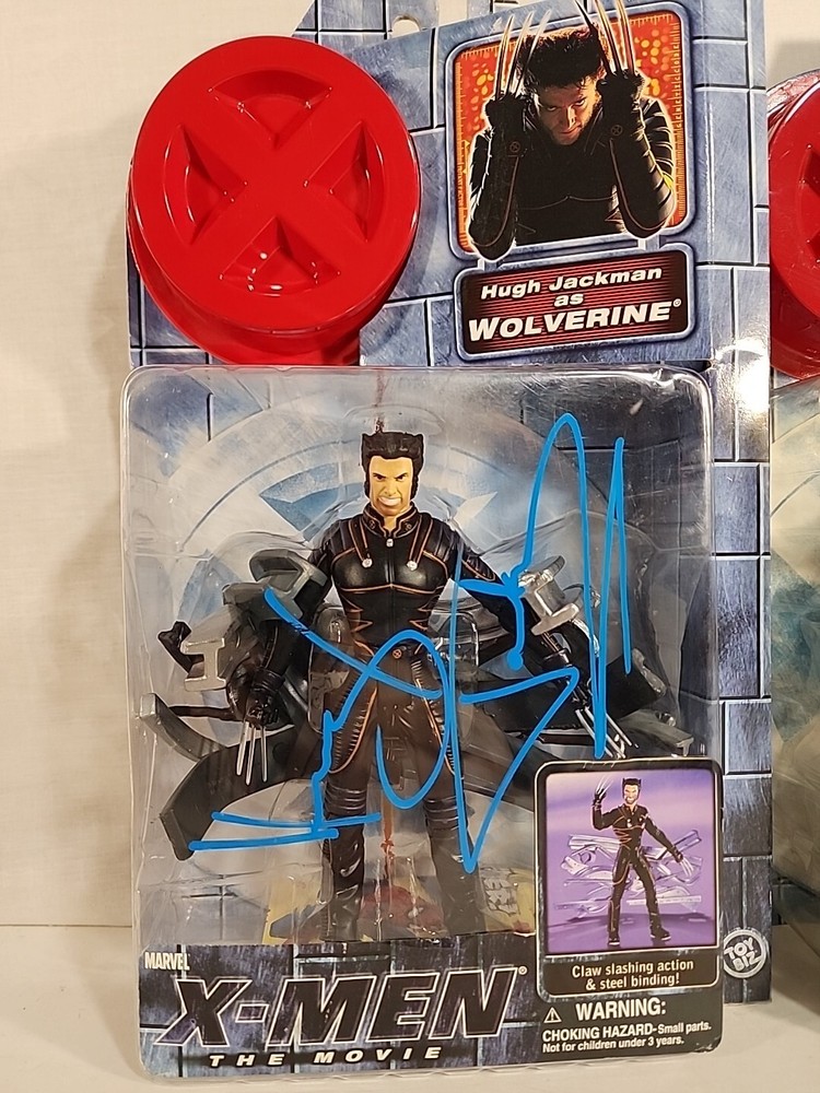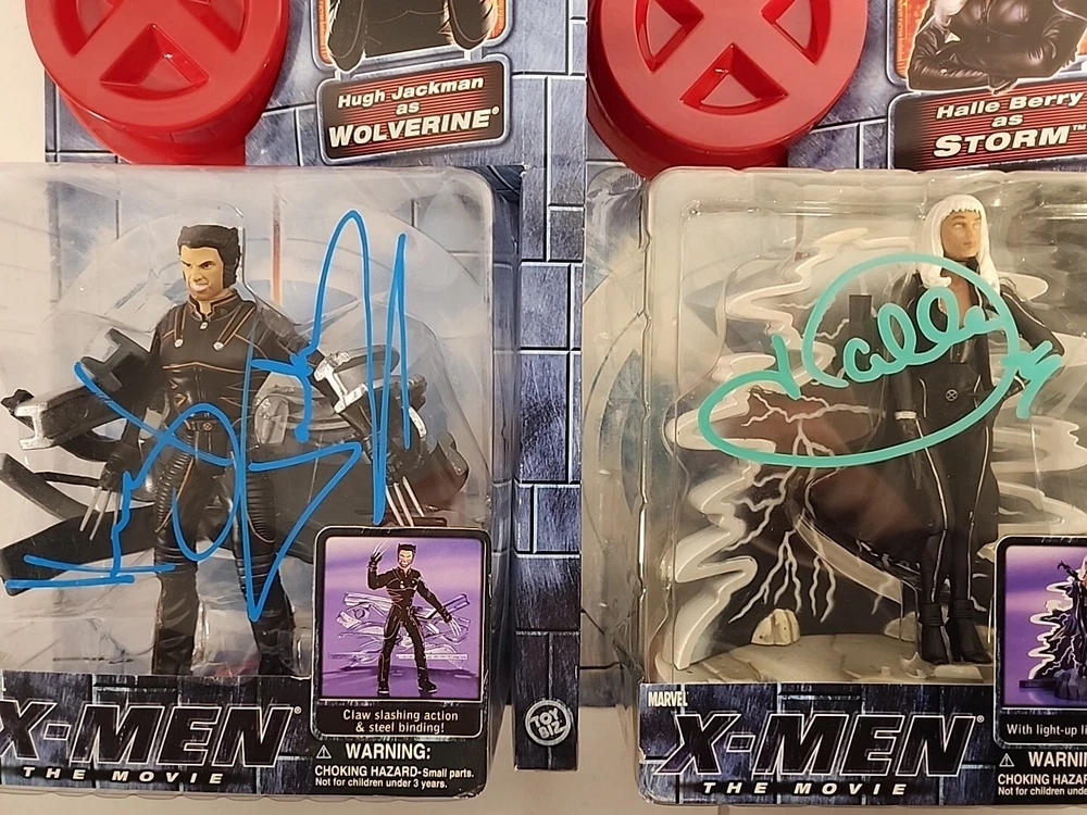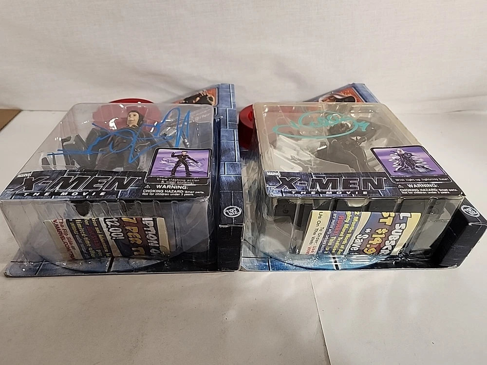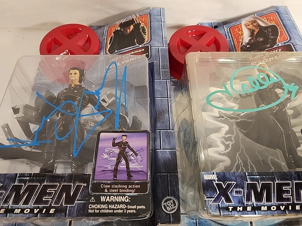 These figures were hand signed in person from a convention. Because of that there is no COA and are not officially authenticated by a professional. The storm plastic is yellowing, but the signature still looks great. The Hugh Jackman signature has a couple of scuffs. Both boxes show signs of wear and are scuffed. Please see pictures.